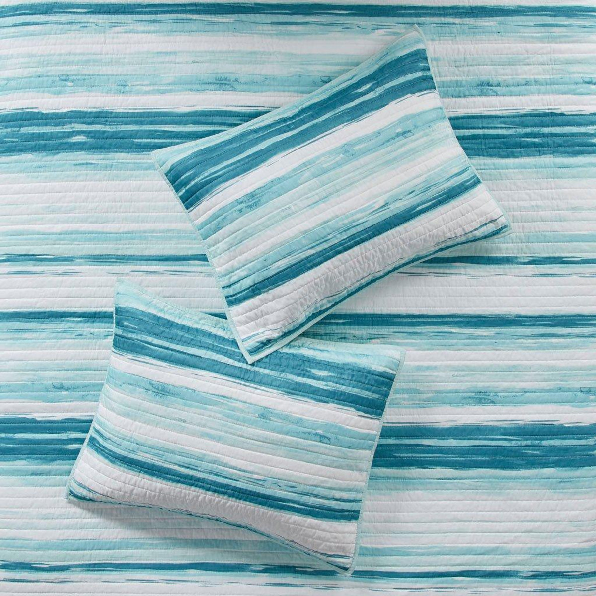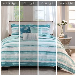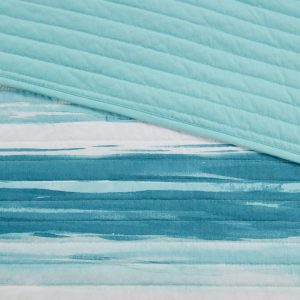 Transform your bedroom into a serene coastal retreat with the Madison Park Marina 6 Piece Reversible Quilt Set. Featuring a modern watercolor stripe in storm blue, aqua, teal, and pastel hues, this bedding set evokes ocean tranquility. Embroidered seashell pillows and textured accents complete the beach-inspired look. Perfect for coastal décor lovers. Machine washable for easy care.