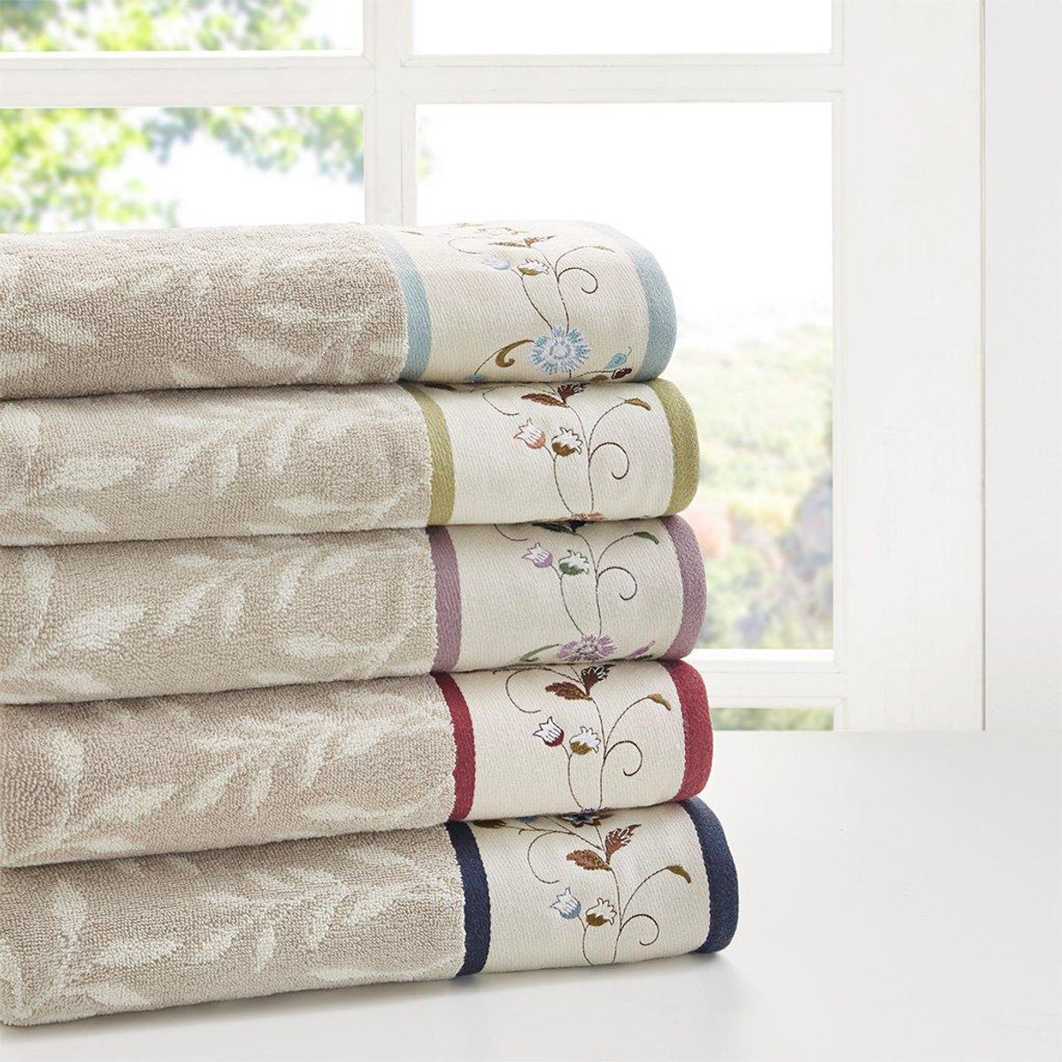 Elevate your bath with the Madison Park Serene 6-Piece Towel Set. Crafted from soft cotton, each towel features jacquard leaf patterns, floral embroidery, and contrast piping for a refined, spa-like look. OEKO-TEX certified for safe, luxurious comfort. Machine wash for easy care.