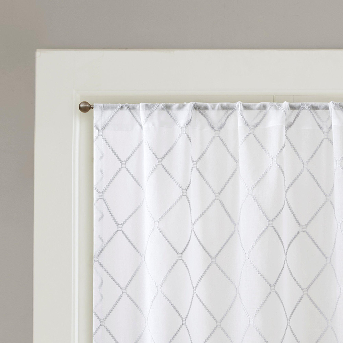 Madison Park’s Irina Diamond Sheer Window Curtain provides an alluring update to your home. An elegant diamond pattern is beautifully embroidered on a soft sheer fabric, adding grace and charm to your décor. The neutral colors and light fabric helps create a delicate look to soften any room. Hang this sheer window curtain using the rod pocket for a simple finish. Fits up to a 1.25 diameter rod.