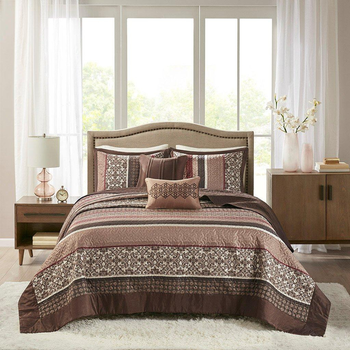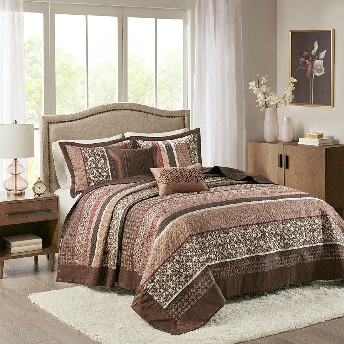 Elevate your bedroom with the Madison Park Princeton 5-Piece Reversible Jacquard Bedspread Set. Featuring rich leaf, stripe, and medallion motifs in chocolate brown, red, and ivory, this luxurious set adds warmth and elegance. The soft polyester jacquard and reversible design offer versatile style and year-round comfort.