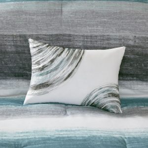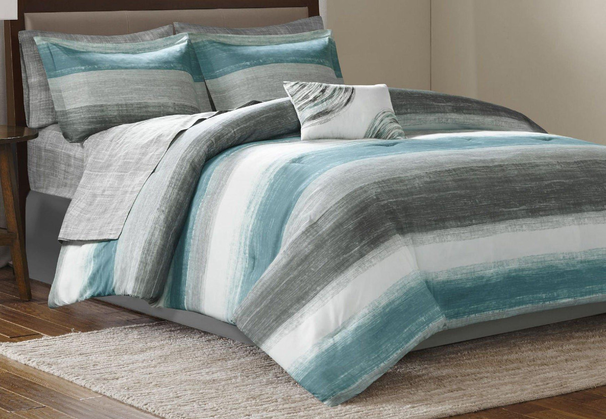 The Madison Park Saben Comforter Set creates a casual and modern update to your bedroom. A printed watercolor stripe motif, in aqua, grey, and white hues, is beautifully displayed on the ultra-soft microfiber comforter. The coordinating shams complement the pattern seen on top of the bed to pull the ensemble together. Set includes one comforter, two pillow shams (one for twin), two pillowcases (one for twin), bed skirt with 15” drop, one fitted sheet, one flat sheet, and one decorative pillow.