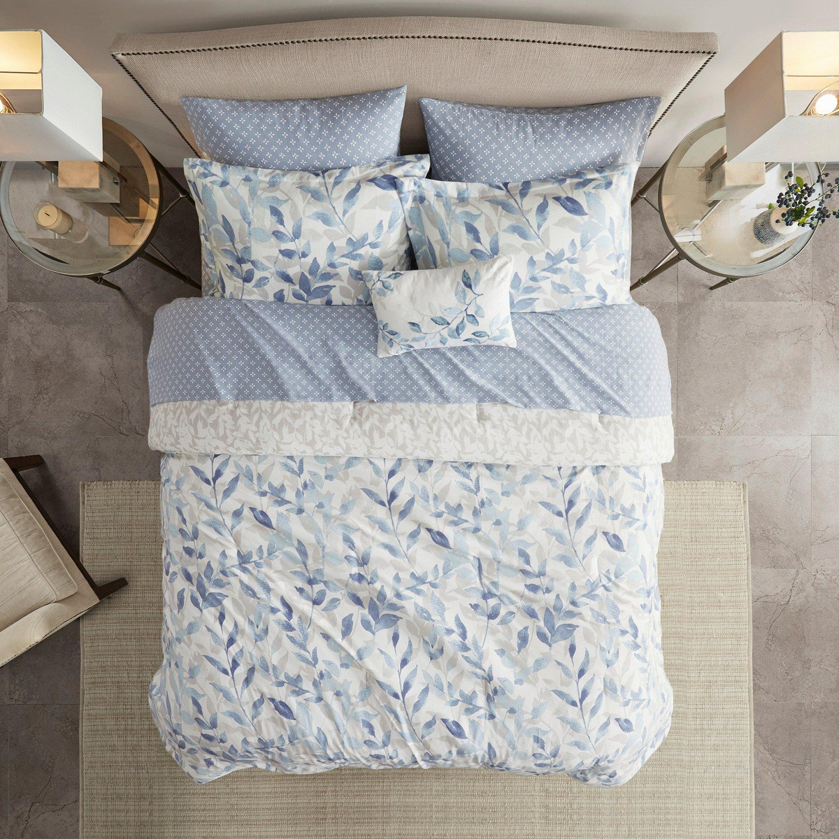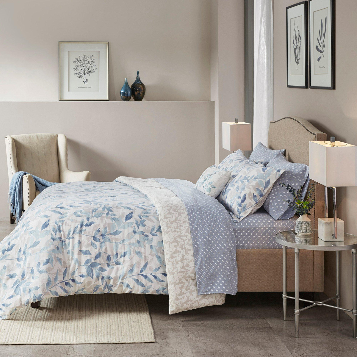 Soft brushed microfiber print comforter and shams, 6oz/sqyd poly fill; 100% polyester micro fiber sheetsSet includes: 1 Comforter, 2 Shams (1 for Twin), 1 Flat Sheet, 1 Fitted Sheet, 2 Pillowcases (1 for Twin) and 1 Decorative Pillow