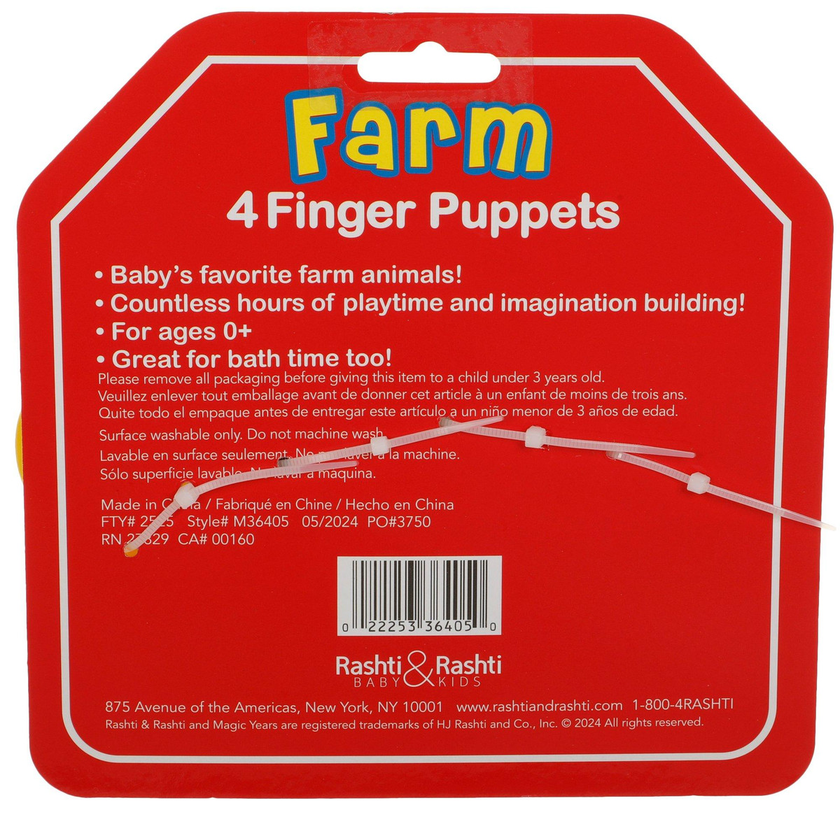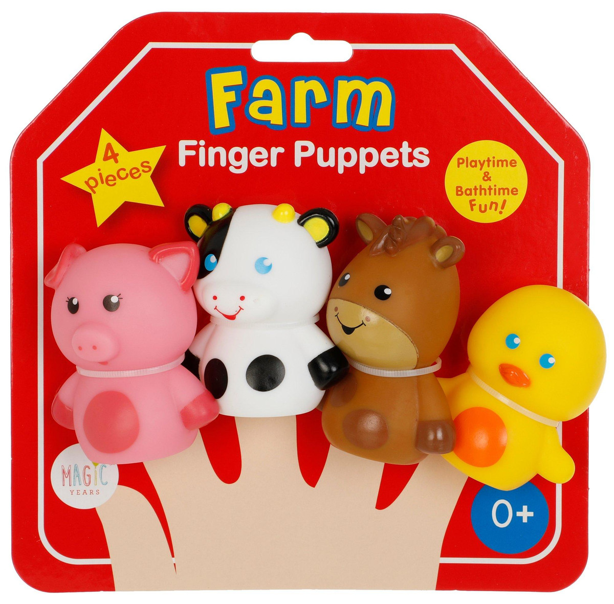 These five playful farm animal finger puppets will entertain babies and kids while promoting interactive play. The set helps teach counting and animal names. The characters include 1 pig, 1 cow, 1 horse, and 1 duck. The washable friends are great for fun in and out of the bath. The large size is appropriate for all ages.