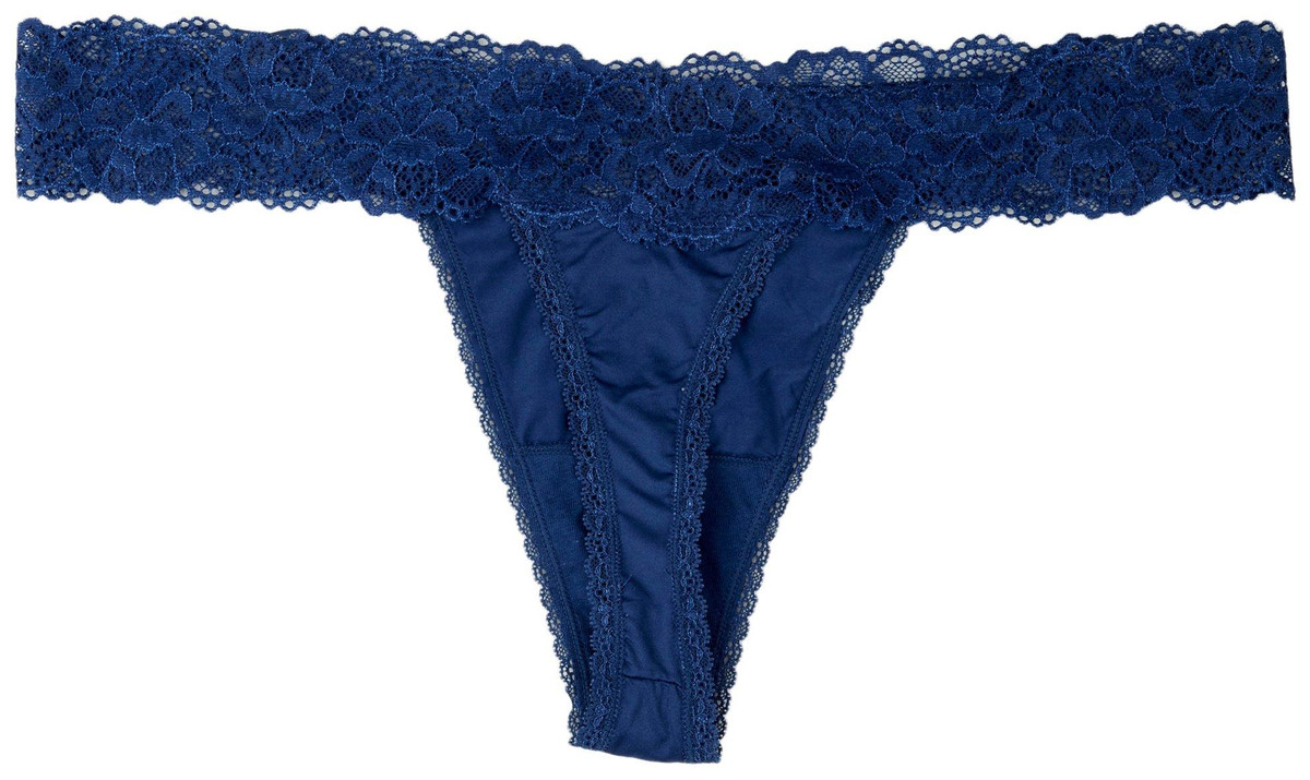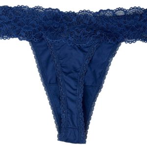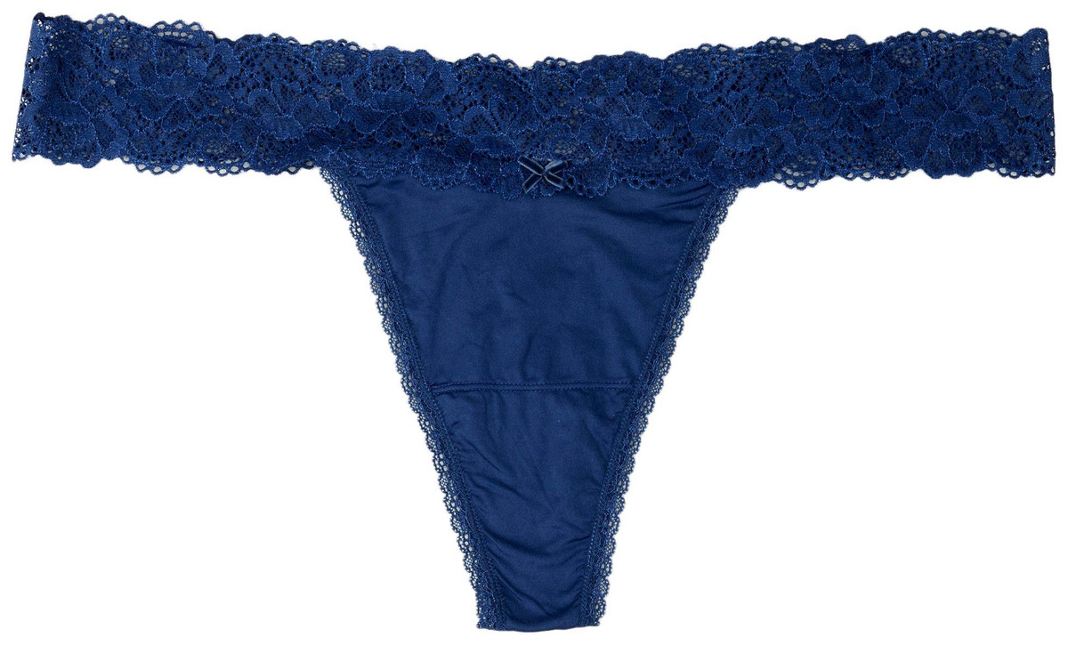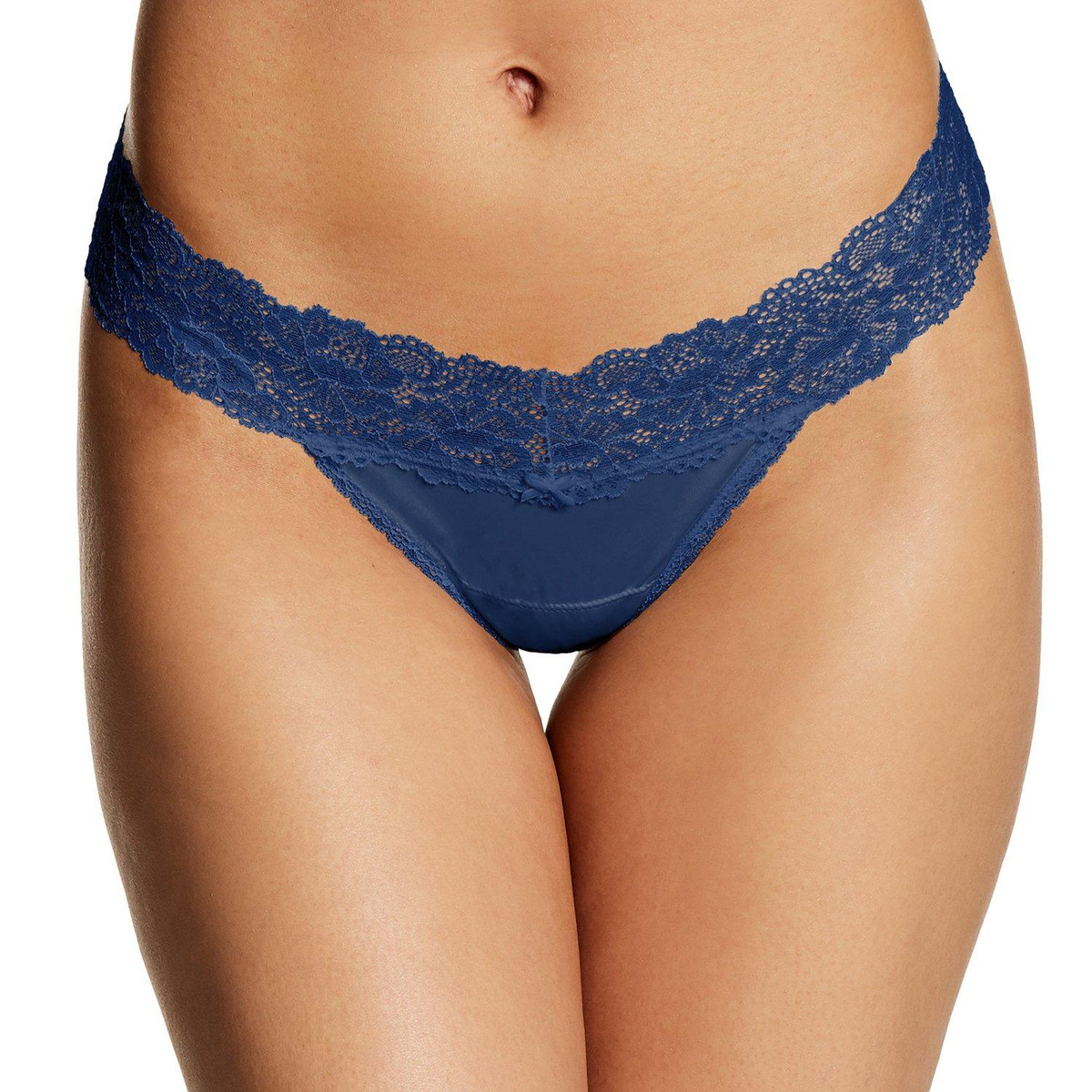 These Maidenform Luxurious Lace Thong Panties feature an elastic waistband and front fabric panel for a smooth, no panty-lines look. Fabrication 85% nylon, 15% spandex, and a 100% cotton lining. DMESLT