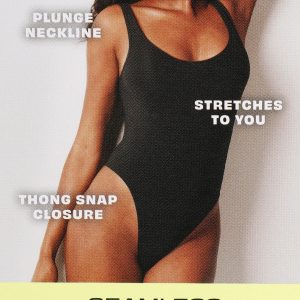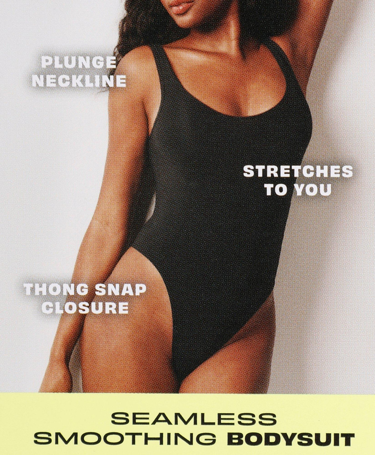 Embrace sleek sophistication with the Seamless Smoothing Bodysuit. Featuring a daring plunge neckline, this bodysuit offers a bold yet elegant look. The stretch fabric ensures it adapts perfectly to your shape, providing a smooth and comfortable fit. With a convenient thong snap closure, it stays discreet under any outfit. Fabrication is 91% nylon and 9% spandex.