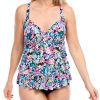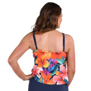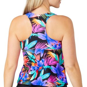 Featuring bold geometric floral shapes in vibrant shades of blue, coral, and purple, this tankini top offers a dynamic, layered, and abstract design. Styled with a flattering scoop neck, this swim top features molded cups and thick, over-the-shoulder straps that keep you comfortably supported. Fabrication 82% nylon and 18% Lycra.