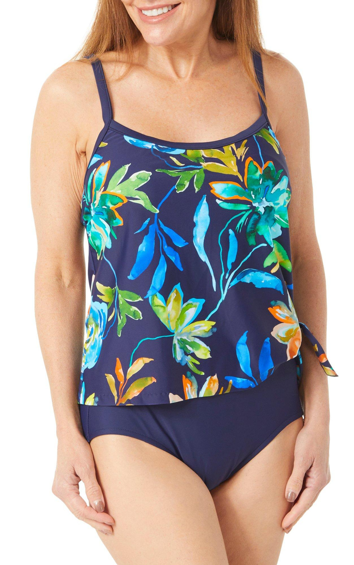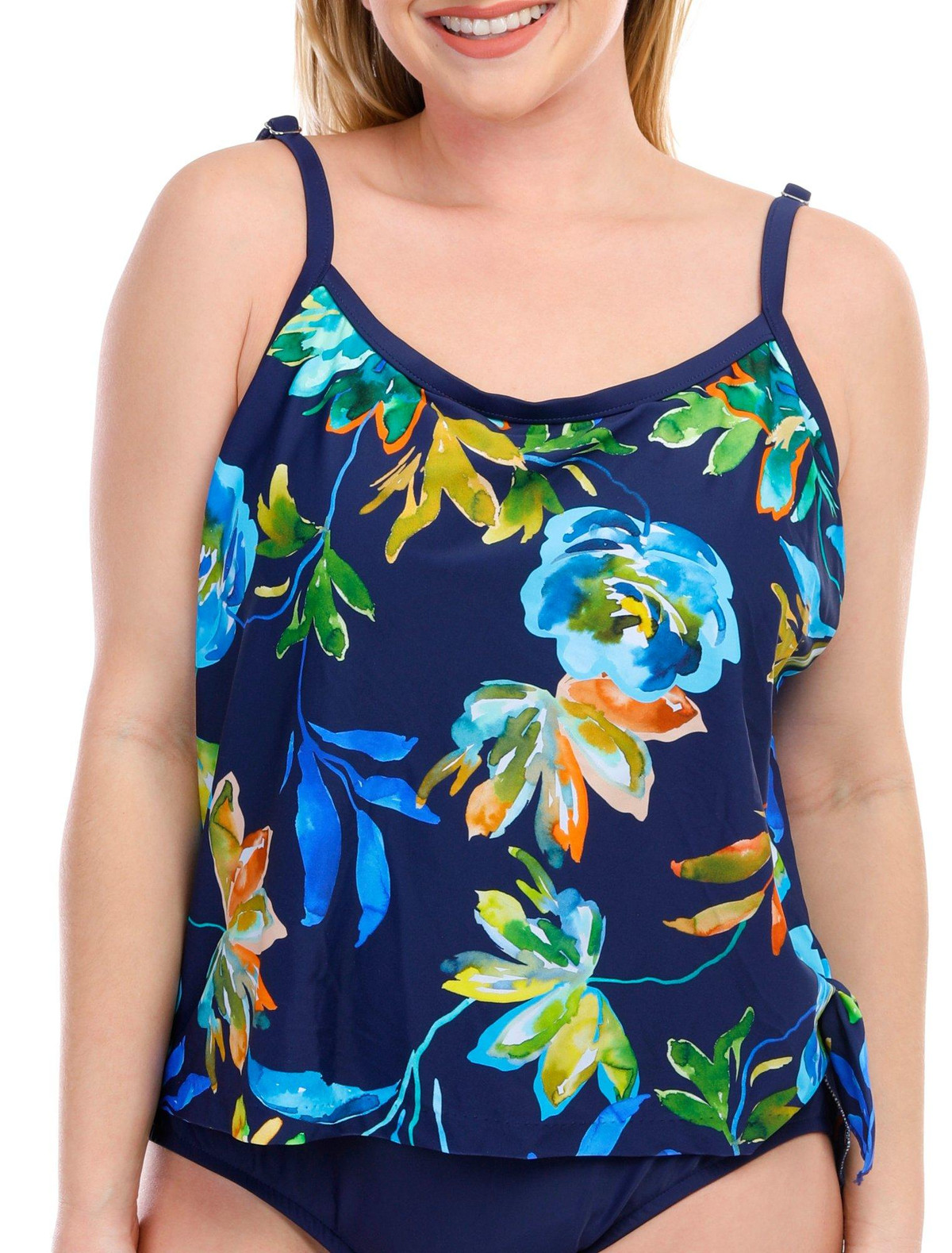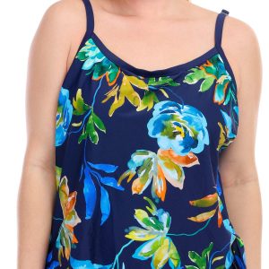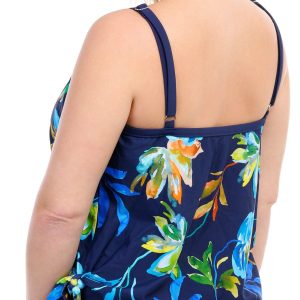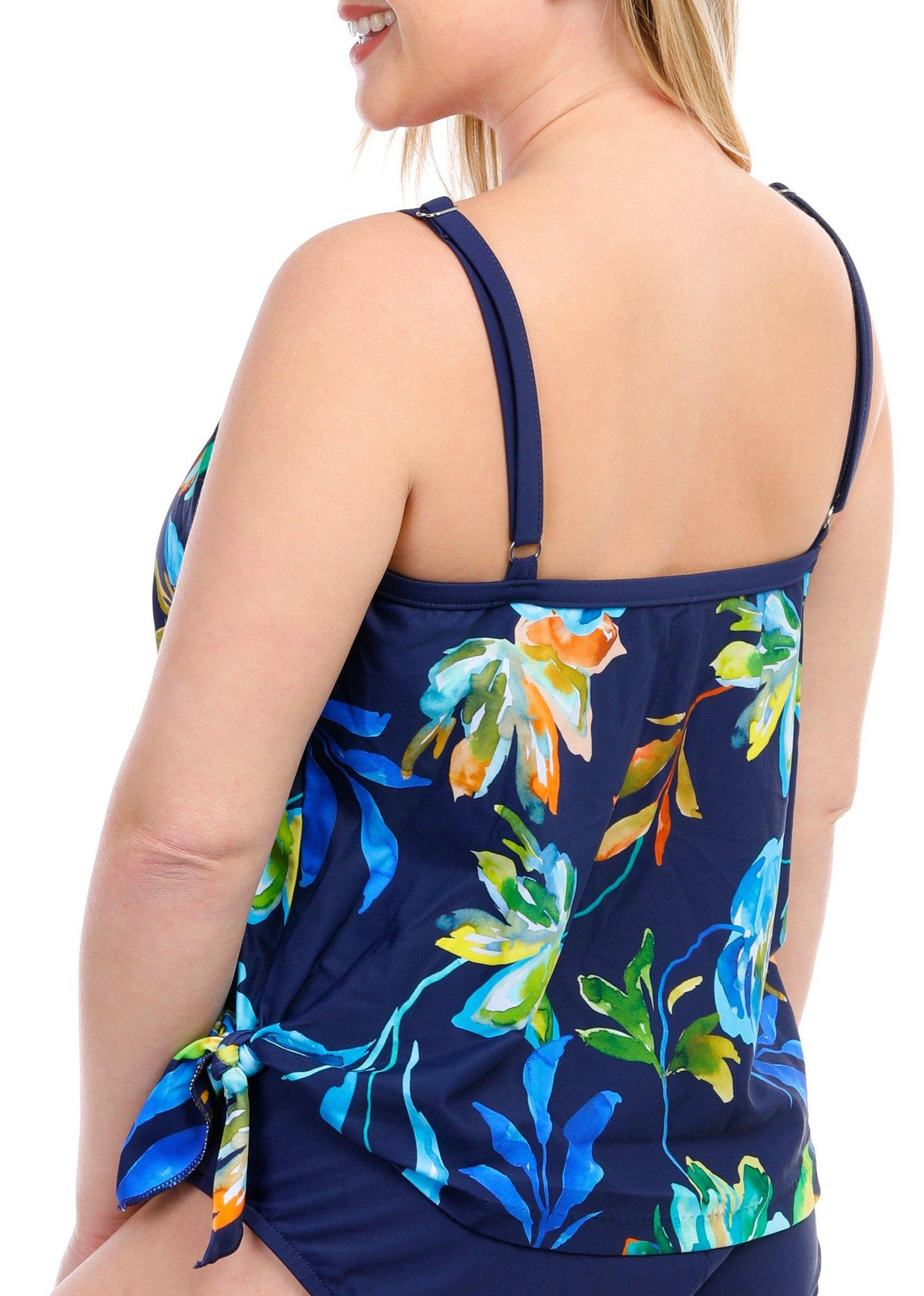 This one piece showcases large, painterly floral motifs in rich hues of blue, green, and orange, set against an indigo background. A side tie on the one-piece design creates the look of a tankini. Molded cups, adjustable straps and a tummy toner work together to lift, support and smooth your silhouette.