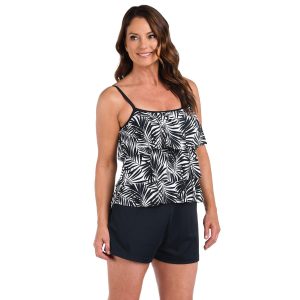 This tankini top features a striking black-and-ivory design of overlapping palm leaves, creating a bold, high-contrast tropical motif. Ruffled layers create a loose, flowy fit that subtly disguises your stomach and waist, while a scoop neck and molded cups flatter the bust. Fabrication 82% nylon, 18% Lycra Xtra Life elastane.
