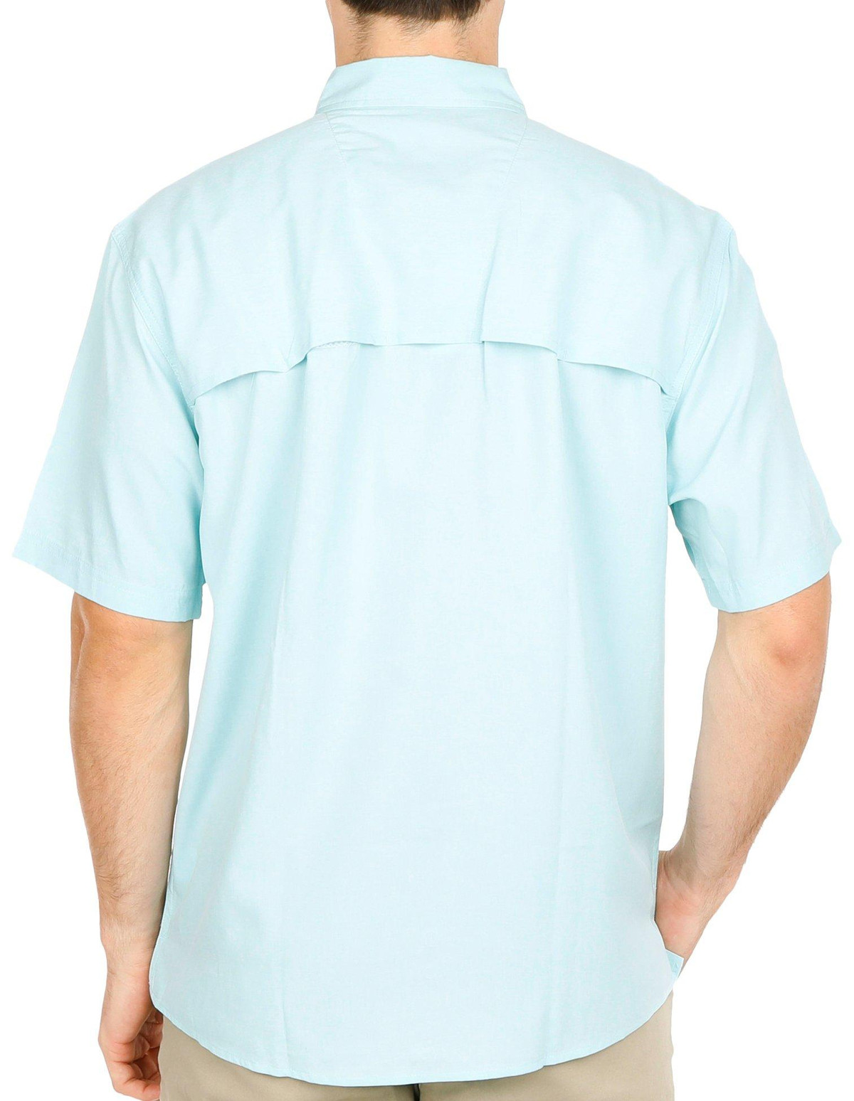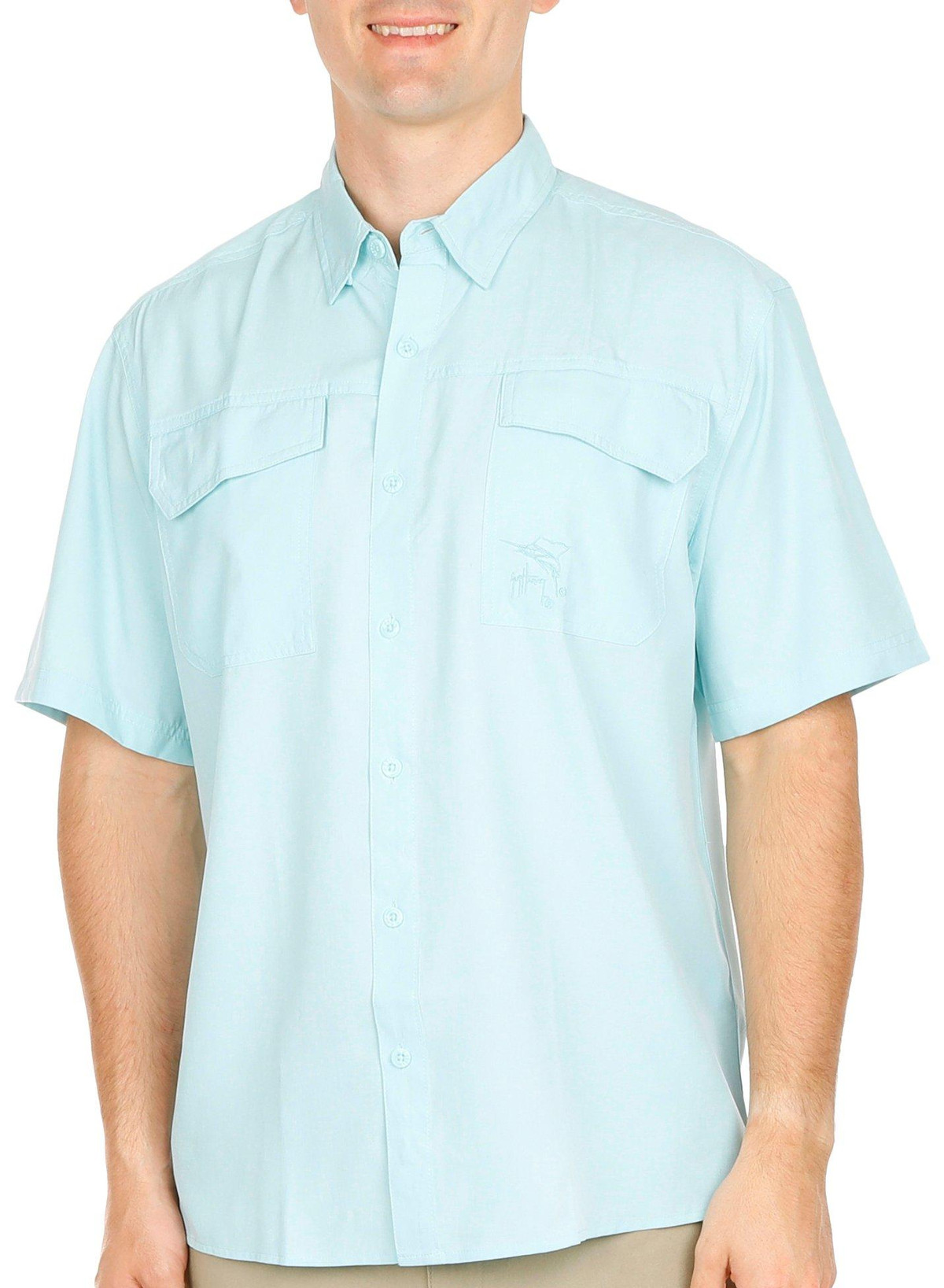 Guy Harvey features his award-winning marine artwork on this coastal short sleeve shirt. It features a solid heather design on lightweight woven fabric, a point collar, full button front closure, two chest flap adhesive closure pockets, a fully vented back panel to keep you cool, sun protection, moisture-wicking and quick-dry technology.