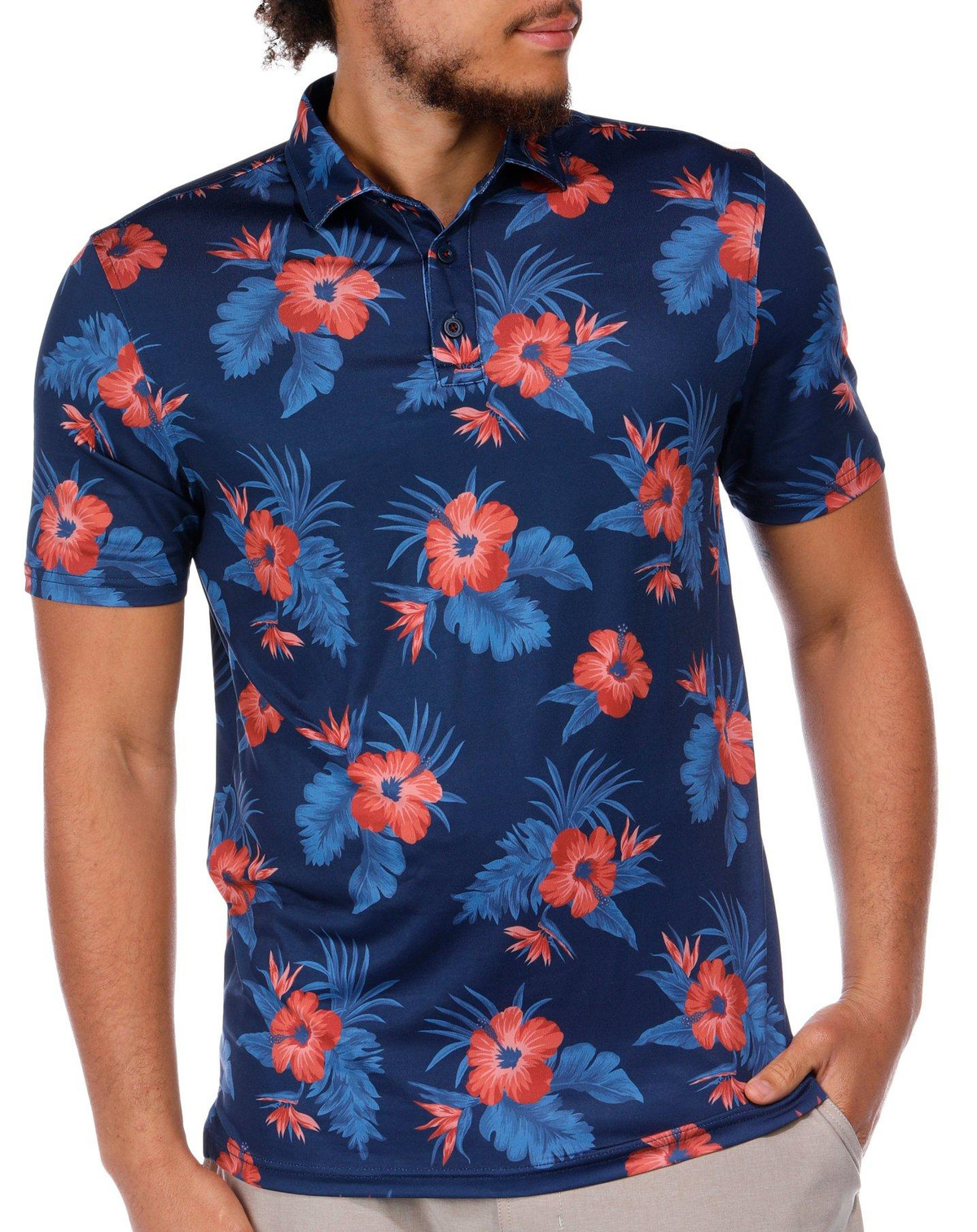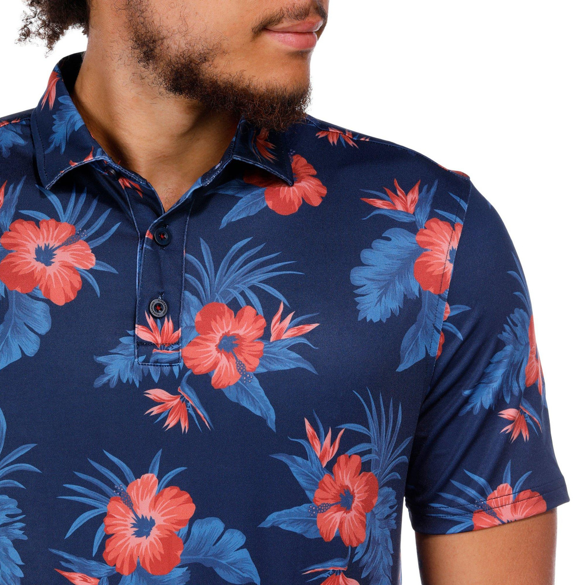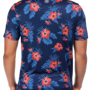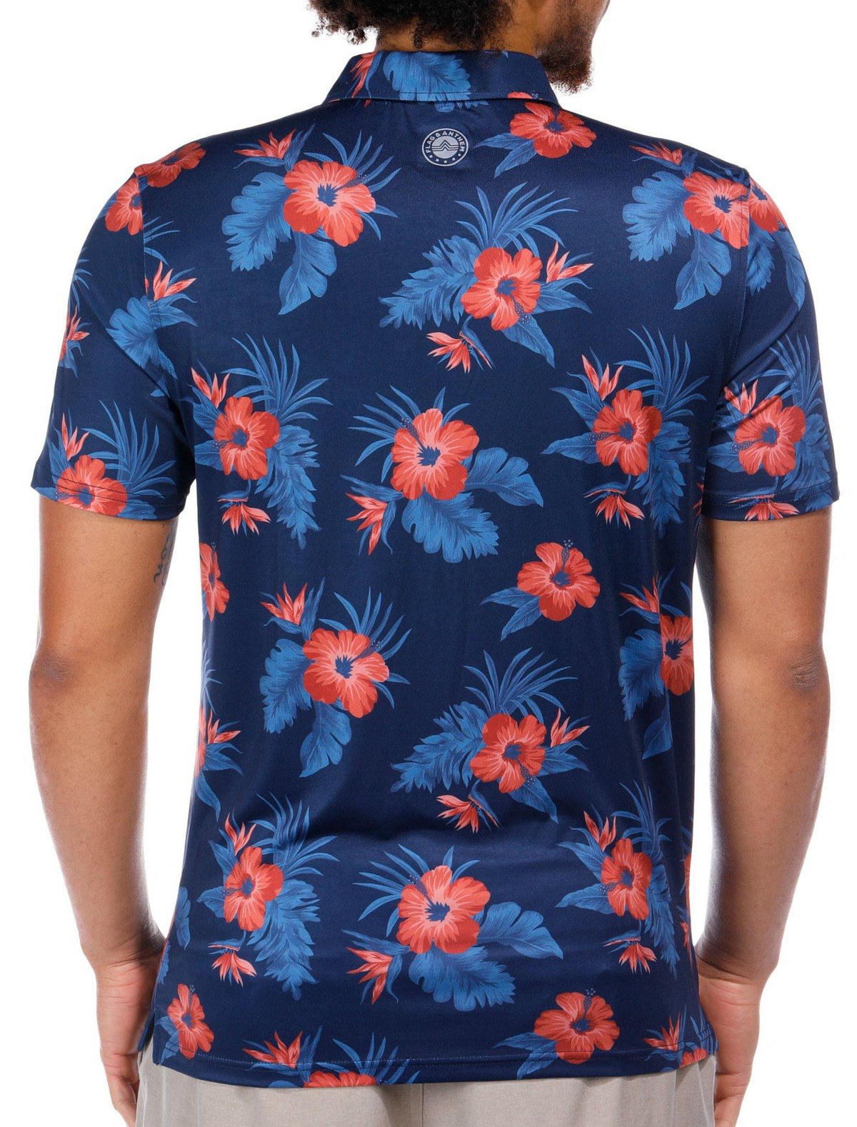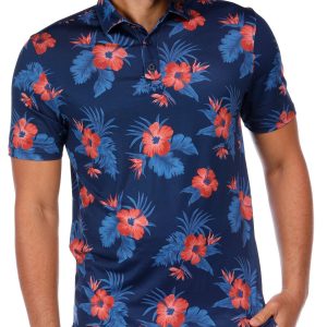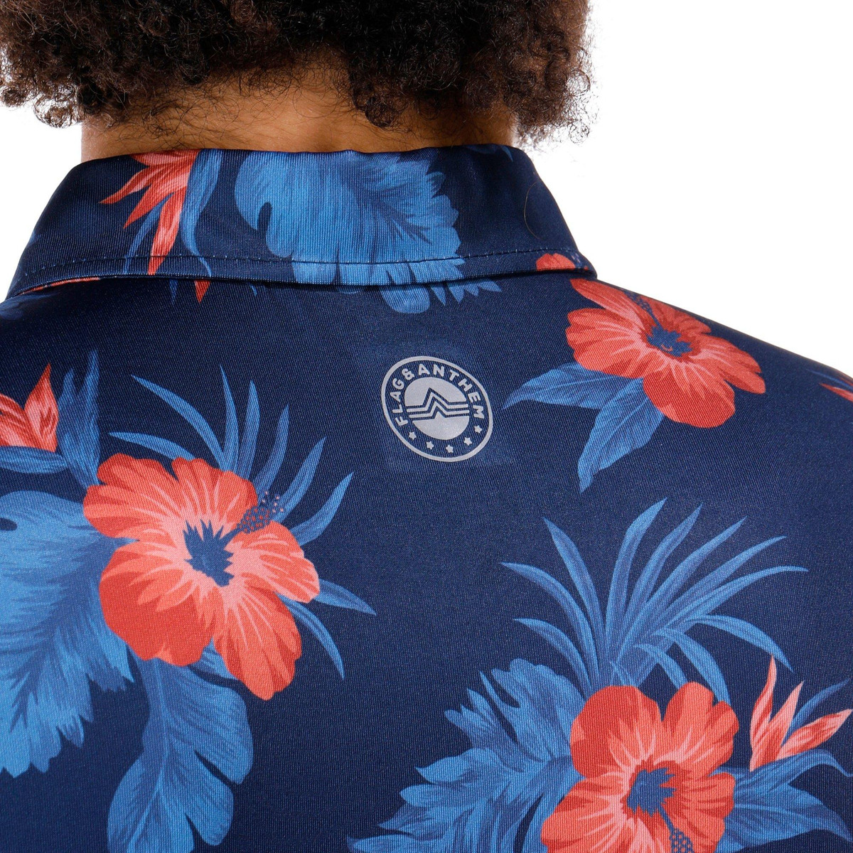 Introducing the Littleton Performance Polo, designed for both style and functionality. Featuring a sleek hibiscus print design, this polo offers UPF protection to shield you from harmful sun rays. The stretch fabric ensures a comfortable fit and ease of movement, making it perfect for active days. Fabrication is 89% polyester, 11% spandex.