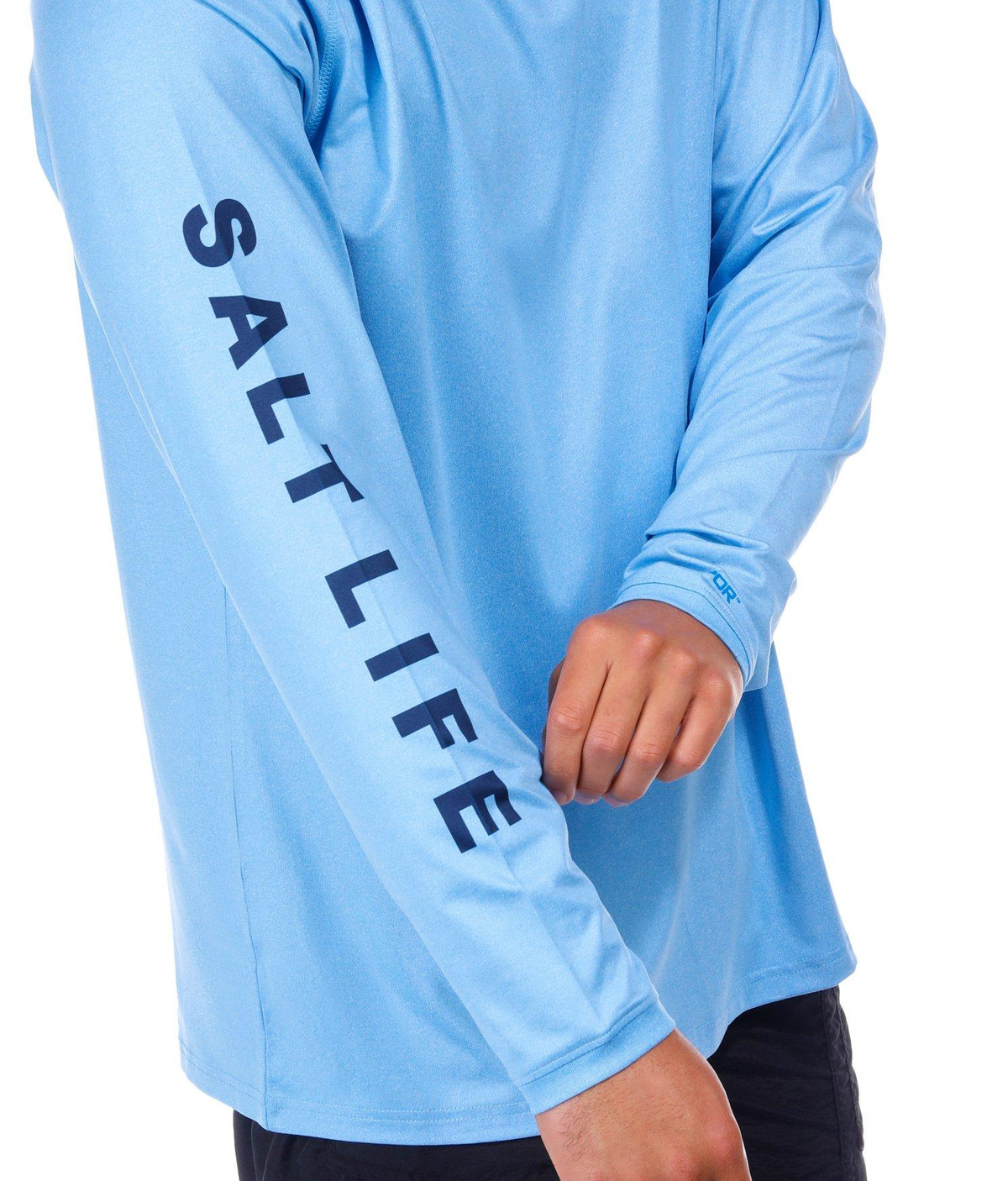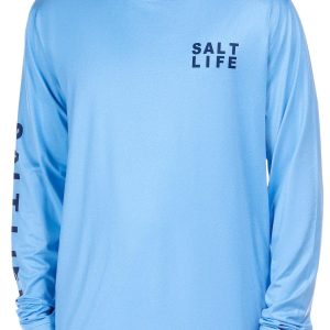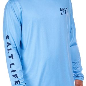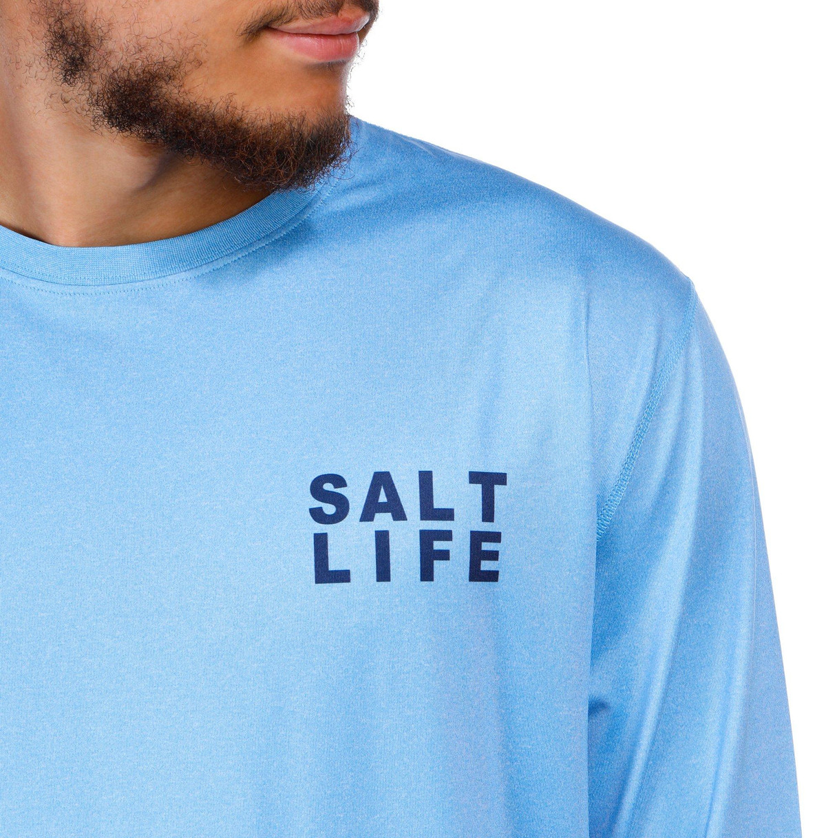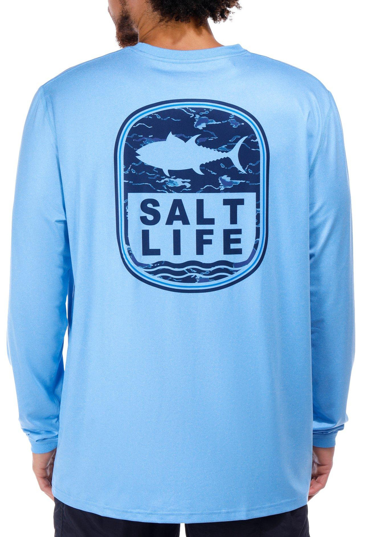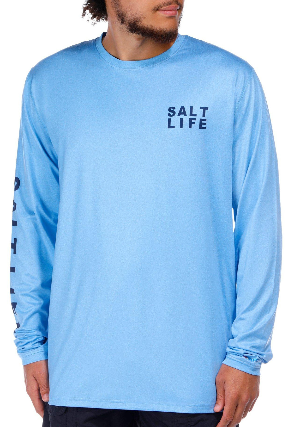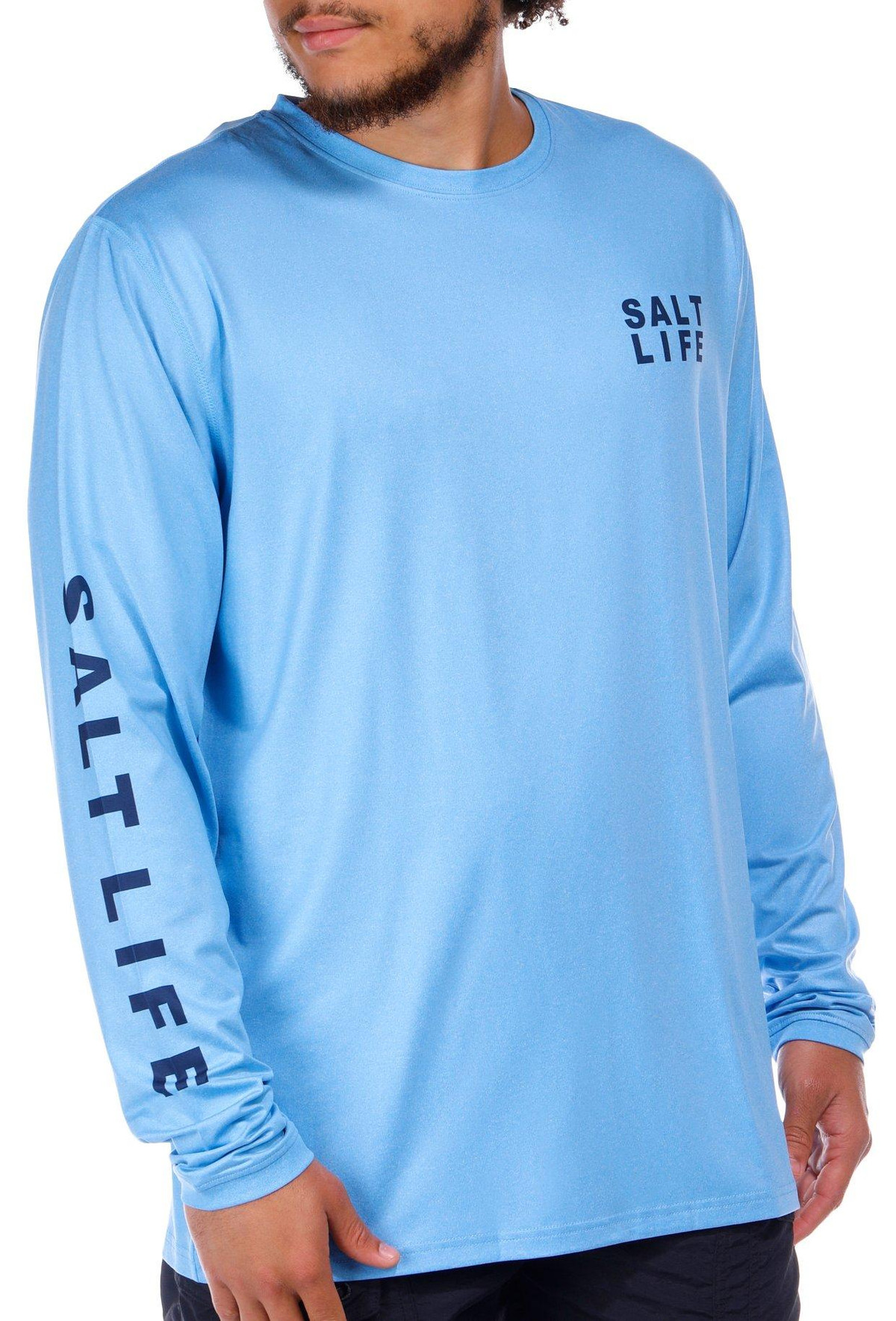 Salt Life designs apparel, footwear, and accessories with the ocean lover in mind. This long-sleeve performance tee features a solid color design on ultra-soft quick reaction fabric, a screen print on the back and Salt Life brand name on the front chest and sleeve, crew neckline, moisture-wicking, anti-microbial technology, and UPF 30 sun protection and regular stretchy fit. Fabrication is 88% polyester and 12% spandex.