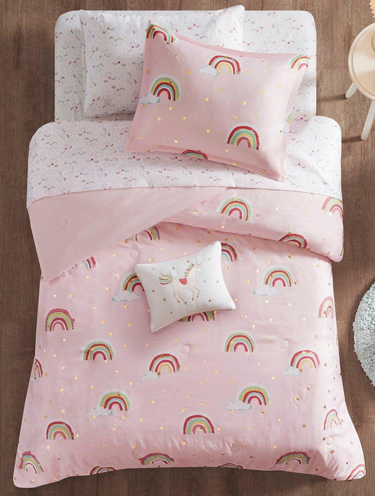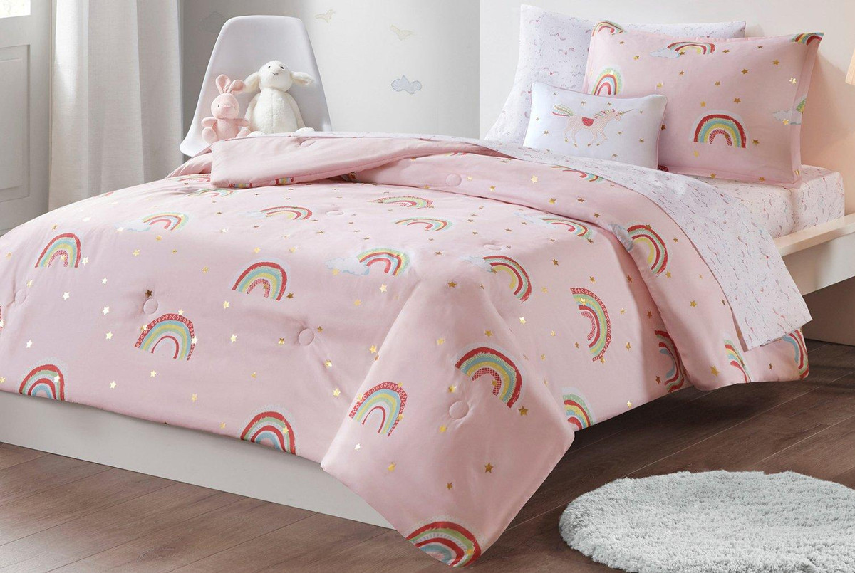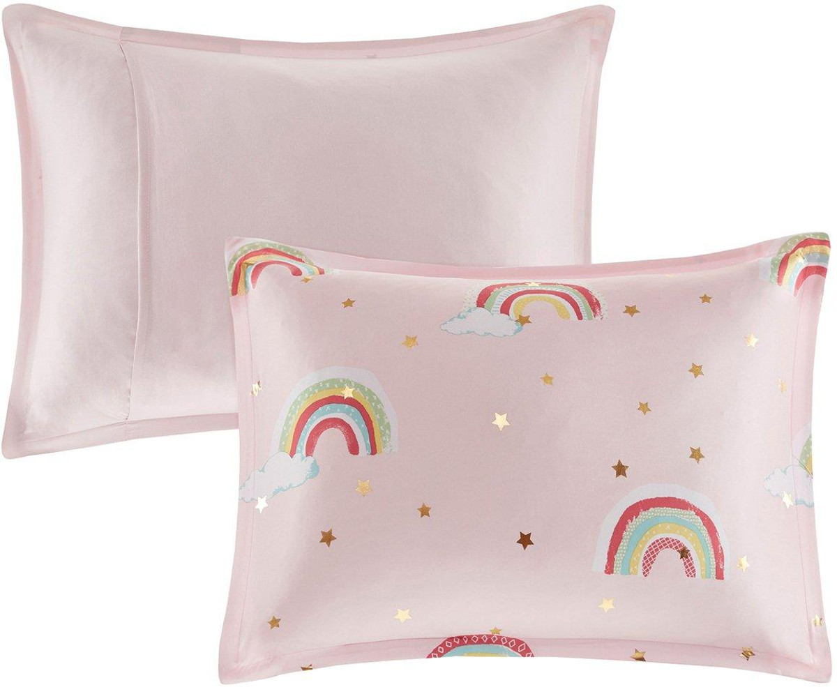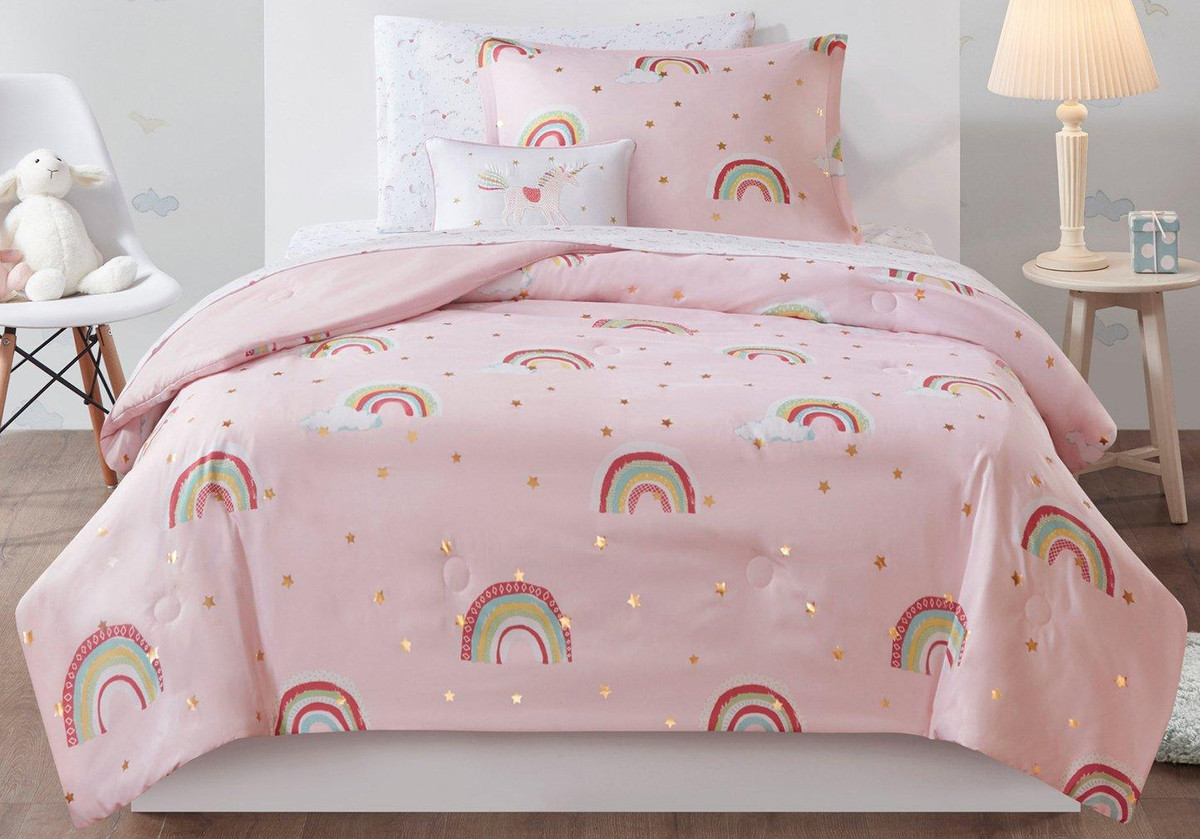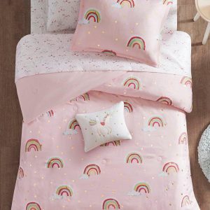 Alicia Rainbow Comforter set features rainbows and metallic print stars motif. Set includes 1 comforter, 2 pillow shams, 2 pillow cases, sheet set and 1 decorative pillow. Decorative pillows measure 12×16.