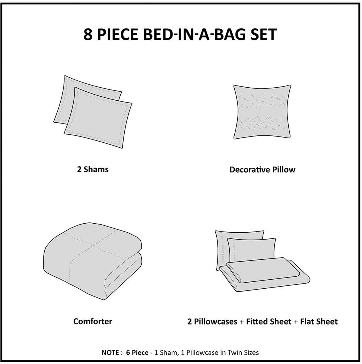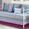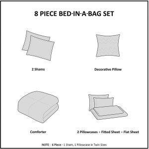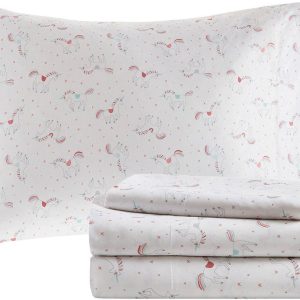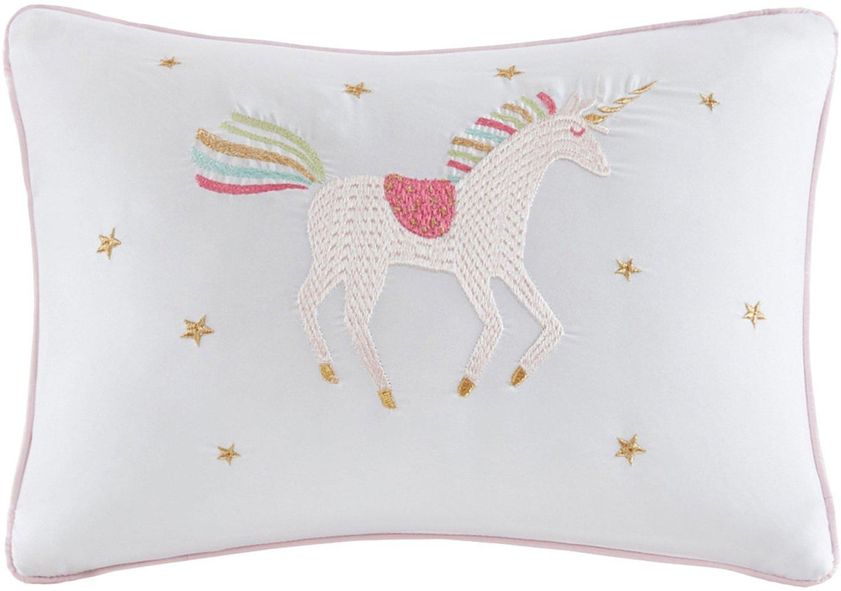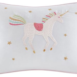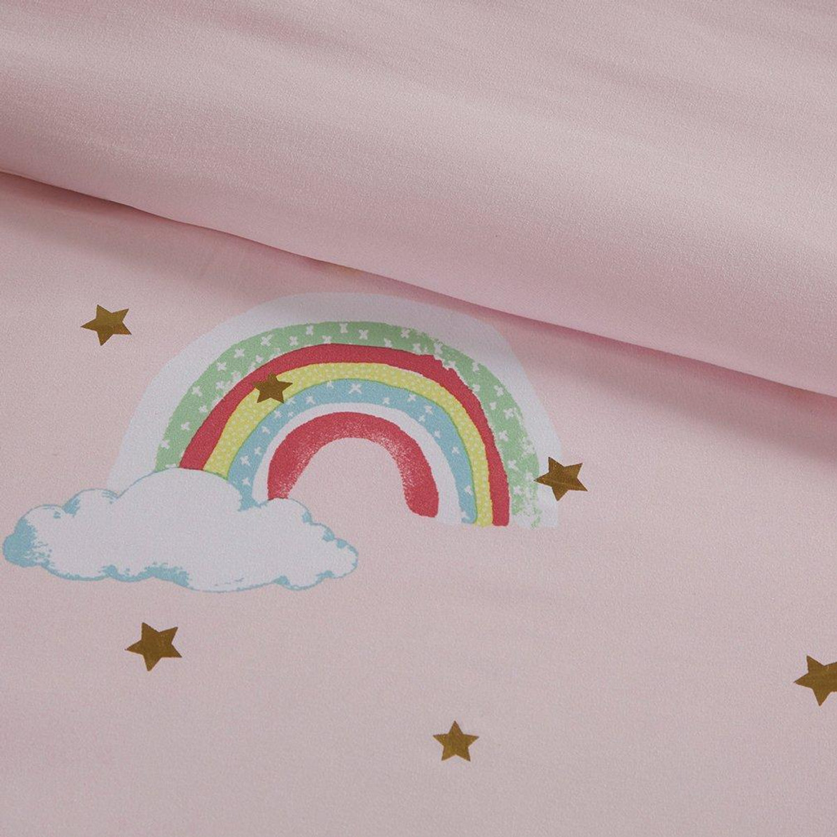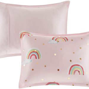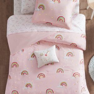 Alicia Rainbow Comforter set features rainbows and metallic print stars motif. Set includes 1 comforter, 2 pillow shams, 2 pillow cases, sheet set and 1 decorative pillow. Decorative pillows measure 12×16.