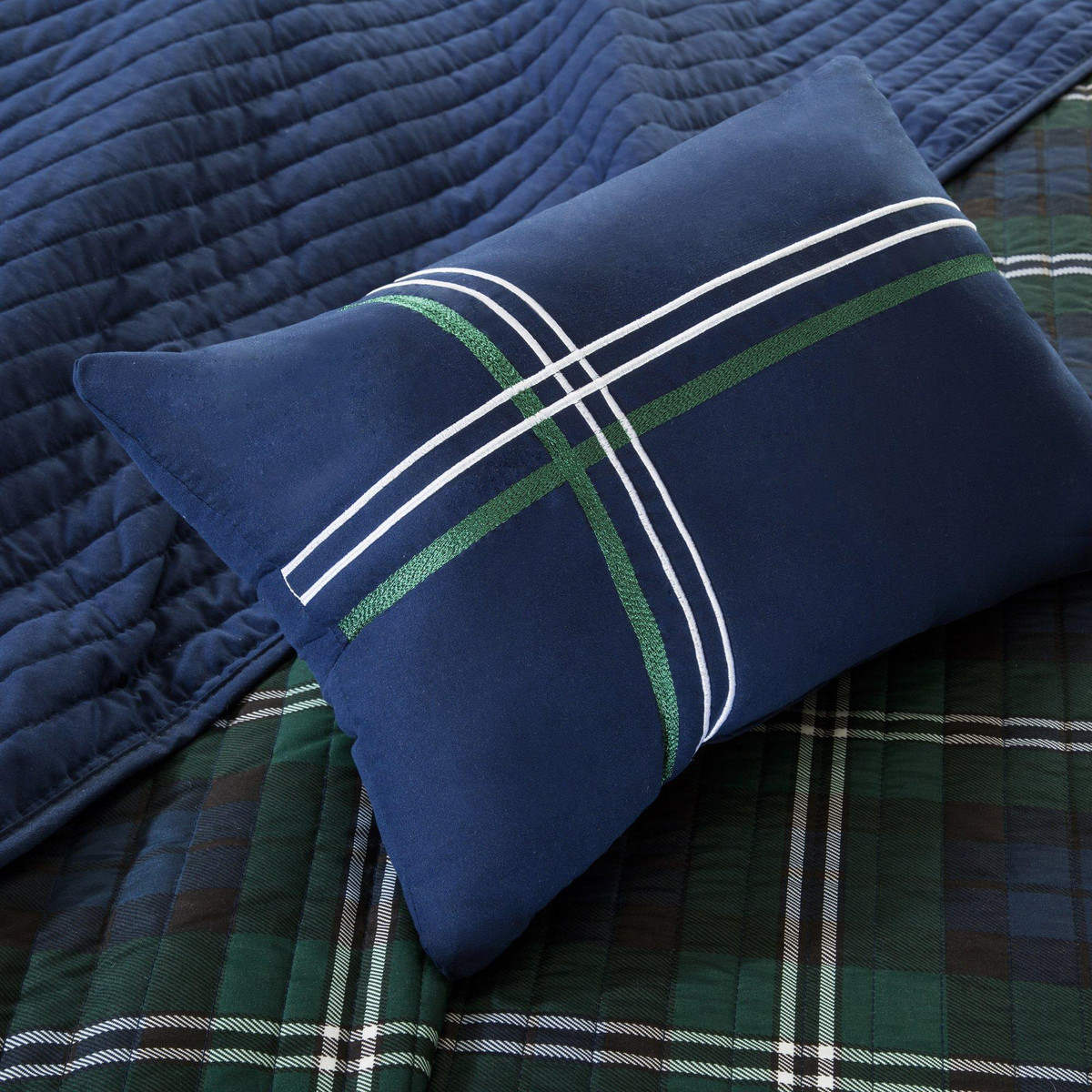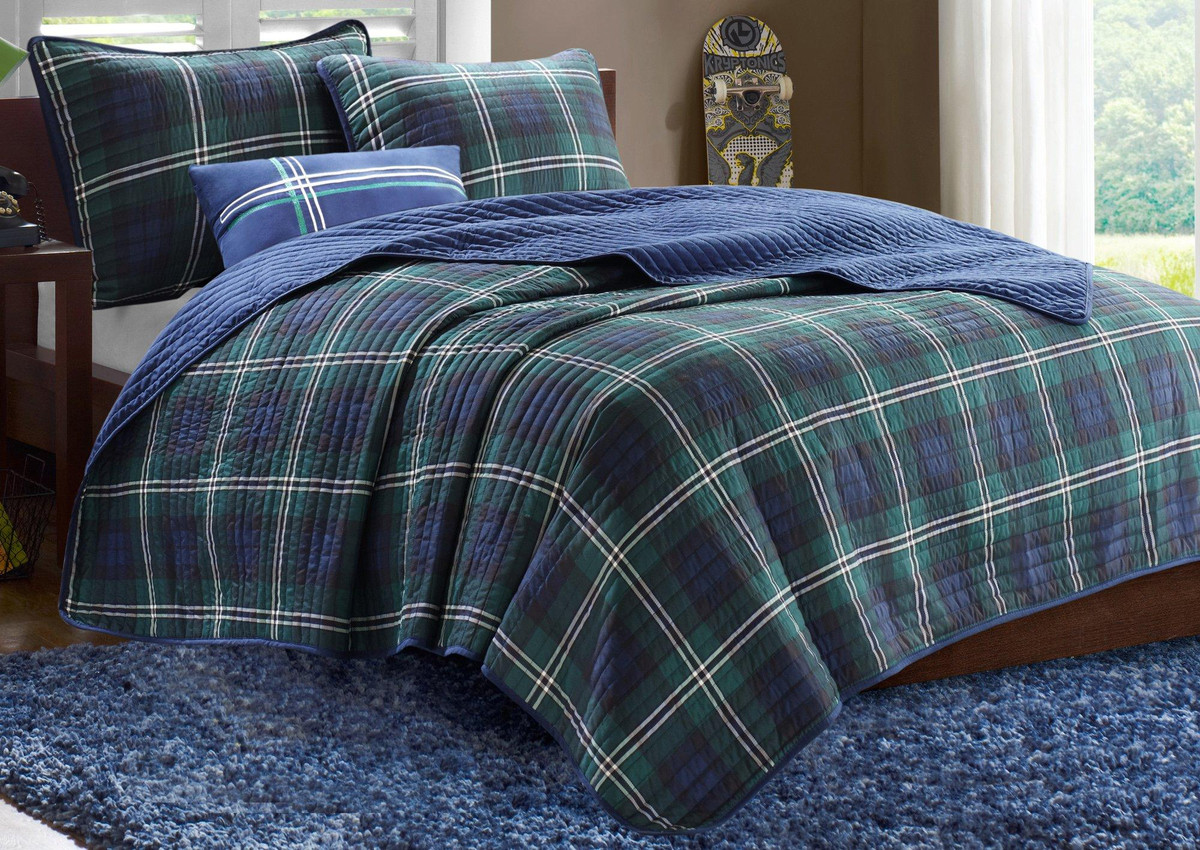 Mi Zone Brody Coverlet features a unique design of plaid on polyester microfiber for easy care. Set includes 1 cover let, 2 shams (1 twin) and 1 decorative pillow (10” x 18”).