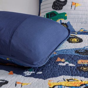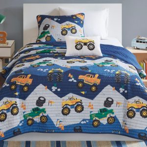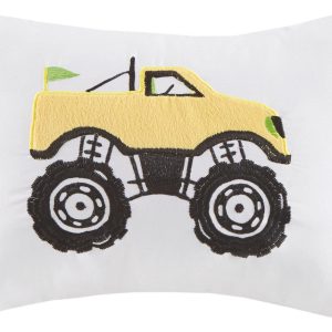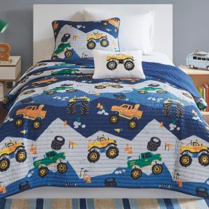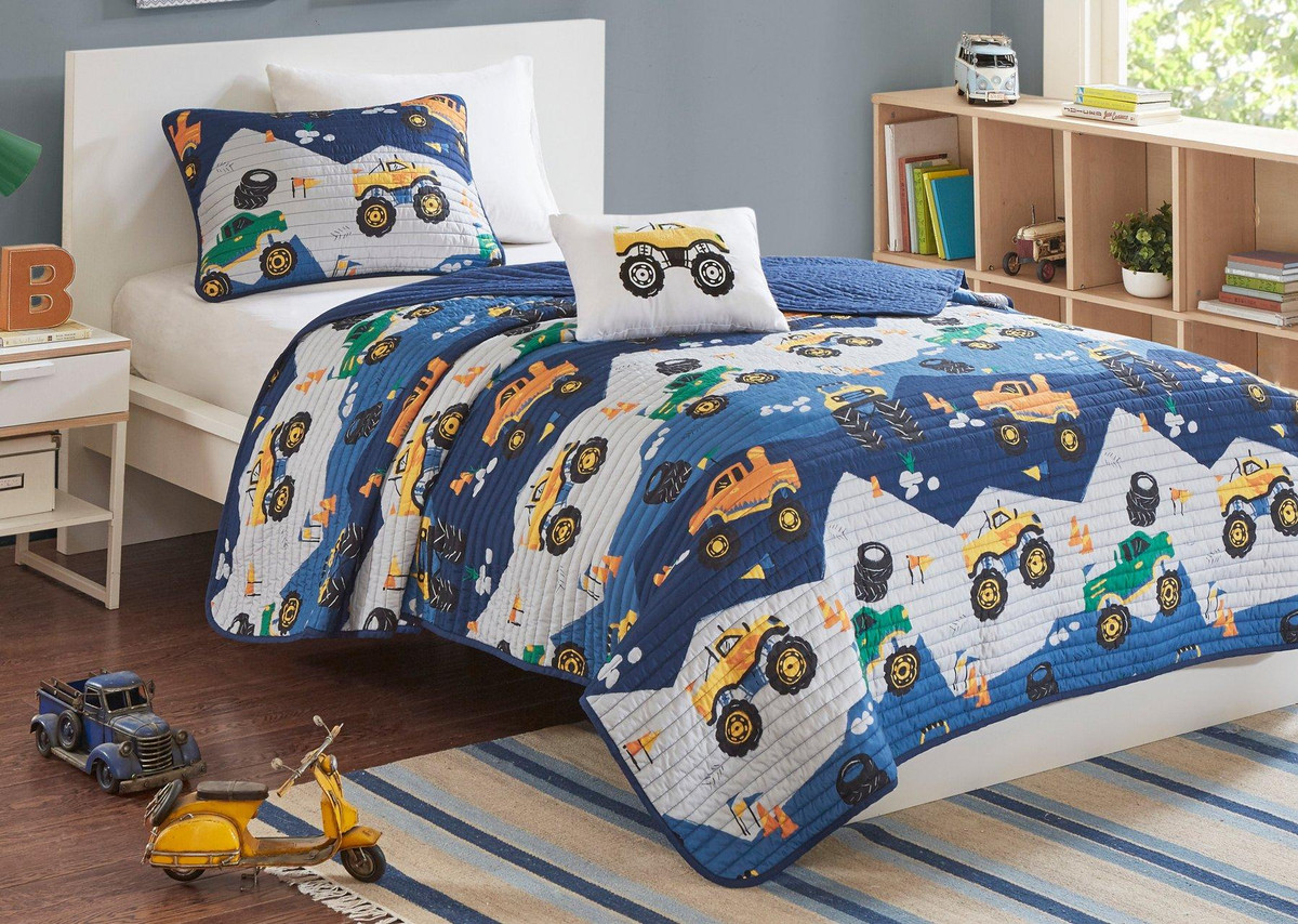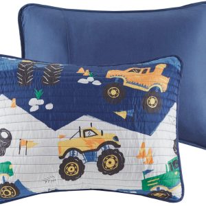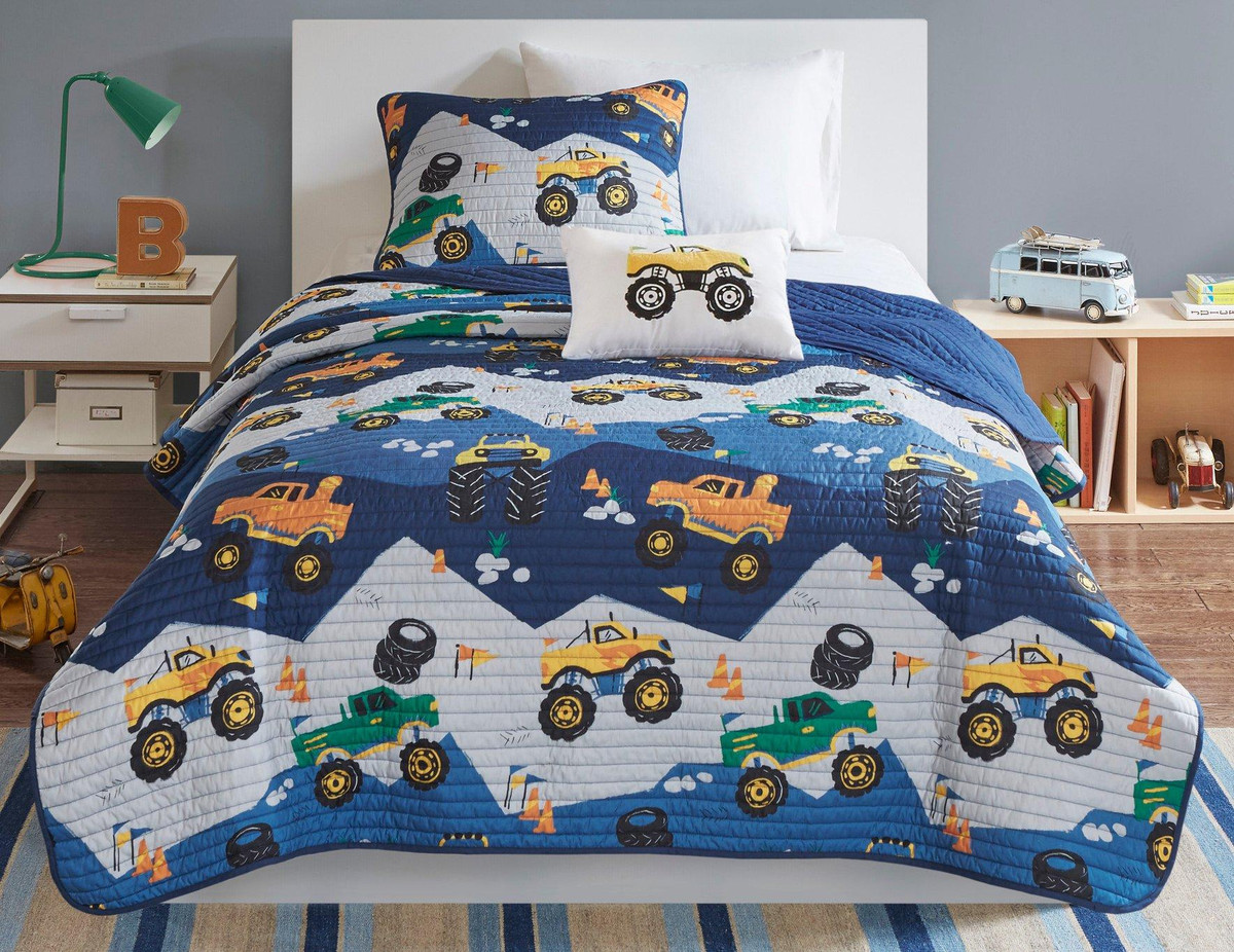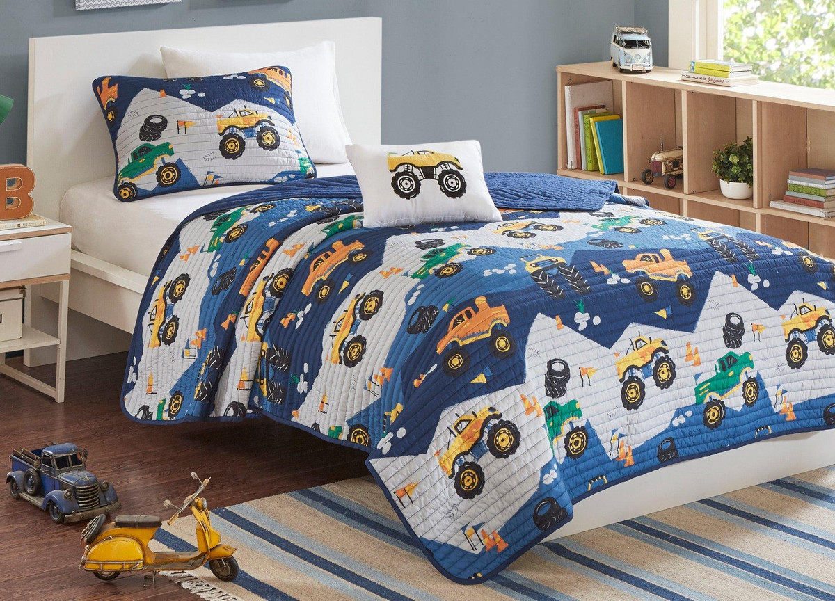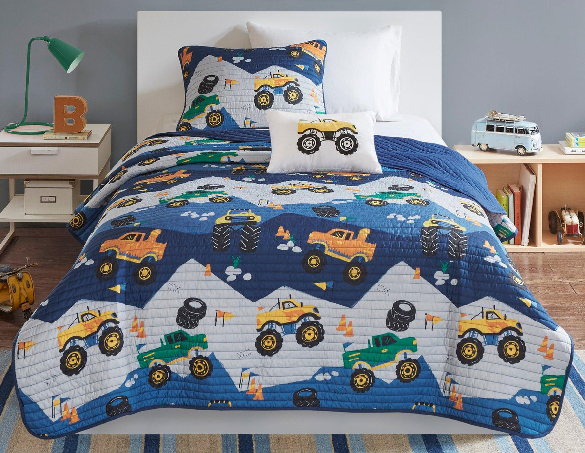 Cruise off to sleep with the Mi Zone Kids Nash Reversible Coverlet Set. The fun and exciting coverlet and matching sham(s) feature a truck print motif in green and orange colors on an ultra-soft blue and grey base fabric. A solid blue reverse complements the top of the bed. Set includes coverlet, 2 shams (1 twin) & a decorative pillow. Pillow measures: 12” x 16”.
