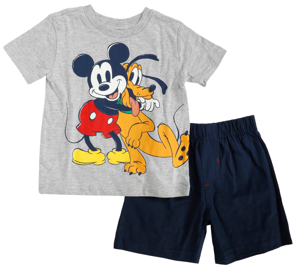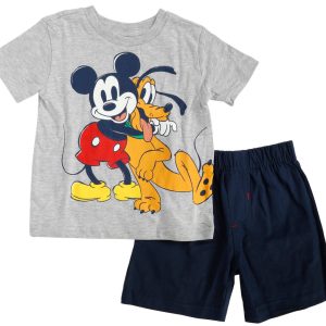 This baby boys two piece shorts set includes a graphic t shirt featuring a playful Mickey and Pluto design and solid pull on shorts. Soft and cheerful it is perfect for everyday adventures and easy all day comfort.