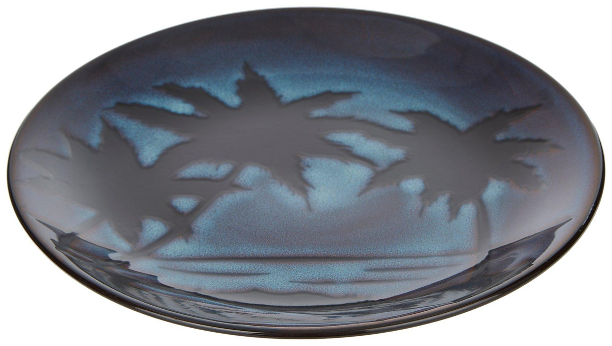 This dinner plate features a layered color design with a palm tree print accent. Measures 11.5in. Dia.