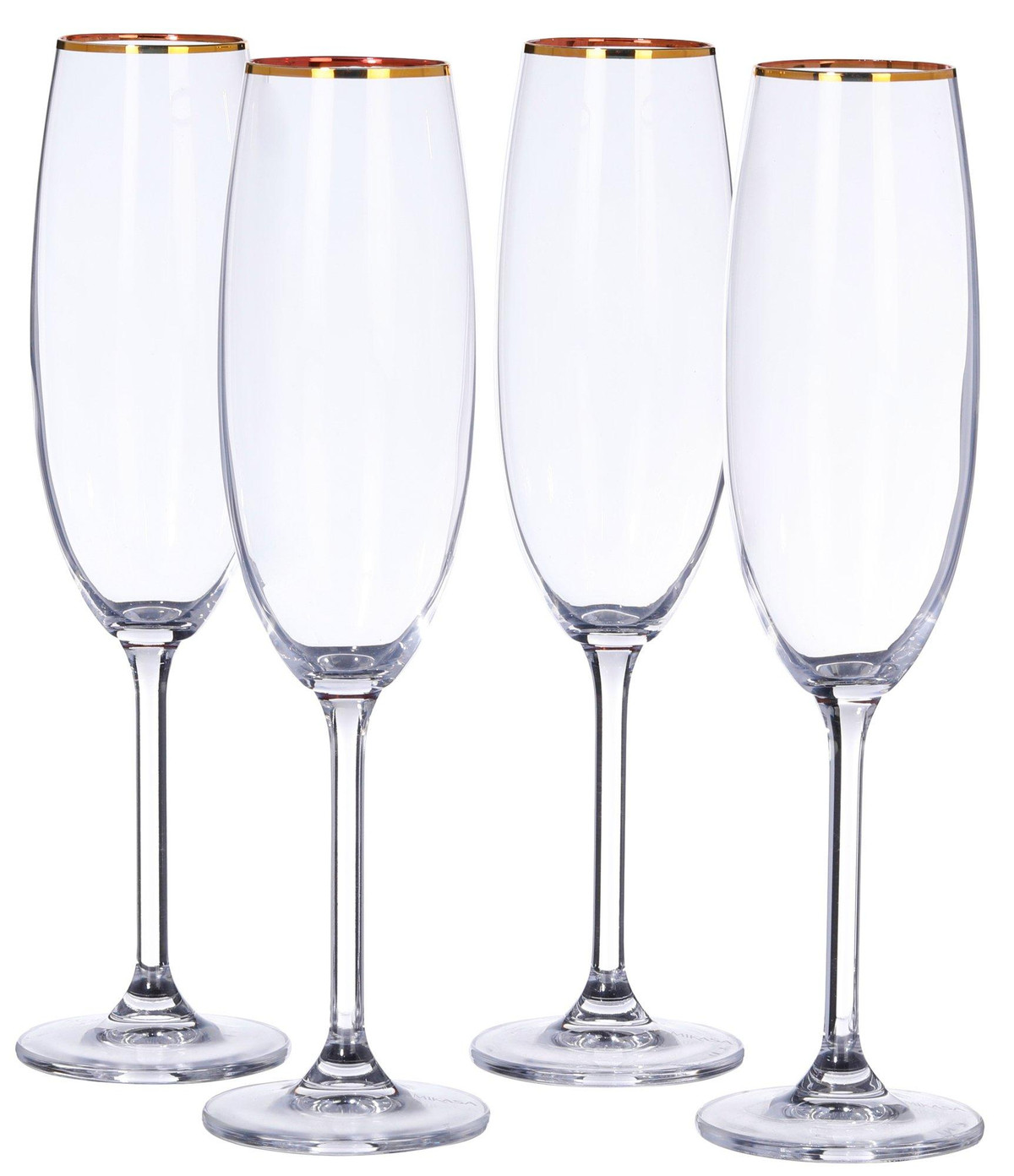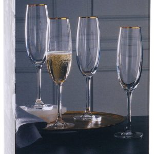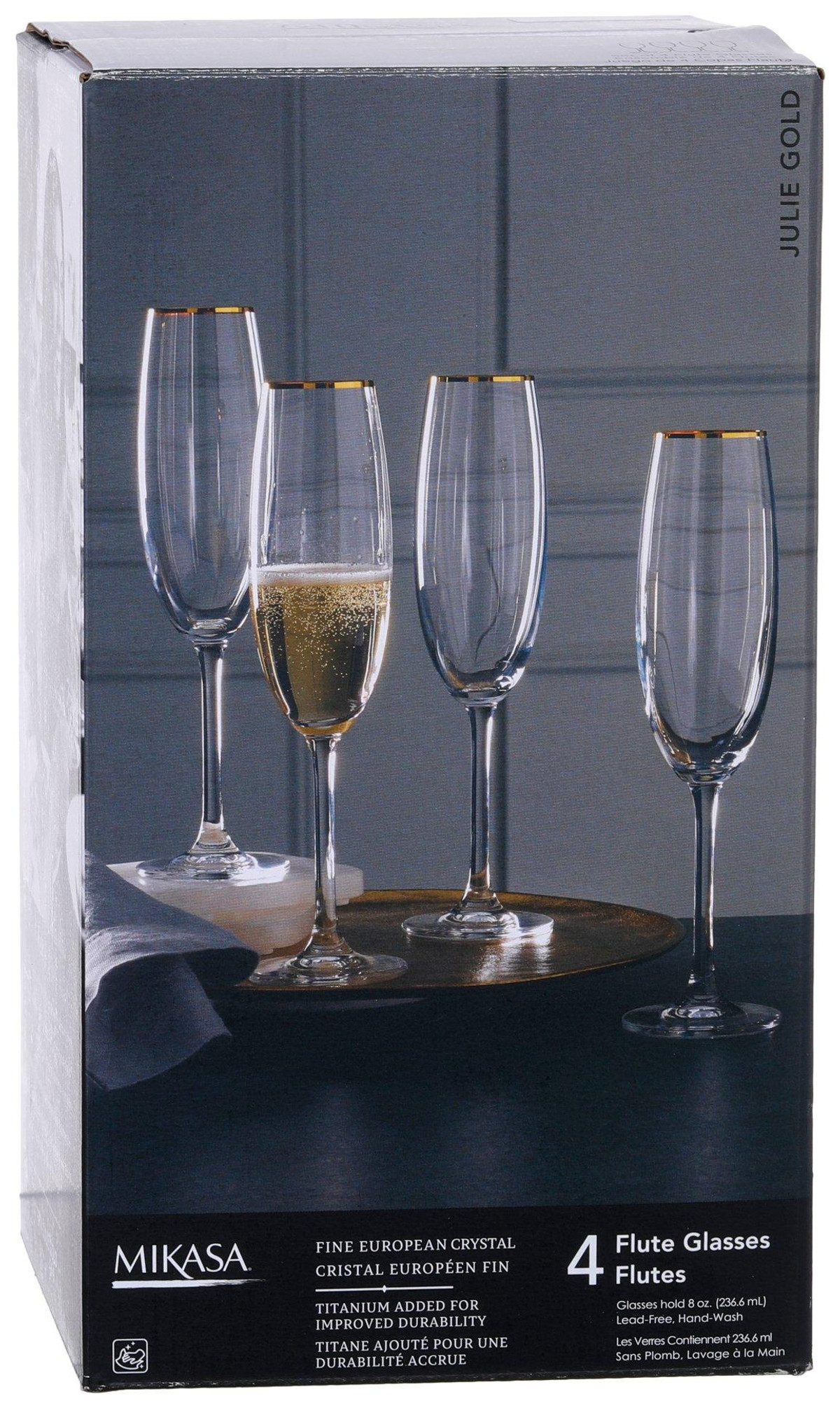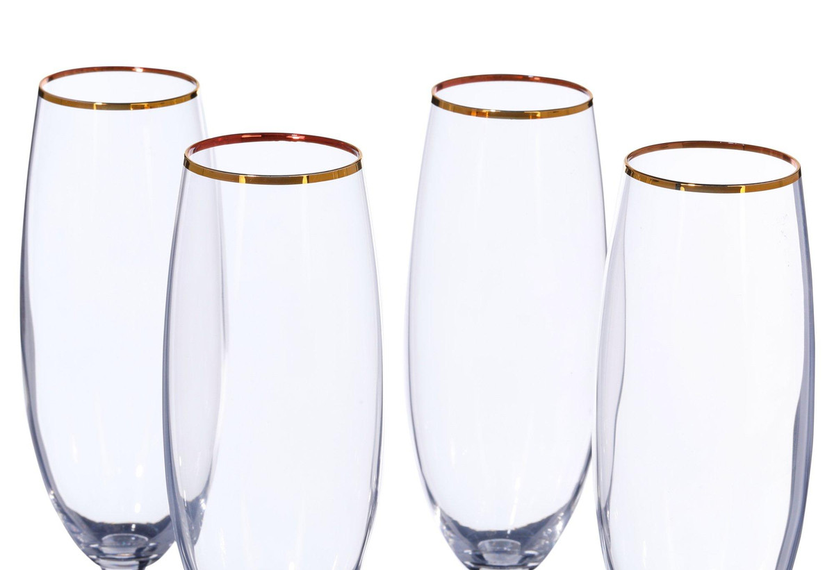 Celebrate in style with the Mikasa Julie Gold flute glass set. Each glass is crafted from fine European crystal and features a slender silhouette with a delicate hand-painted gold band around the rim. This set of four is perfect for serving champagne or sparkling wine, adding a refined touch to weddings, anniversaries, or everyday toasts. Elegant and timeless, they bring a hint of luxury to any occasion.