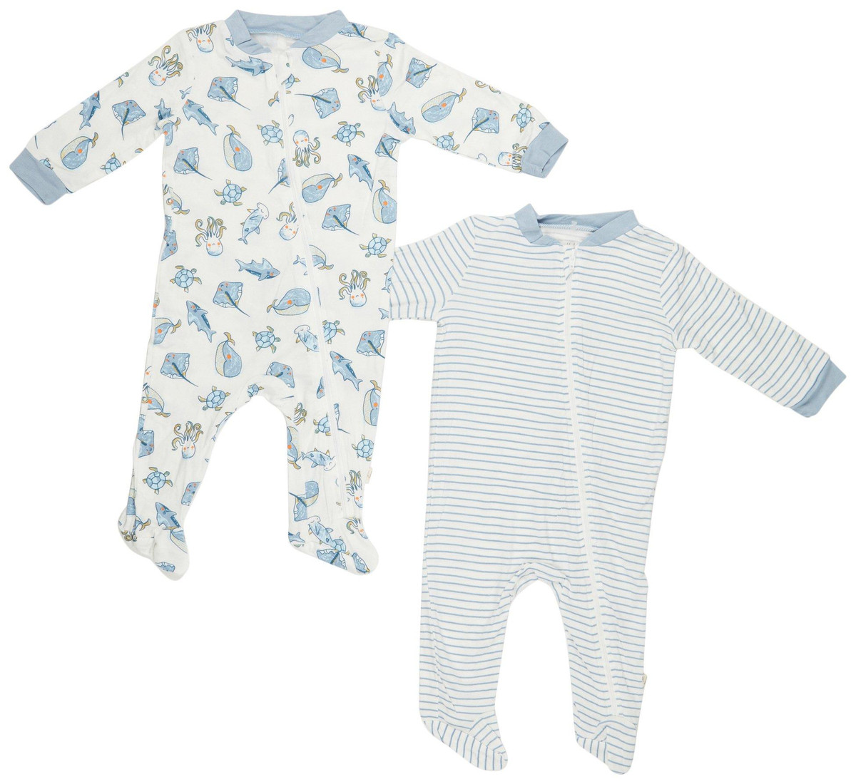 Wrap your little one in cozy comfort with this Baby Sleeper 2-Pack! Made from soft and breathable bamboo fabric, these sleepers are cool to the touch and perfect for restful nights. One features a classic striped design, while the other showcases a playful ocean life print. Designed with footed bottoms and a full-length zipper from neck to ankle, they allow for easy changes. The crew neck and snug fit ensure warmth and flexibility, making this set a must-have for bedtime or lounging.