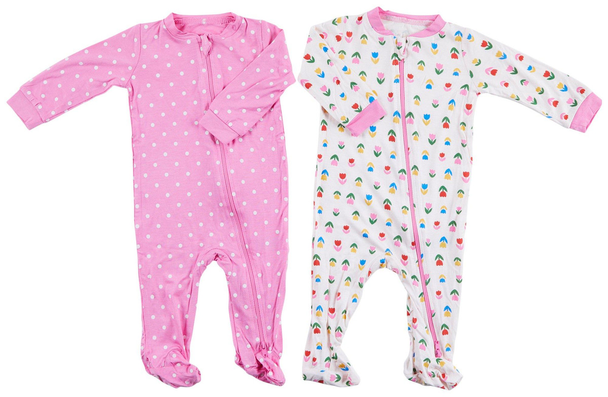 Introducing the Baby Girls 2 Pk Footed Sleepers, crafted from a soft blend of rayon and spandex for ultimate comfort. This set includes two sleepers, each featuring a different charming print. Designed with long sleeves, full front zip-up closures for easy dressing, and footed legs to keep little feet warm, these sleepers are perfect for ensuring your baby girl stays cozy and stylish during bedtime or lounging.
