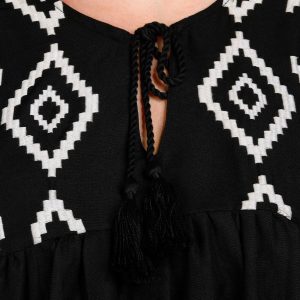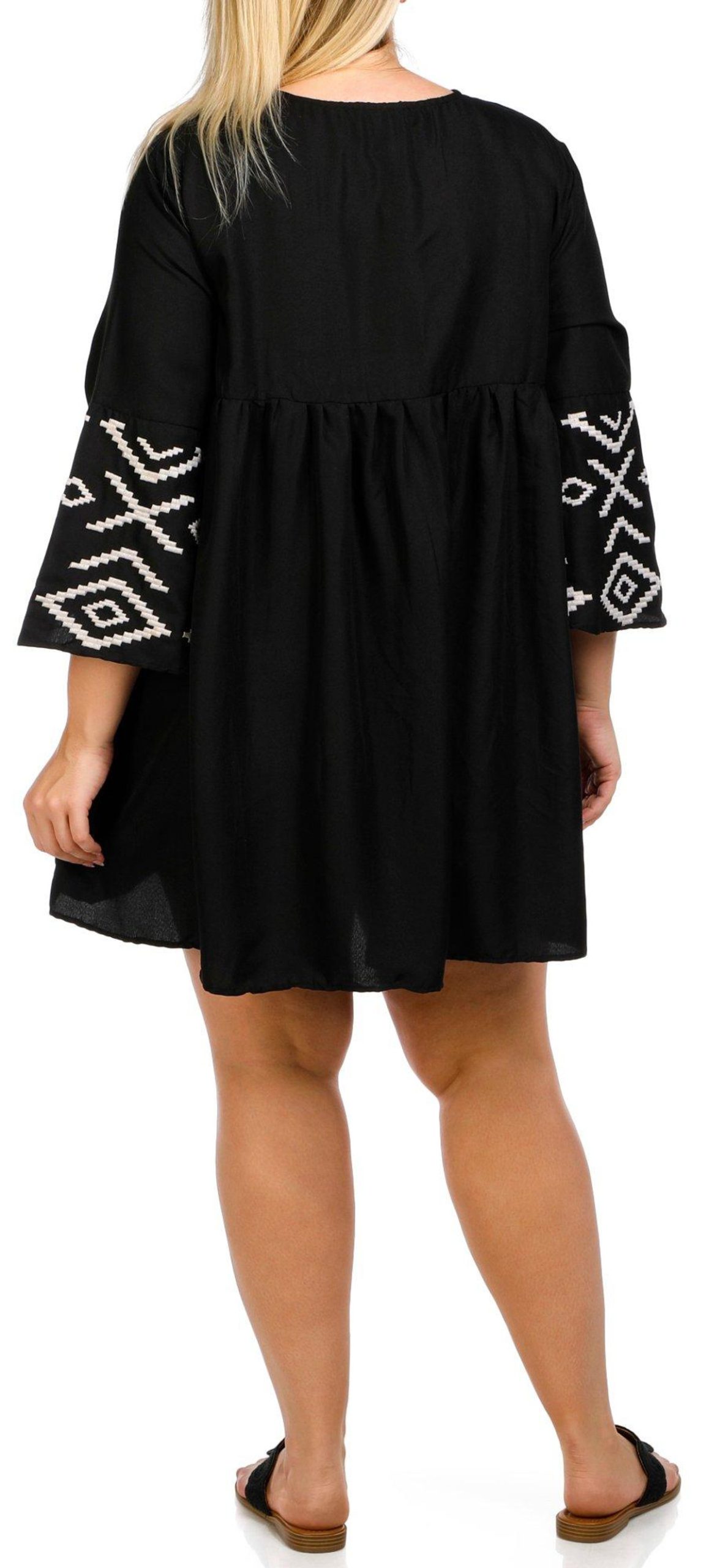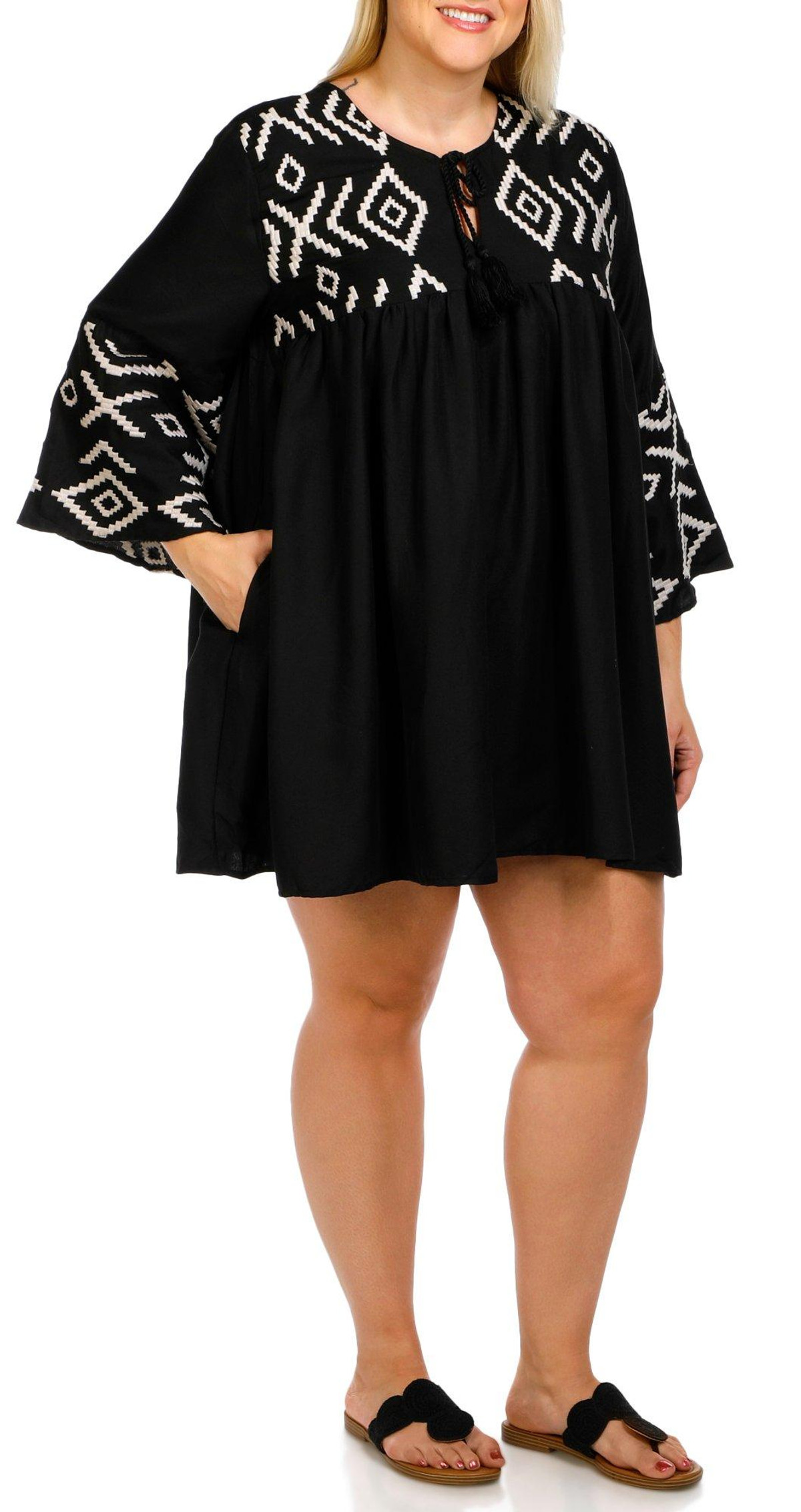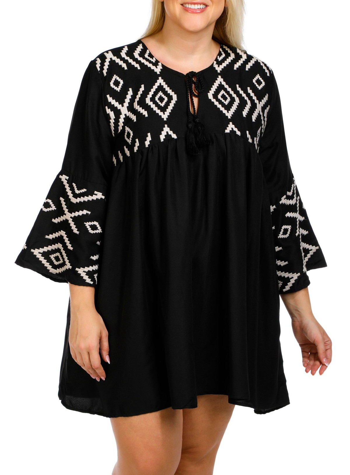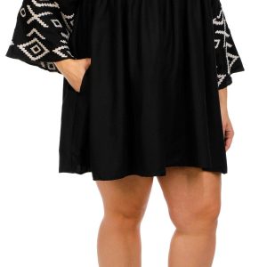 This plus size dress is made of 100% rayon and features long sleeves, a keyhole neckline, and an embroidered pattern. With its’ soft fabric and elegant details, it offers a comfortable and stylish look for any occasion.