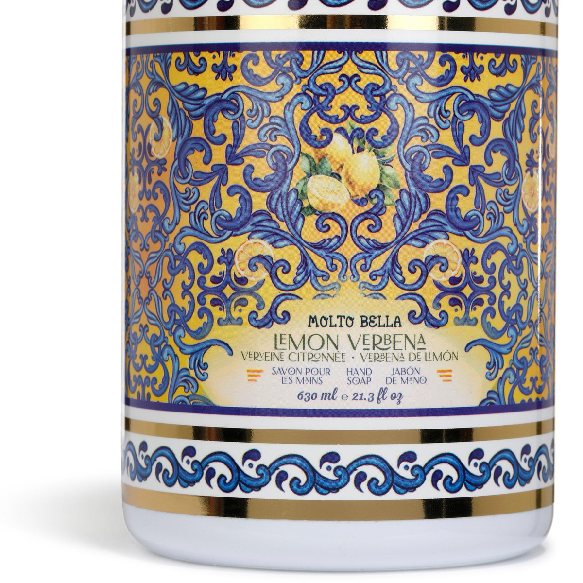 Elevate your handwashing routine with the luxurious Lemon Verbena Hand Soap. Encased in a stunning, art-inspired bottle, this hand soap blends beauty and functionality, making it a perfect addition to any kitchen or bathroom. Featuring an intricate, Mediterranean-inspired design, the beautifully crafted bottle adds a touch of sophistication and charm to any countertop or sink area. 21 FL. OZ.