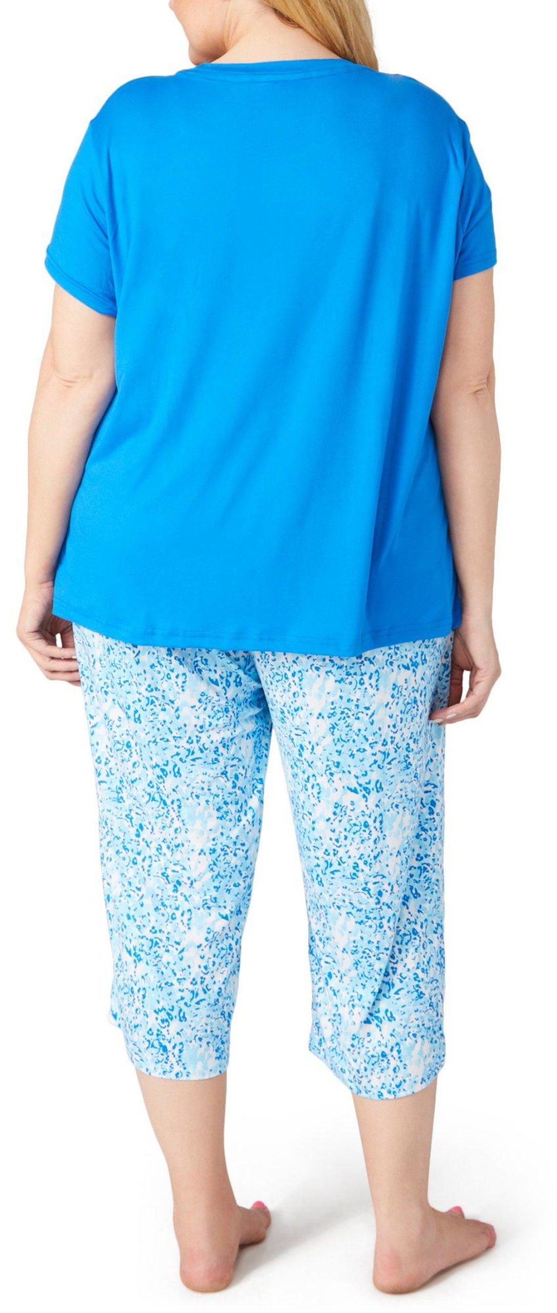 Introducing the Plus 2 Pc Capri Sleepwear Set, crafted from a comfortable blend of polyester and spandex. This set features a solid short sleeve top paired with leopard print capri pants, offering both style and ease. Perfect for lounging or sleeping, this set combines beauty and comfort, making it a delightful addition to your sleepwear collection.