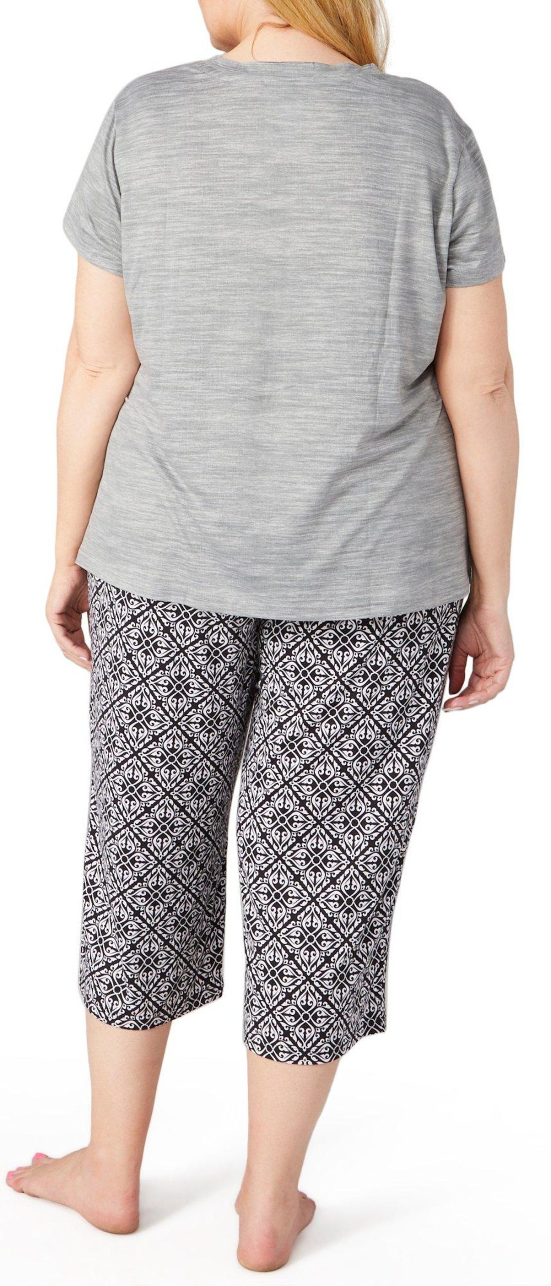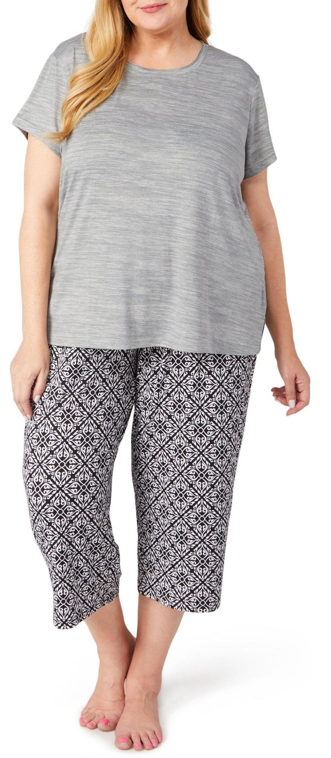 Introducing the Plus 2 Pc Capri Sleepwear Set, crafted from a comfortable blend of polyester and spandex. This set features a solid short sleeve top paired with print capri pants, offering both style and ease. Perfect for lounging or sleeping, this set combines beauty and comfort, making it a delightful addition to your sleepwear collection.