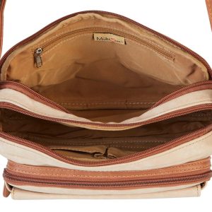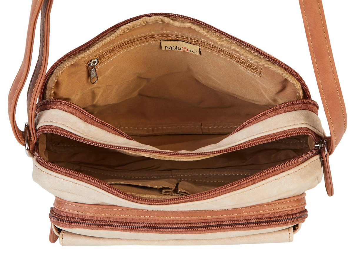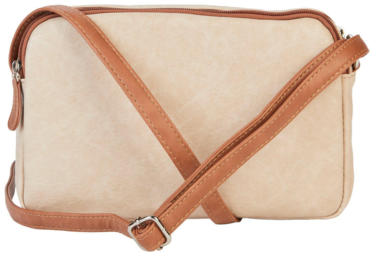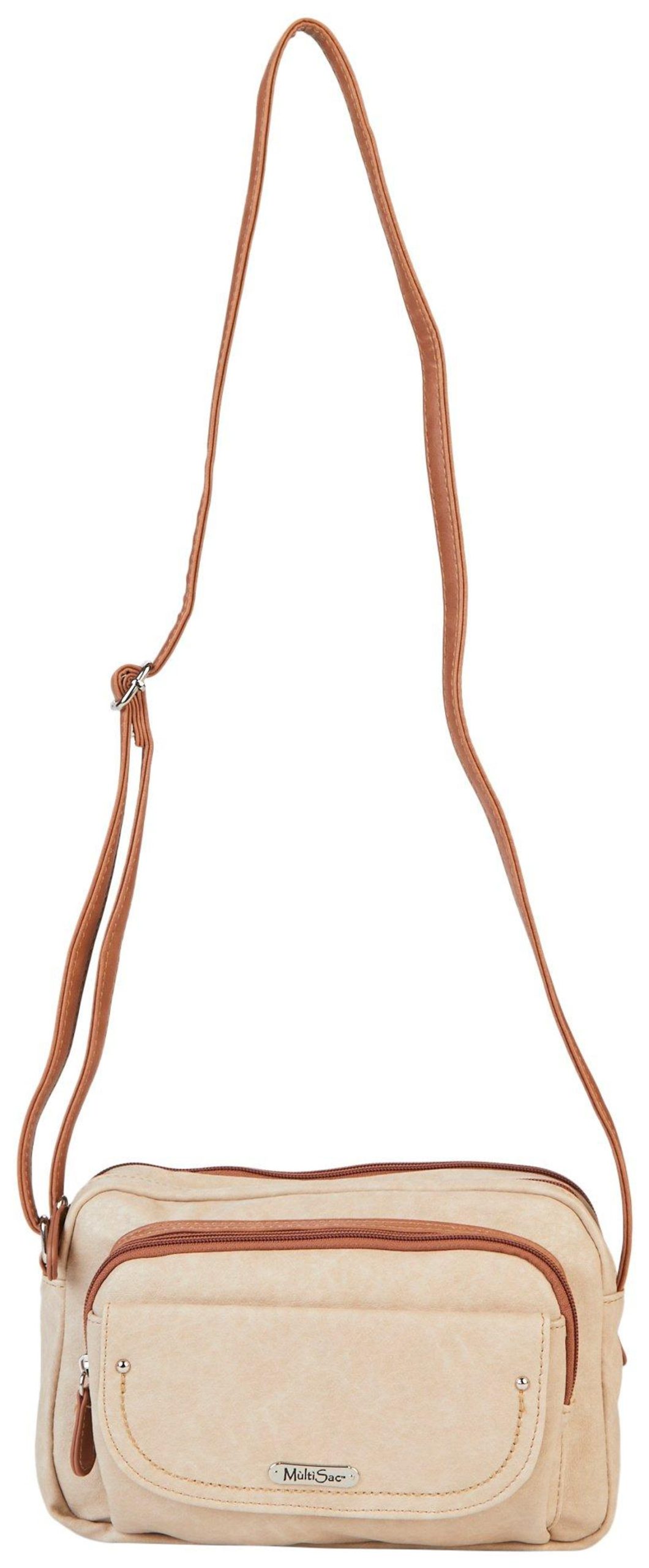 This bag encompasses everything you need! Three top zip compartments securely accommodate all your essentials, while the front flap pocket offers convenient storage for quick access. Features bronze tone metal, 100% vegan leather and polyester lining. Pockets: 1 Front Flap Pocket, 1 Front Zip Pocket, 1 Inside Zip Pocket, 2 Inside Slip Pockets. Measures 2.5 in. D x 7 in. H x 10 in. W with a 25 drop.