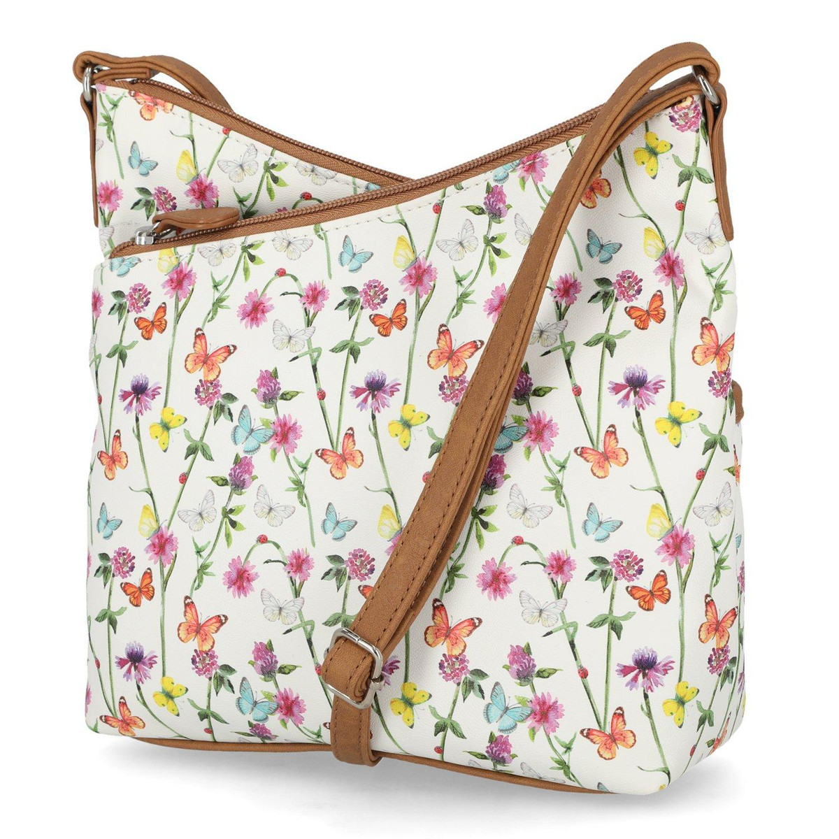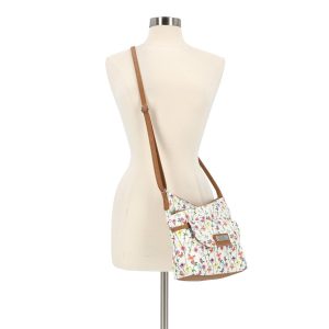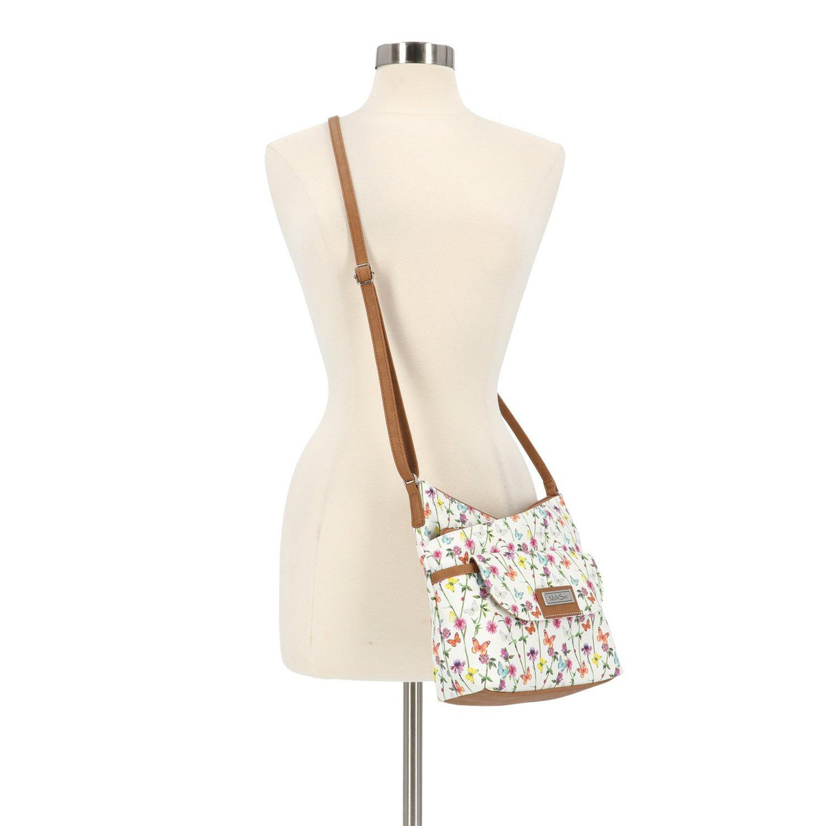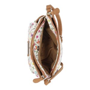 Step out in style this fall with the Vista Floral Crossbody bag from MultiSac! This bag features a vibrant floral design on vegan leather, an adjustable crossbody strap, one front exterior flap snap pocket, and dual asymmetrical top zip pockets with a central snap compartment. The lined interiors include one zip pocket and two slip pockets total. Measures approximately 8 in. L x 3 in. D x 9 in. H.