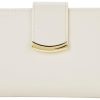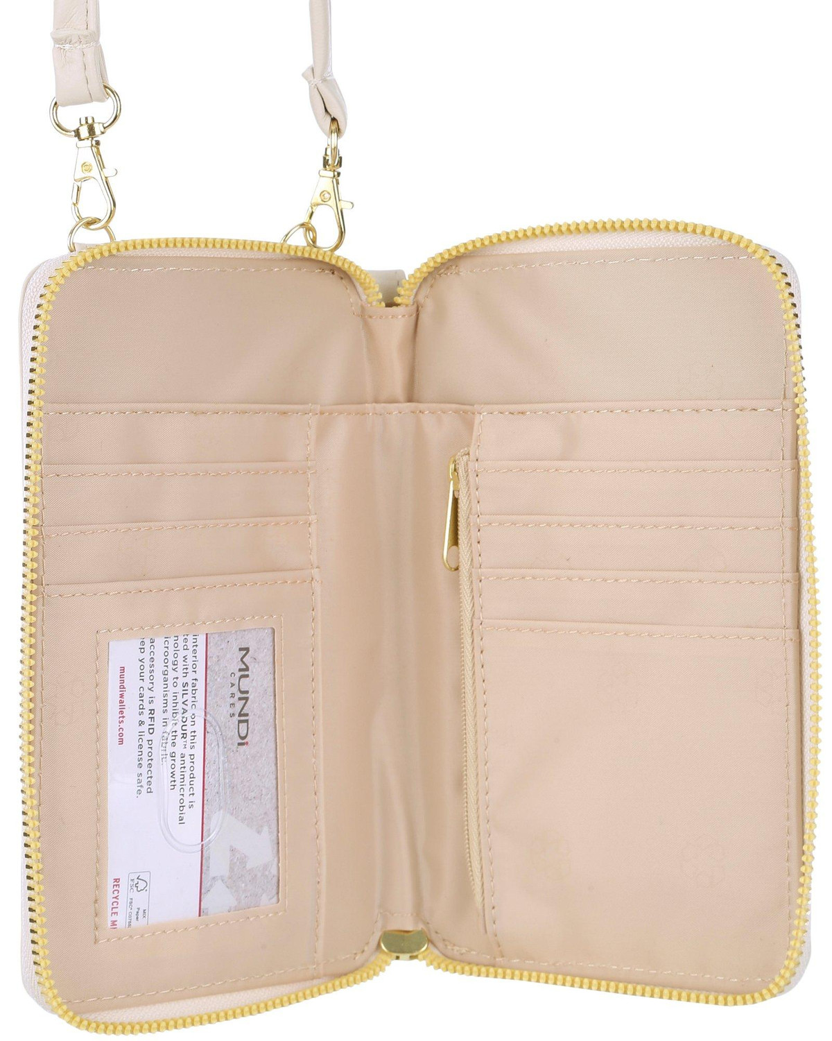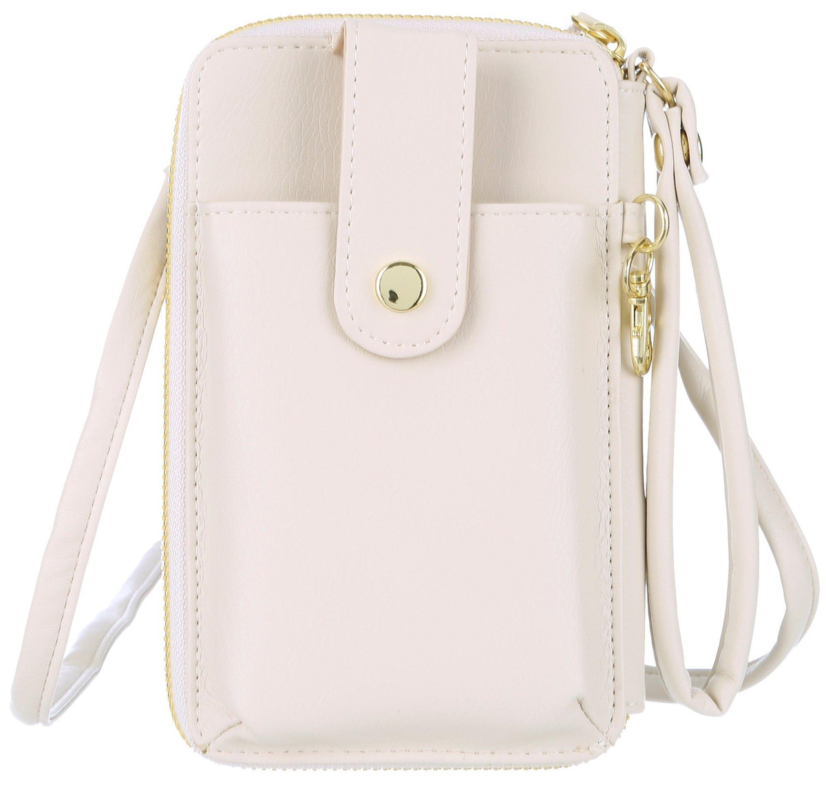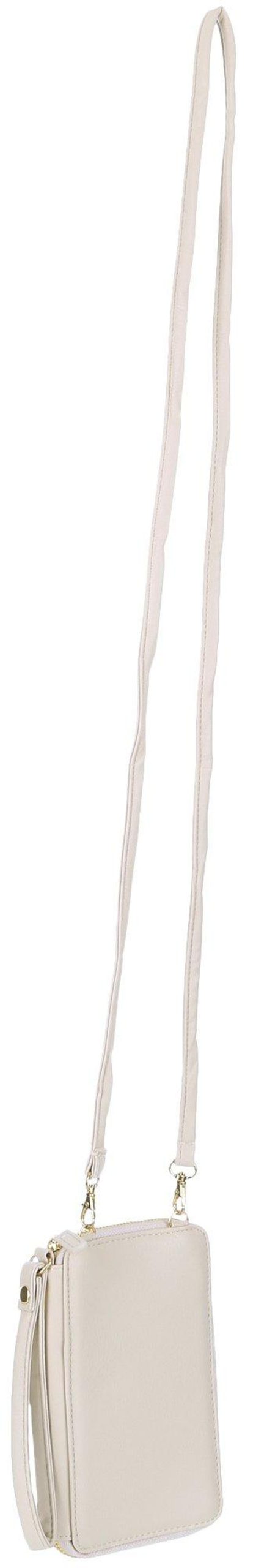 This bag features a solid color design on a smooth vegan leather fabrication, one exterior front snap cell pocket, a snap-on wristlet strap, a removable crossbody strap, and a zip-around closure. The lined interior contains one zipper pocket, two slip pockets, one ID window, and 6 credit card slots total. Measures approximately 4.5 in. L x 1 in. D x 7 in. H.