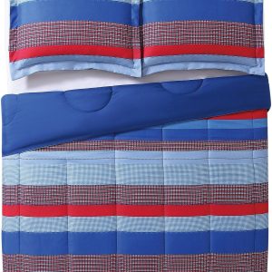 The Sebastian Stripe comforter by My World Kids features a patchwork stripe print in blues and reds. Set includes one comforter and two pillow shams (one twin).