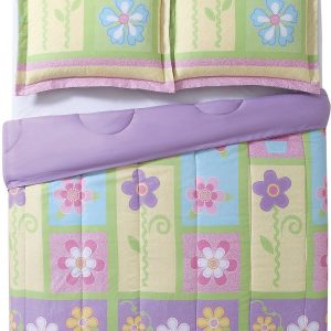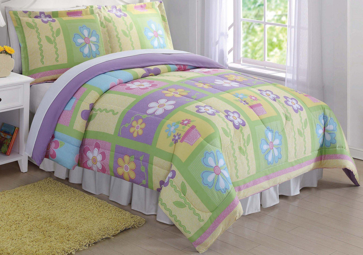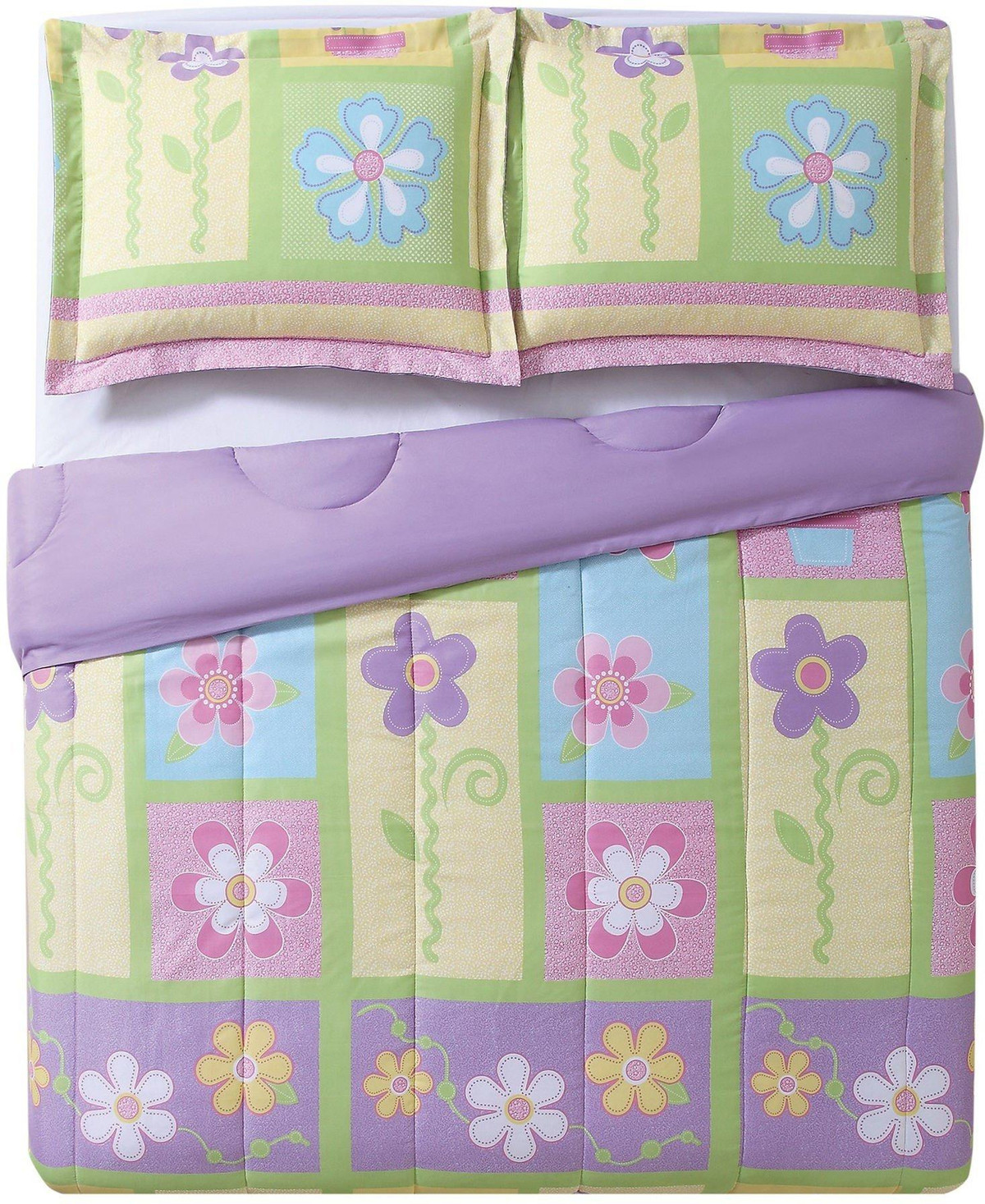 Sweet Helena Comforter features classic framed flowers in bright pink, purple, yellow, and green. Comforter reverses to a solid lavender color. Set includes one comforter and two pillow shams (one twin).
