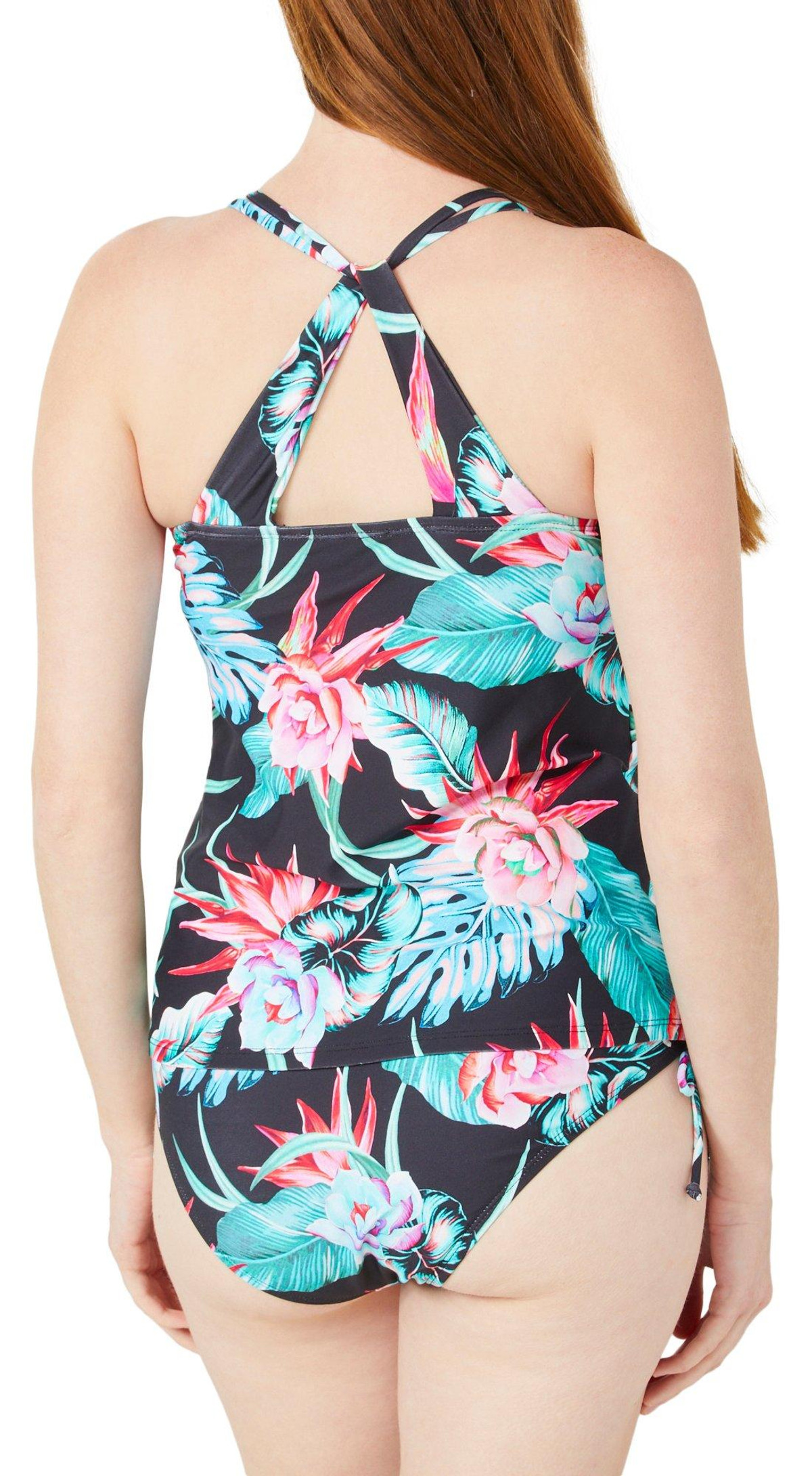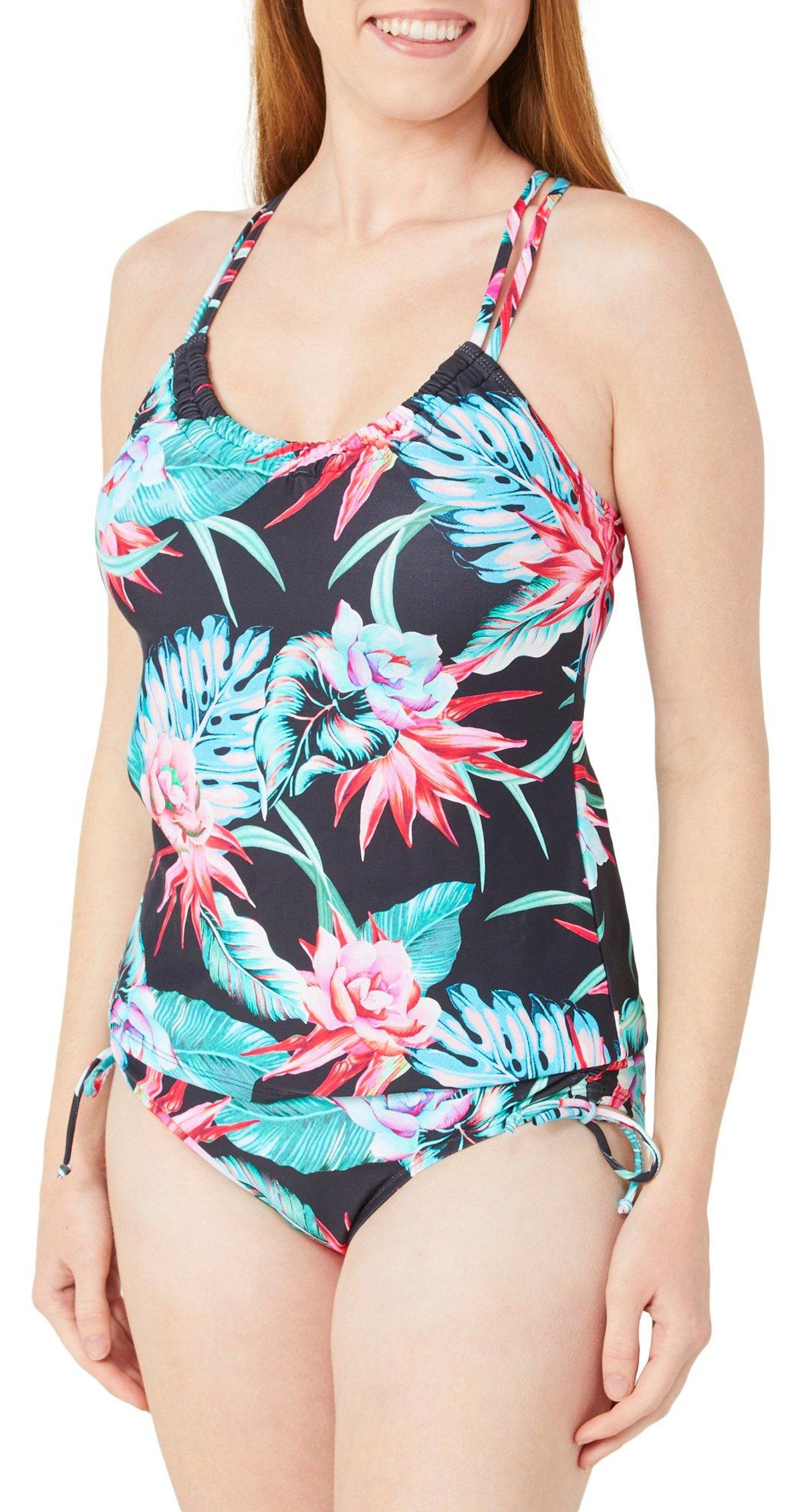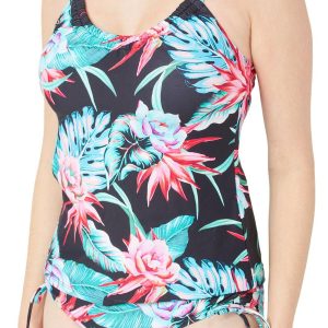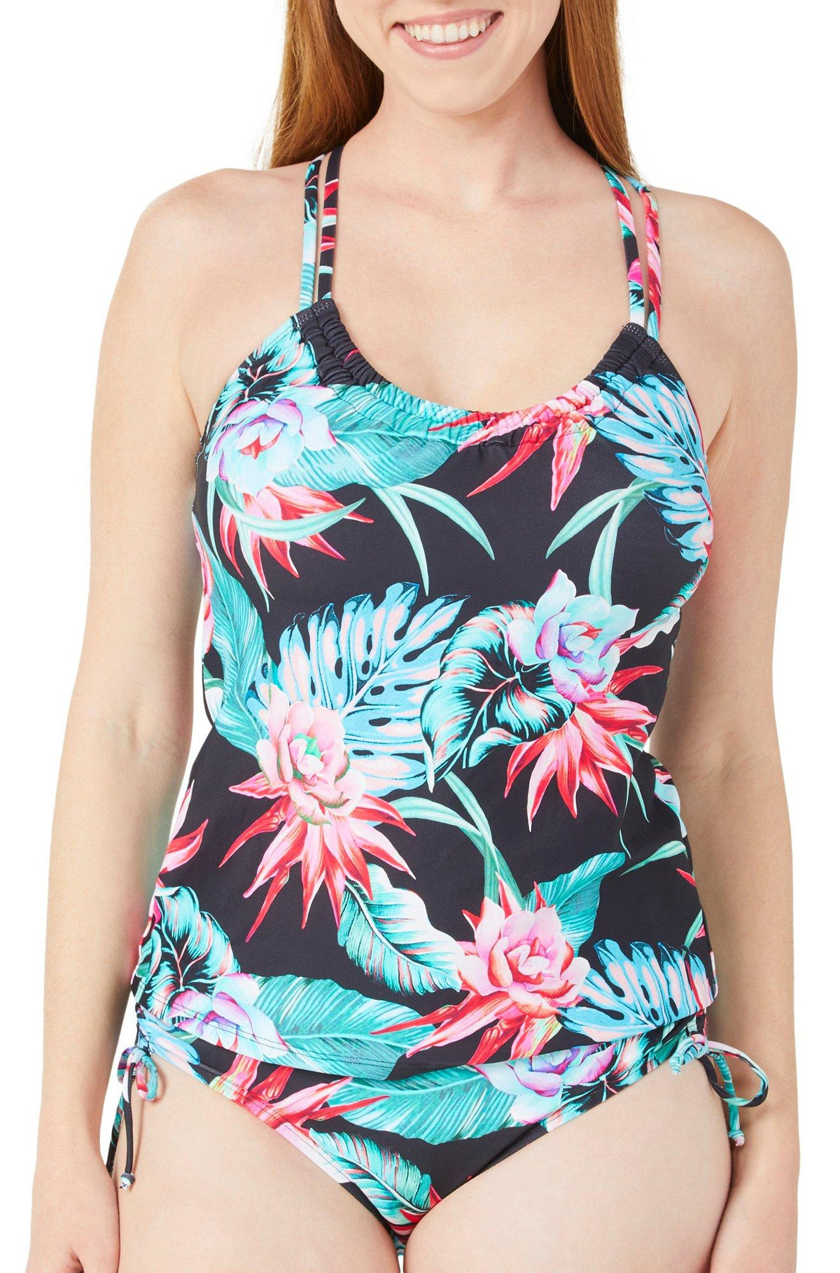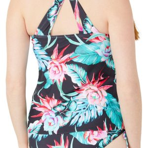 This womens Bloom tankini top is crafted from a soft polyester blend and features a tropical inspired print that captures the spirit of summer. Padded cups provide gentle support and shape, making it a comfortable and stylish choice for beach or poolside wear.