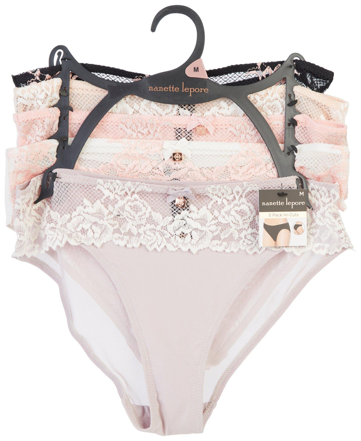 Nanette Lepore 5pk high cut lace underwear combines style with a smooth fit crafted from spandex, nylon and polyester. The delicate lace detailing adds charm while the stretchy design offers comfort and flexibility. With a flattering high cut silhouette, this piece blends elegance and everyday ease.