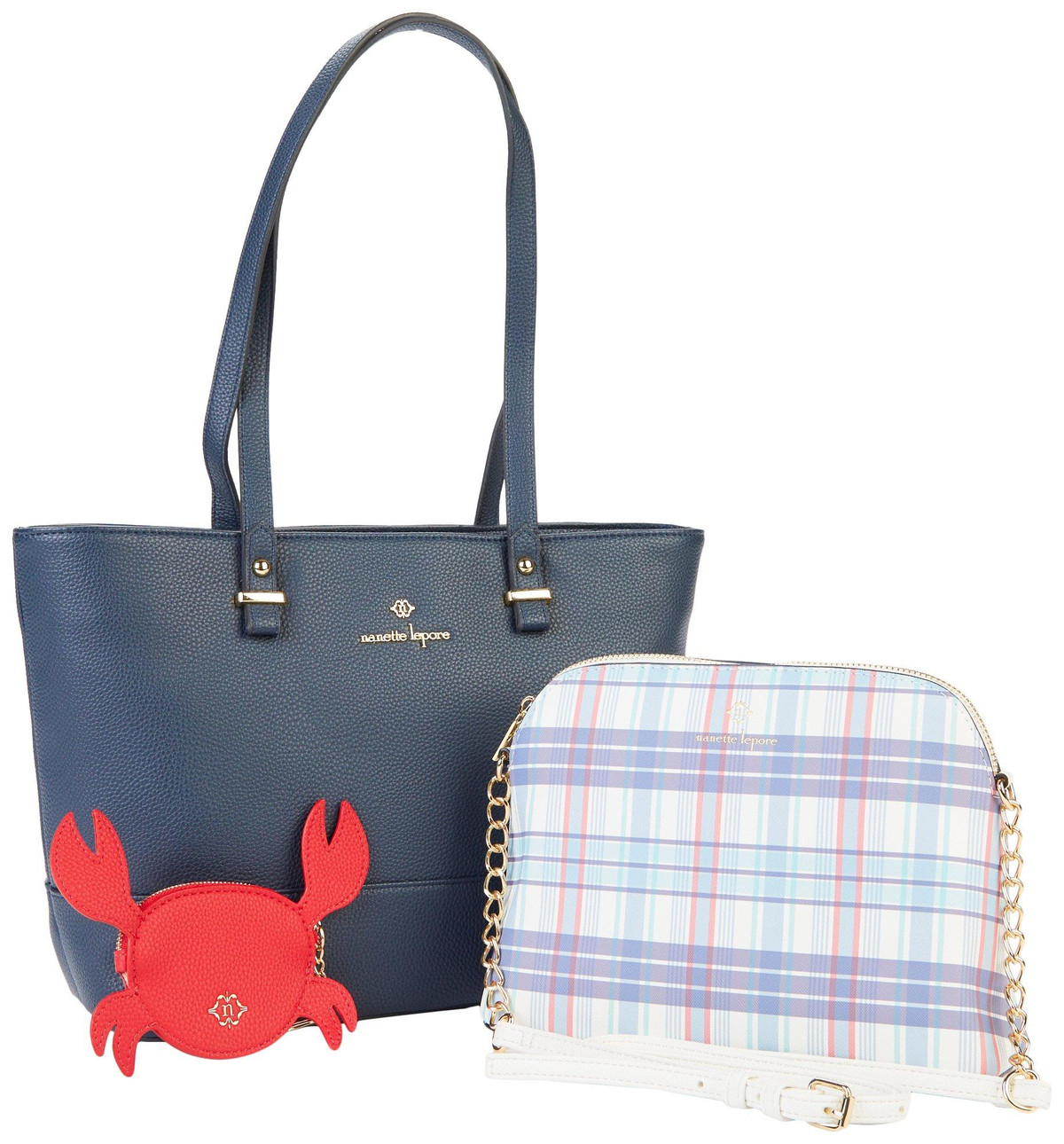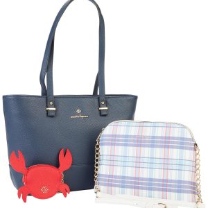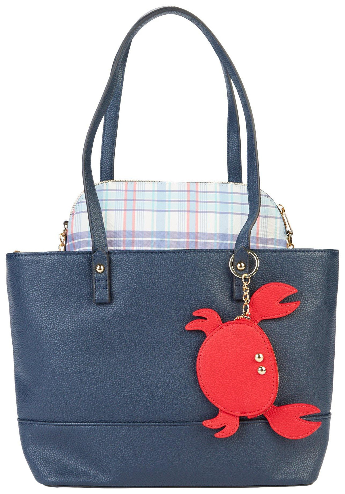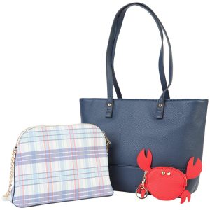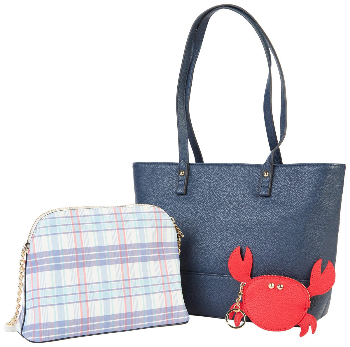 Chic and versatile, the 3 Pc Gillian Tote Bag Set includes a pebbled faux leather tote, a stylish plaid-print crossbody, and a playful crab-shaped coin purse. Perfect for mixing fashion with fun! Tote bag measures 13 x 4.5 x 10 in. Crossbody bag measures 10 x 4 x 7 in. Coin purse measures 6 x 5 in.
