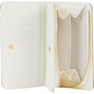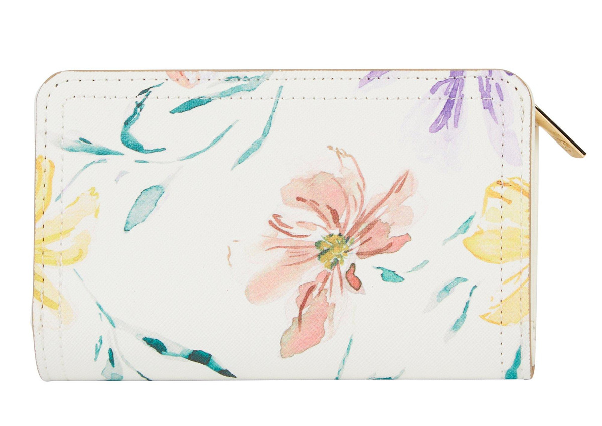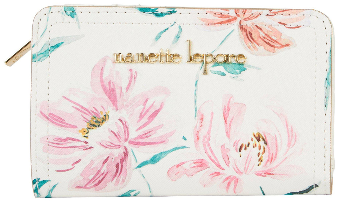This wallet features a floral print design, brand logo hardware accent, stitch trim, dual compartments. Measures 5.75 in x 3.5 in.