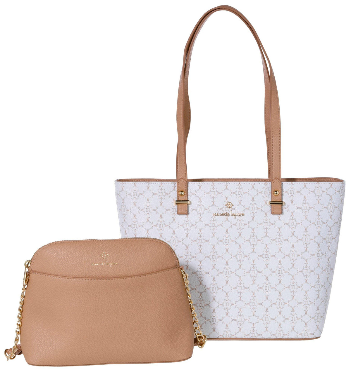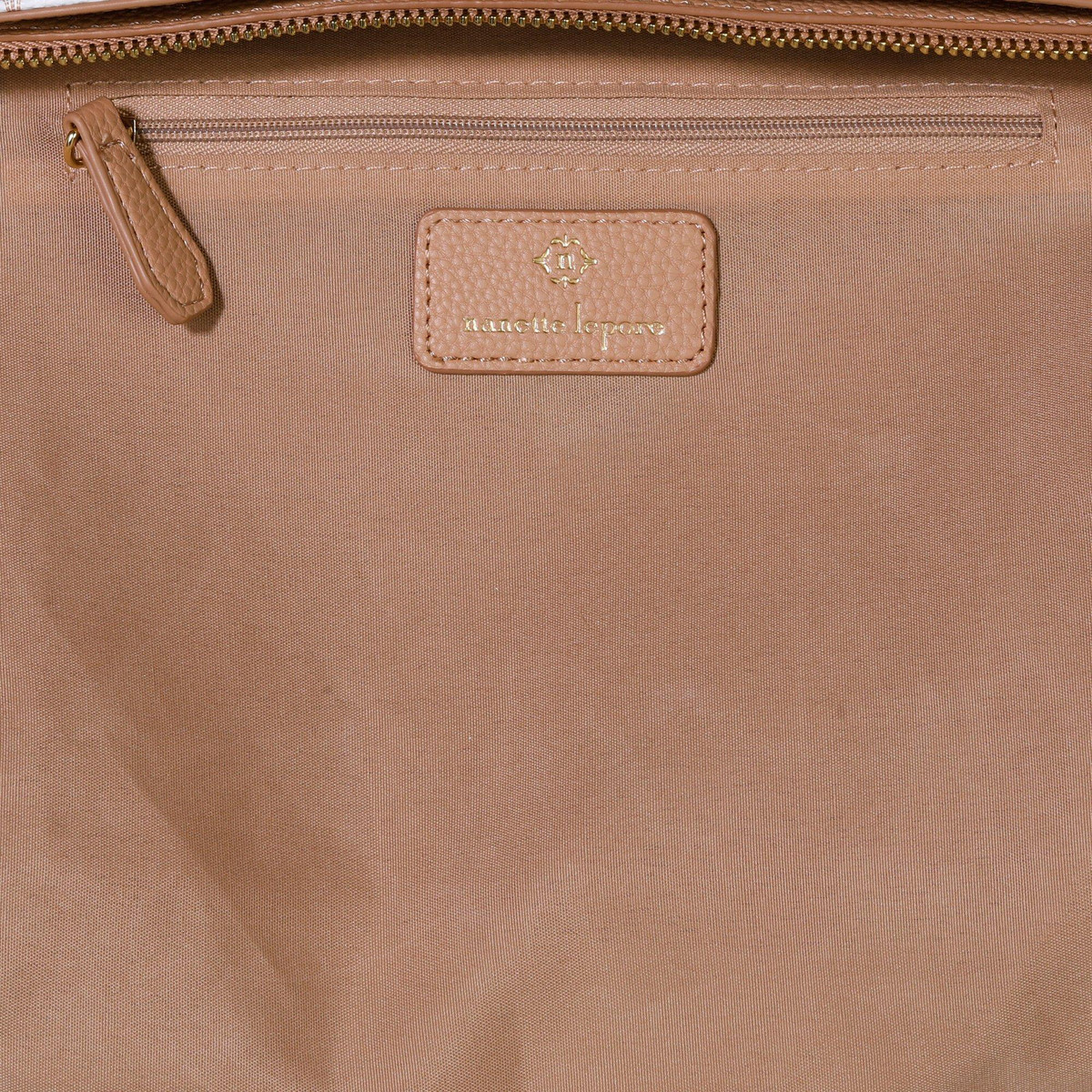 A structured tote bag comes with a separate pouch to ensure your belongings are well-organized and easy to reach. Includes tote and pouch. Tote: 10 in. H x 11 in. W x 4.5 in. D. Pouch: 7.5 in. H x 9.5 in. W x 3.5 in D. D