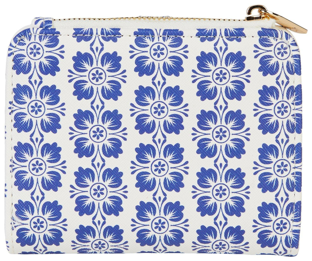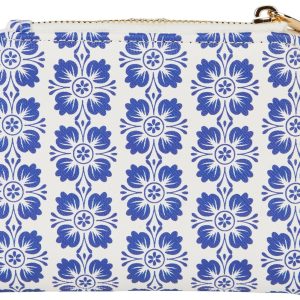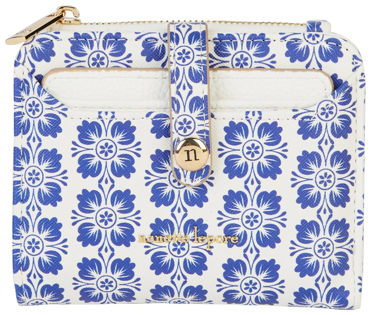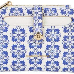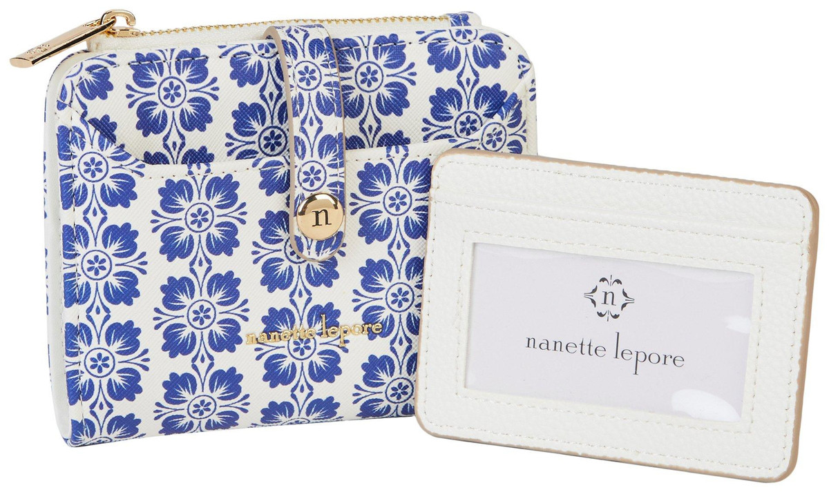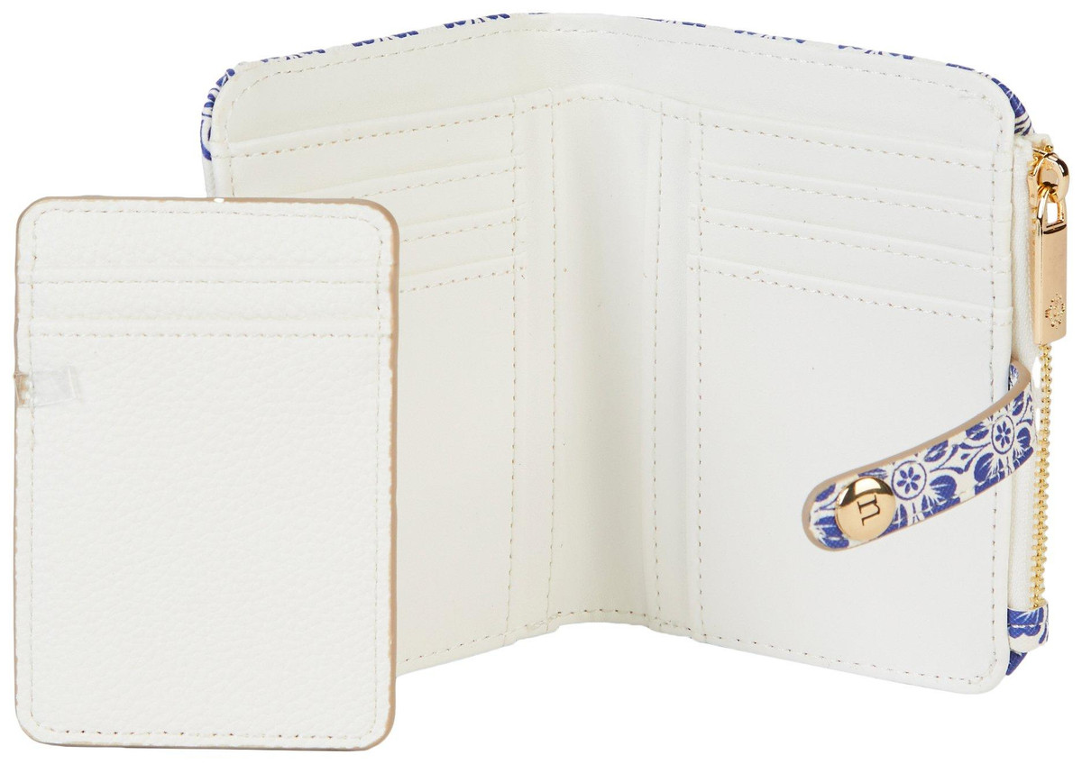 This Liza Bifold Wallet features a beautiful floral design on a textured vegan leather, a rear zipper coin pocket, a front security strap snap pocket, and a flip open compartment with six card slots, four slip pockets, and a currency compartment. Bonus coordinating print credit card and id case included. Measures approximately 5 in. L x 4 in. H.