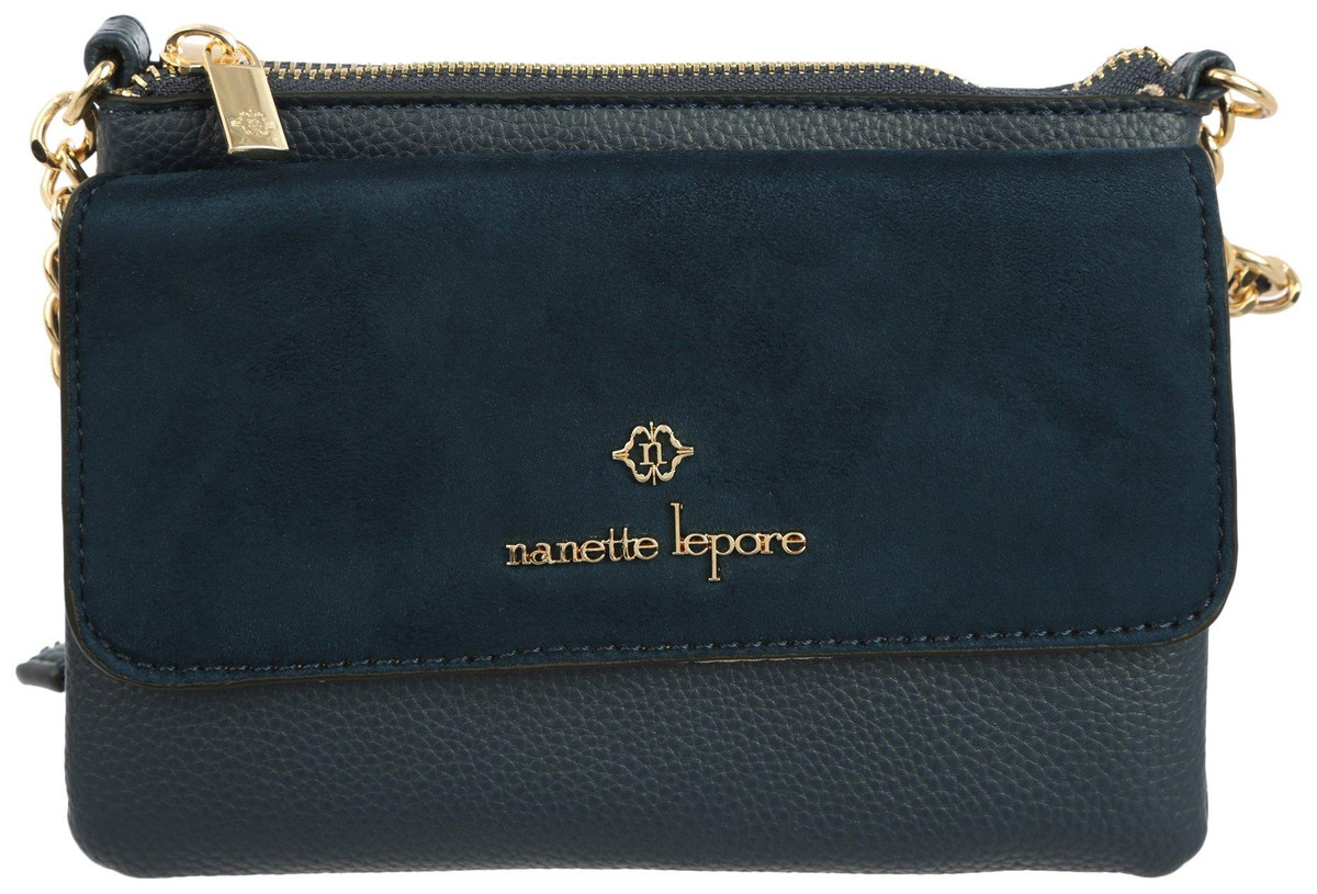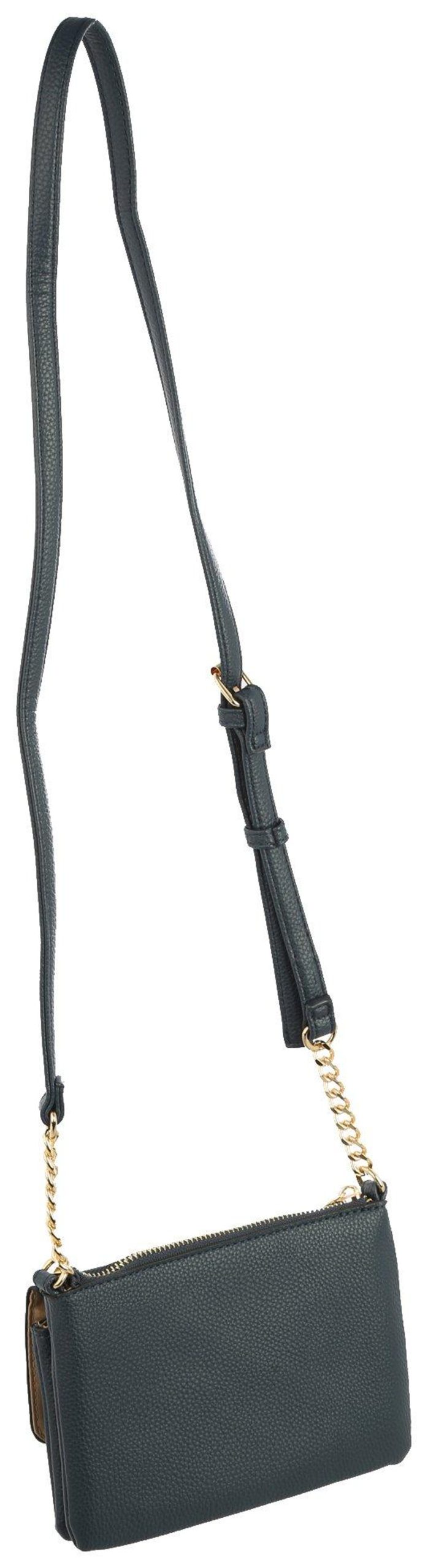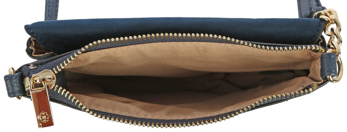 This Meadow Crossbody Mini Bag features a solid color design on a durable pebbled vegan leather fabrication, a front snap flap pouch pocket with two credit card slots, a narrow adjustable half-and-half crossbody chain and strap, a top zipper closure, and a lined interior. Measures approximately 7 in. L x 1 in. W x 5 in. H.