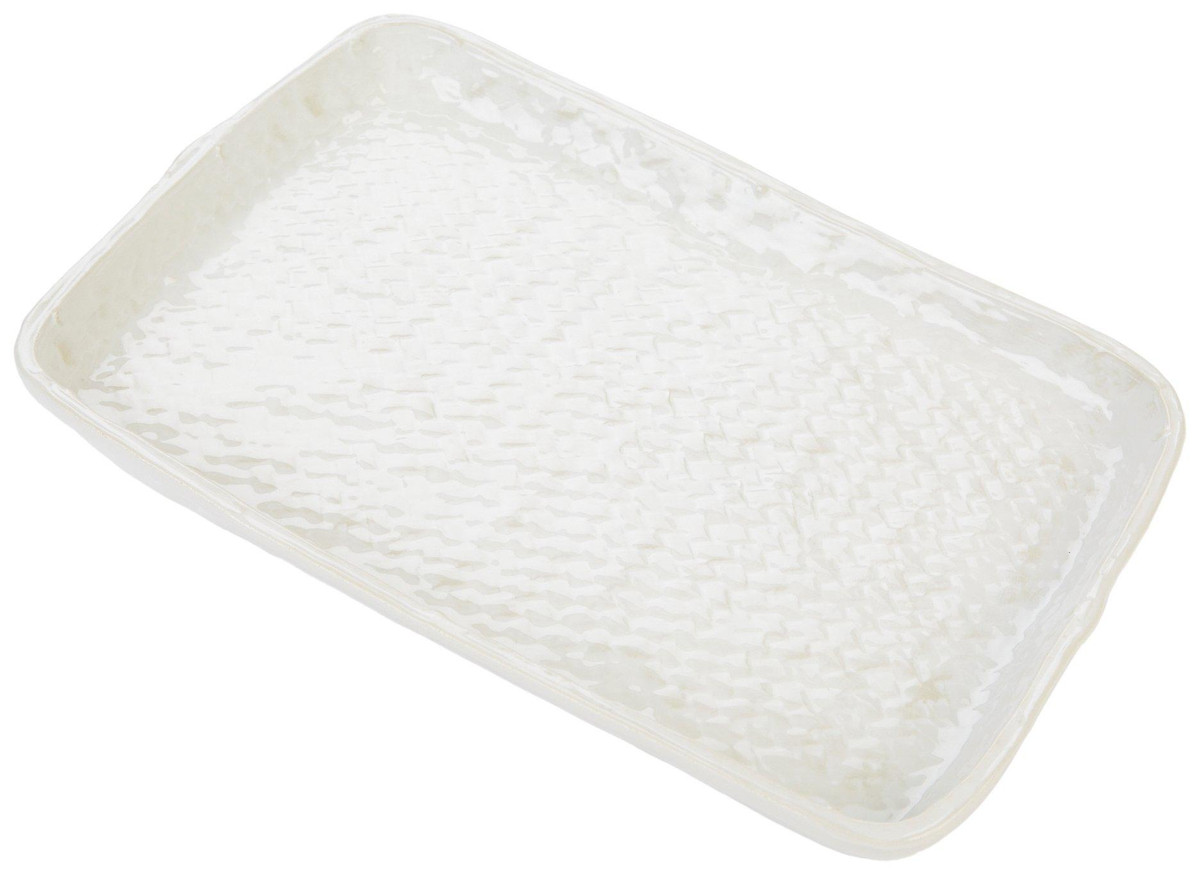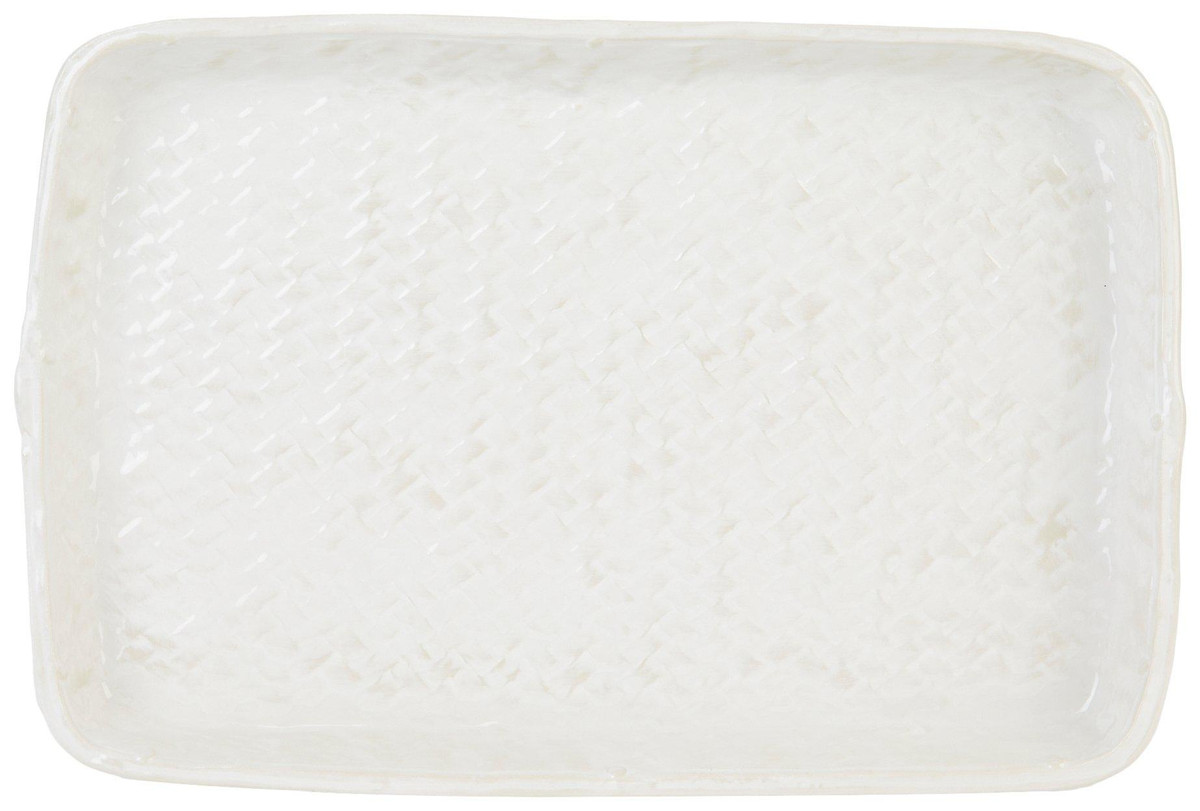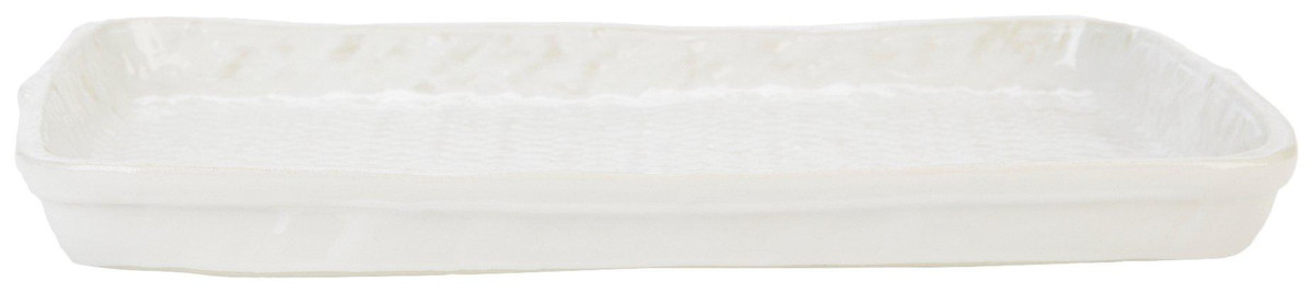 Complete your table with the Corinne Ceramic Serving Platter, designed to pair beautifully with the entire Corinne collection. Its rectangular shape and subtle woven texture in crisp white create an elegant backdrop for main courses, hors doeuvres or shared sides. Durable ceramic construction ensures lasting use, perfect for everyday dining or refined entertaining. Measures approximately 15 in x 10 in x 1.5 in.