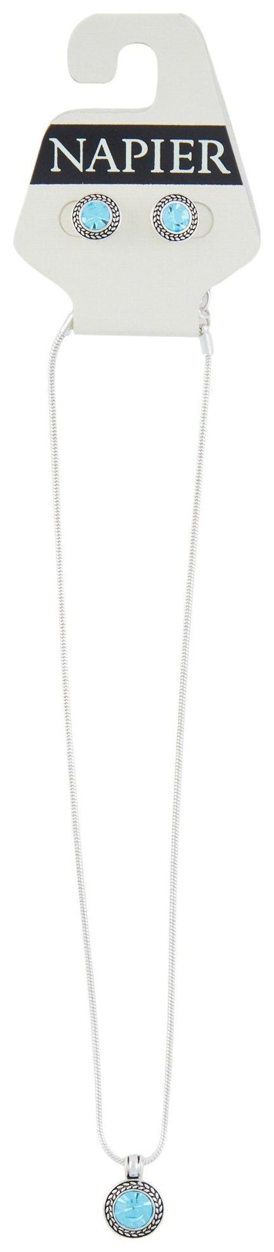 The 16-inch Pendant Necklace & Earrings Set features a stunning silver-tone necklace with a vibrant turquoise pendant, paired with matching stud earrings for a coordinated look. This elegant set adds a pop of color and sophistication to any outfit, perfect for both casual and formal occasions..