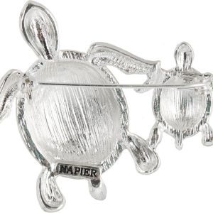The Napier Crystal Pave Dual Sea Turtle Pin is a beautifully designed brooch featuring two sea turtles adorned with sparkling crystal pave accents. The turtles are intricately detailed, with shimmering crystals that catch the light, creating a stunning, eye-catching effect. This elegant piece combines nature-inspired design with a touch of glamour, making it a perfect accessory for ocean lovers or anyone seeking a unique and sophisticated brooch to elevate their ensemble.