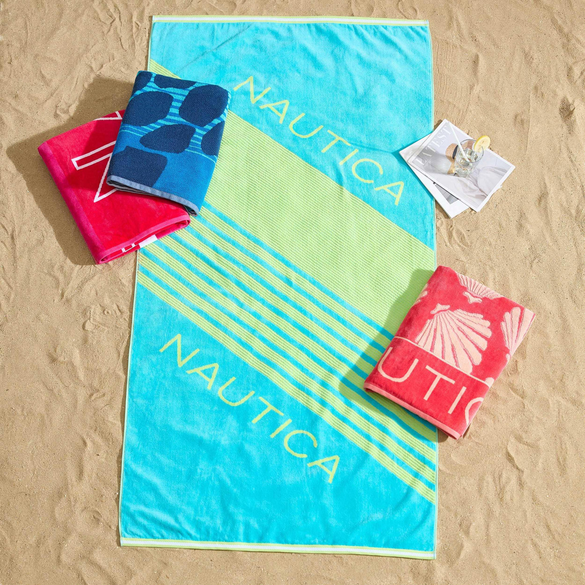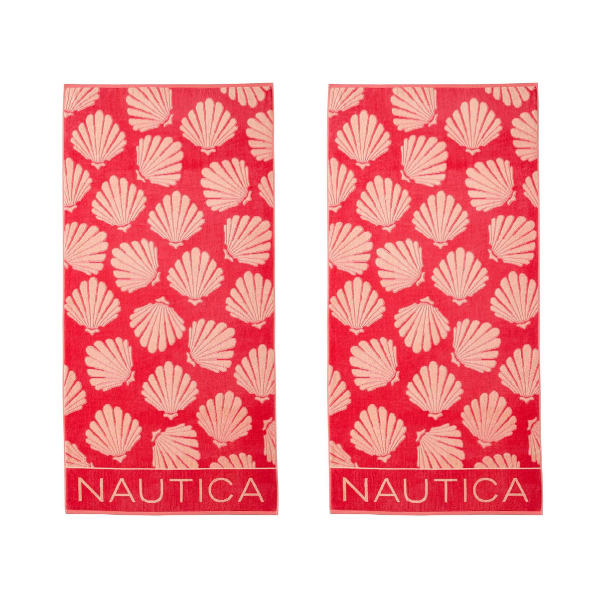Elevate your pool or beachside style with the Nautica Seashell Seashore 2-piece towel set. Showcasing vibrant coral seashells on a soft peach background, this set features Nautical charm. They bring a lively splash of style, ensuring you stand out with effortless coastal flair. Made with non-toxic dyes and are oeko-tex standard 100 certified for quality and safety. Includes two matching beach towels, complete with a branded locker loop for added convenience. Each measure 68 in. x 36 in.