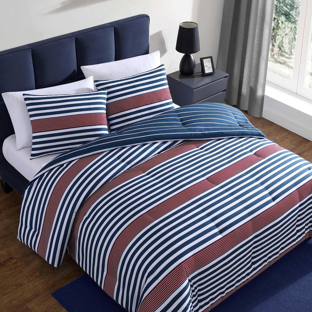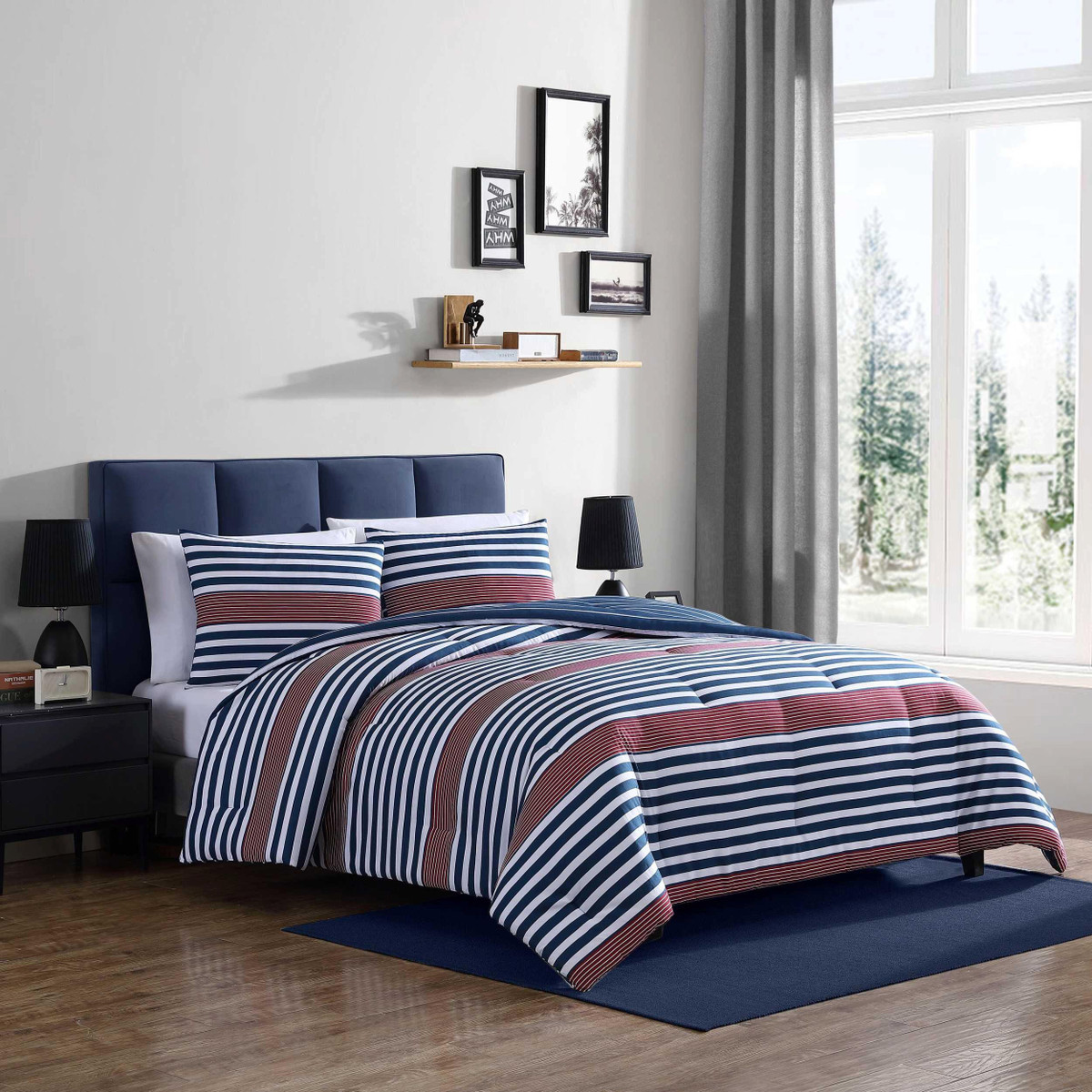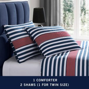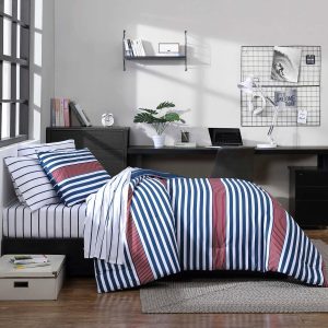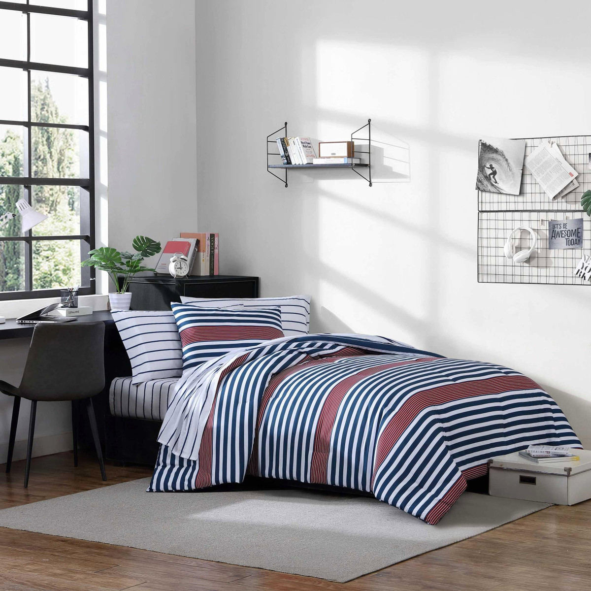 Start the school year in style with Nauticas striped comforter and sham set. Featuring bold navy, red, and white horizontal stripes, this durable bedding adds a classic touch to any dorm or bedroom. Made with soft microfiber and 100% polyester fill for year-round comfort, its machine washable and easy to maintain. Perfect for busy students.