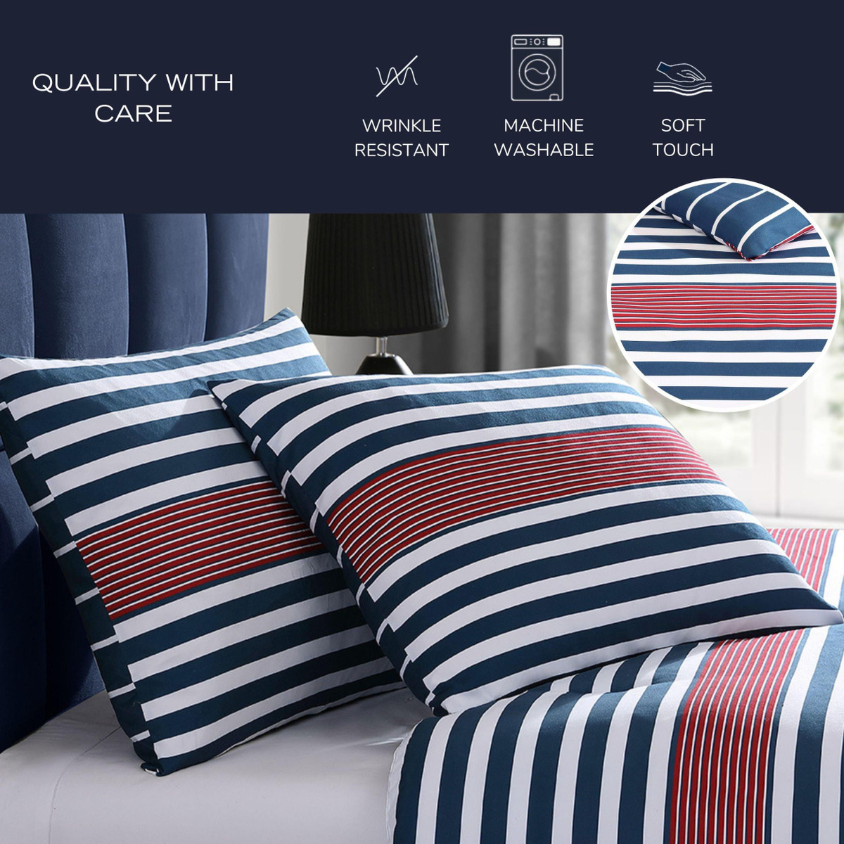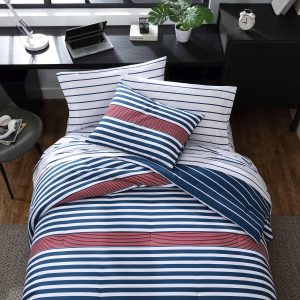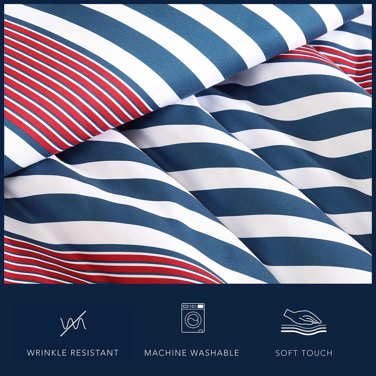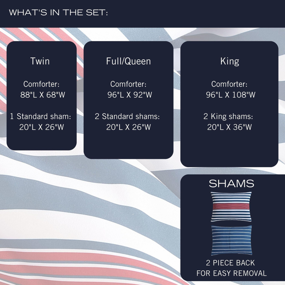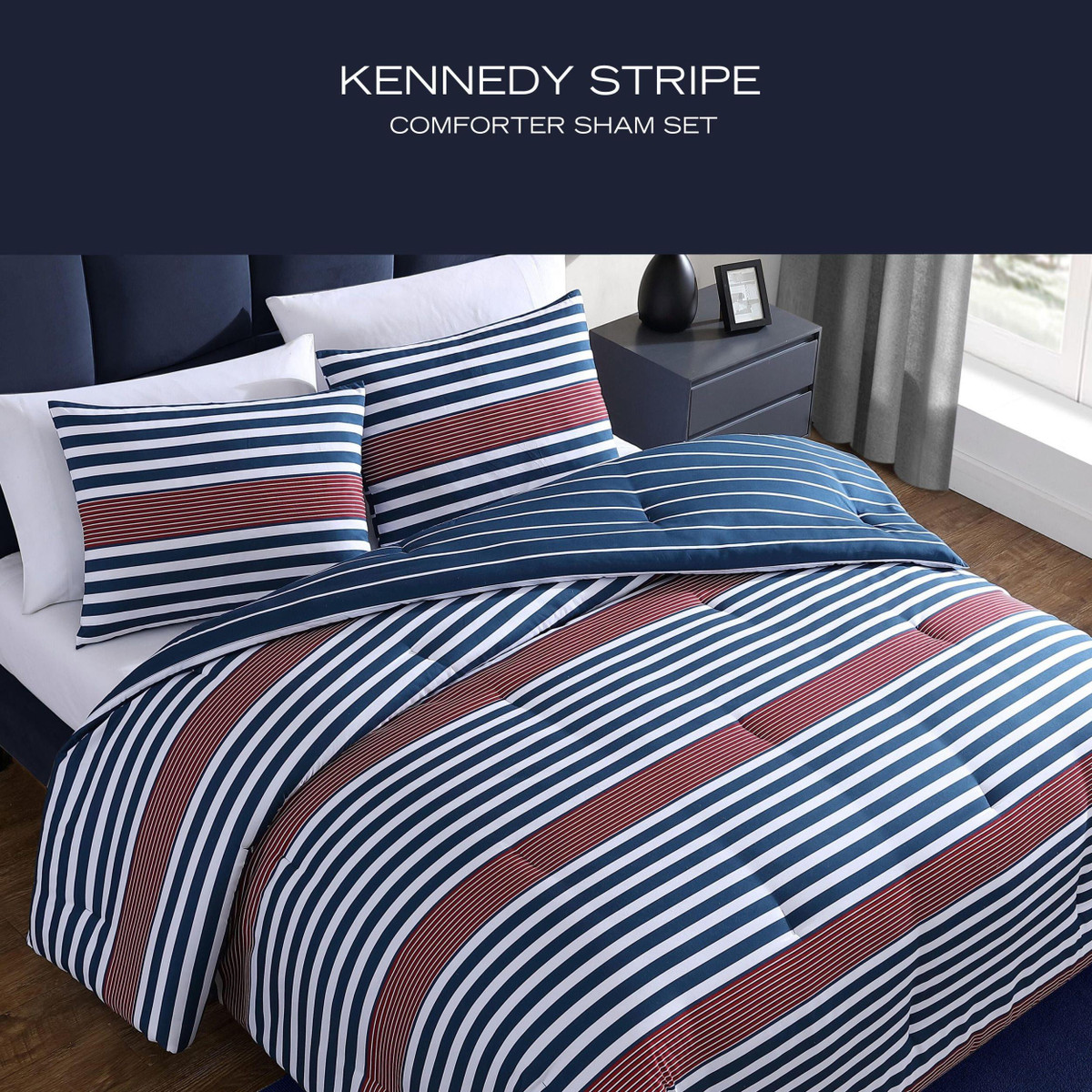 Start the school year in style with Nauticas striped comforter and sham set. Featuring bold navy, red, and white horizontal stripes, this durable bedding adds a classic touch to any dorm or bedroom. Made with soft microfiber and 100% polyester fill for year-round comfort, its machine washable and easy to maintain. Perfect for busy students.