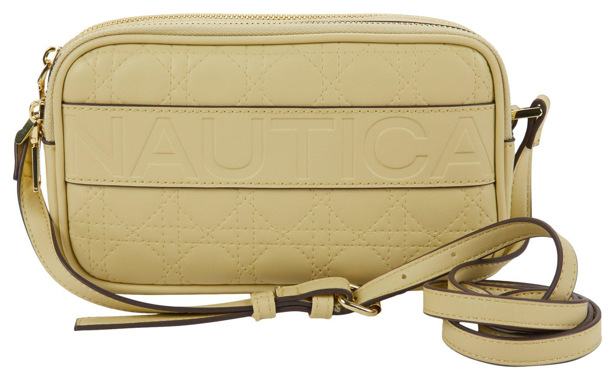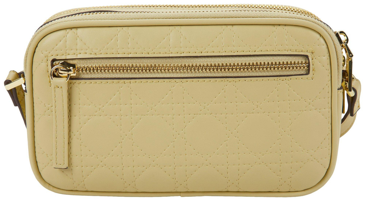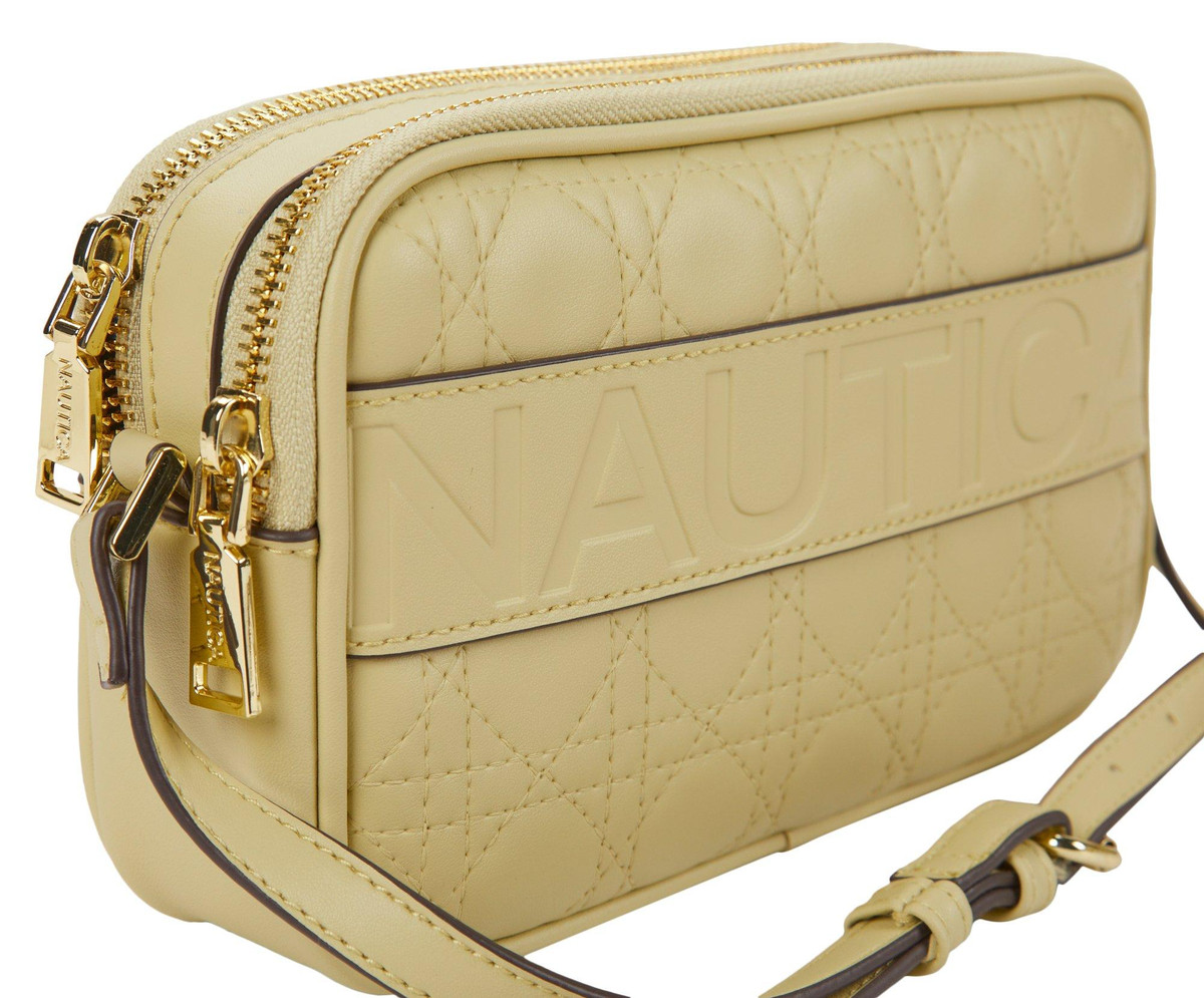 Introducing the Lattice Quilt Camera Crossbody Bag, featuring a chic faux leather exterior and gold-tone hardware. This stylish bag includes a double top zip compartment for secure storage, an adjustable crossbody strap for a perfect fit, and an exterior zip pocket for easy access to essentials. Measuring 8 inches by 2 inches by 5 inches, it combines elegance and functionality, making it an ideal accessory for any occasion.