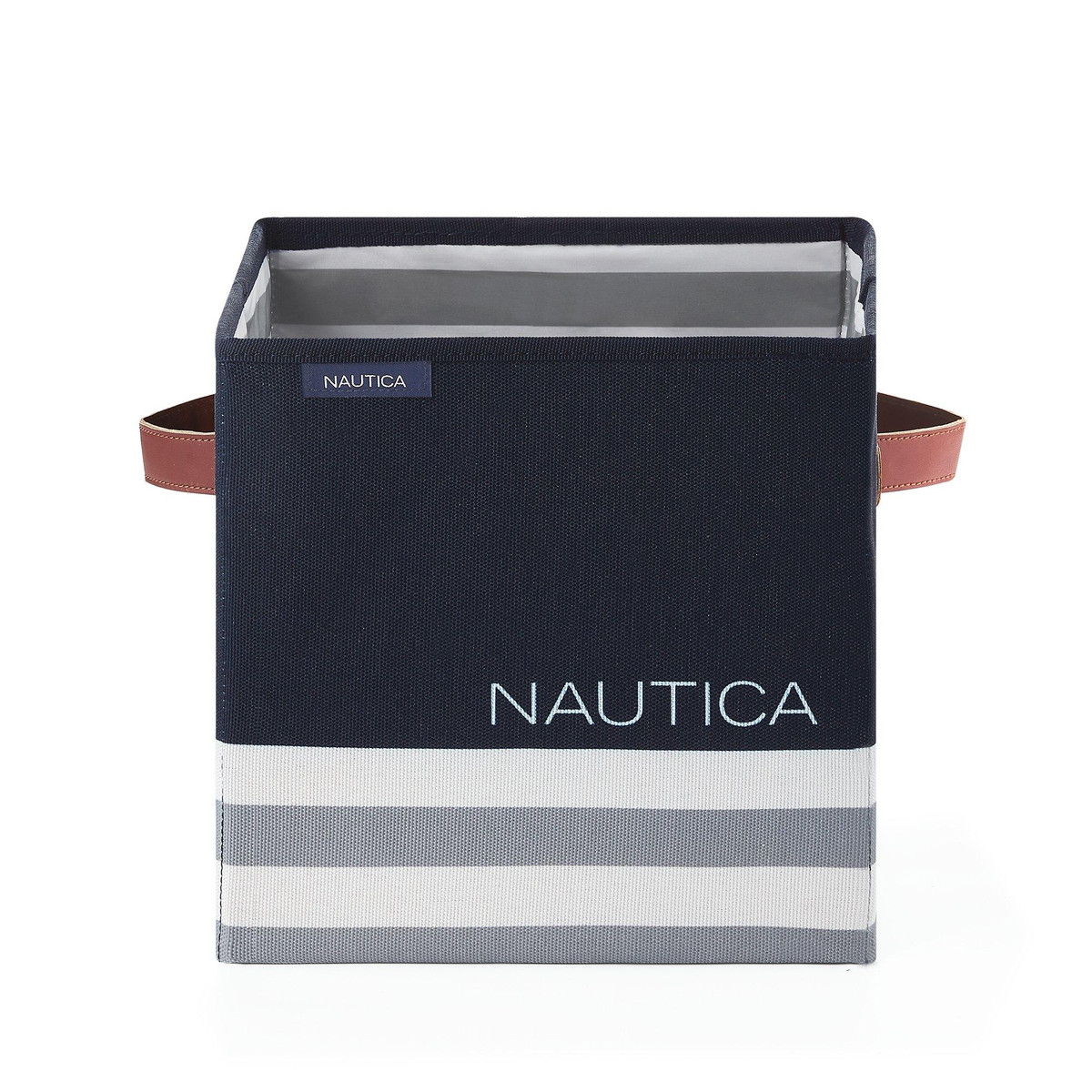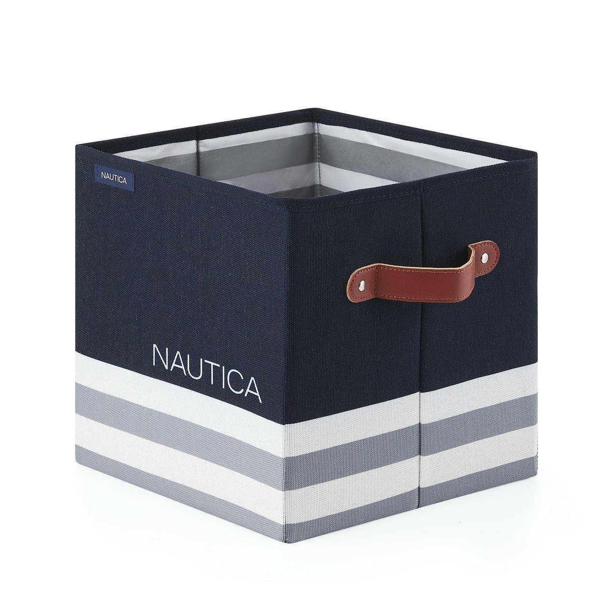 This Nautica foldable storage cube is the perfect solution to fashionably elevate your space. This Nautica branded cube comes in a timeless grey and navy stripe design which will blend in seamlessly to almost any décor. The durable handles make it easy to transport throughout the home, while the convenient collapsible design makes it easy to store when not in use. Easy to clean. Measures 10 in. x 10 in. x 10 in.