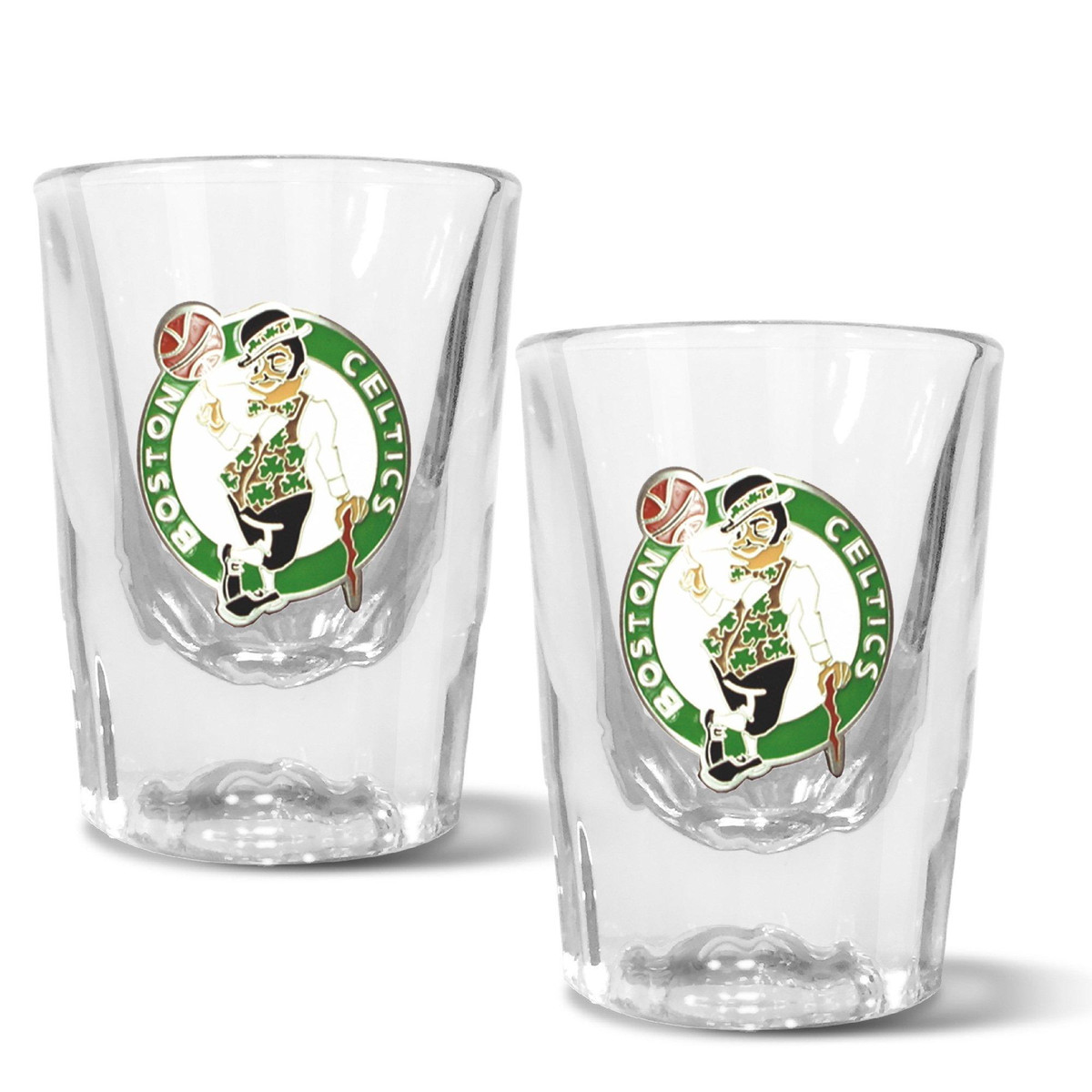 Show your team spirit tailgating with these NBA Boston Celtics Set of 2 2 Oz. Prism Shot Glasses. The set includes two 2-oz shot glasses. In addition to the high-quality metal emblem, the Prism shot glass features an elegant cut at the base. Each measures 2.25” x 2.25” x 3.”