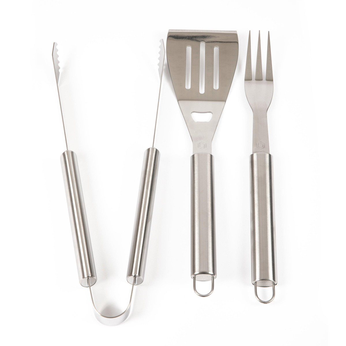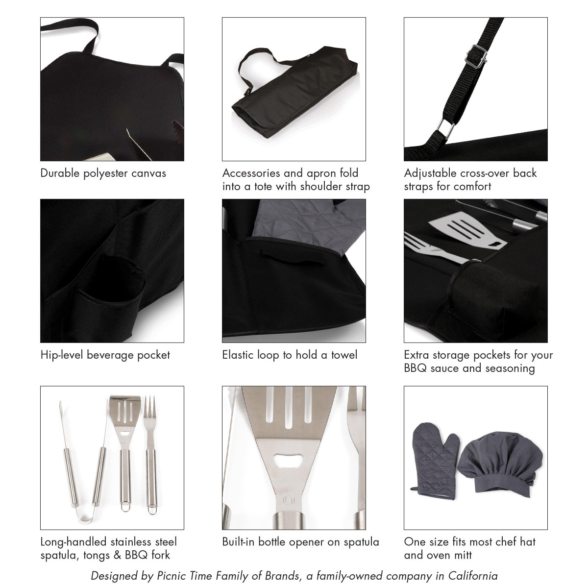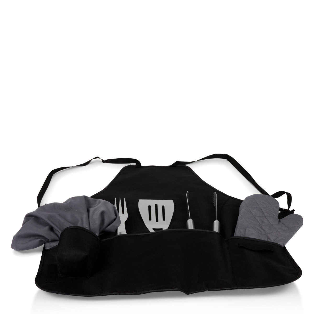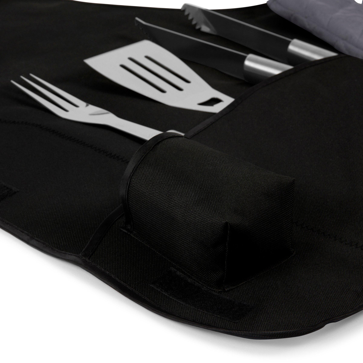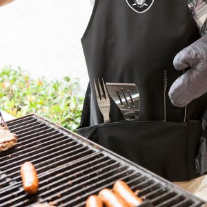 This Las Vegas Raiders 6 pc.barbecue set and apron conveniently folds into an easy-to-carry tote complete with an adjustable shoulder strap. It includes a polyester canvas full-size apron with adjustable criss-cross back straps and pockets for grilling accessories, a dark grey chef’s hat, one stainless steel barbecue spatula with an integrated bottle opener, one stainless steel barbecue fork, and one stainless steel set of tongs.